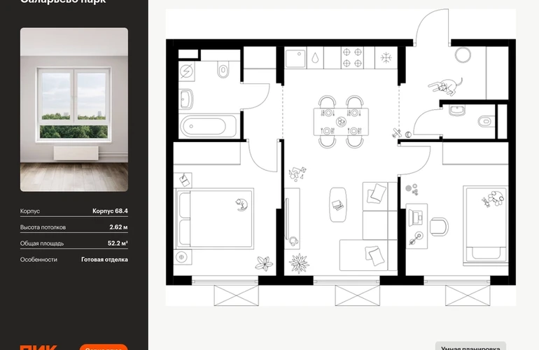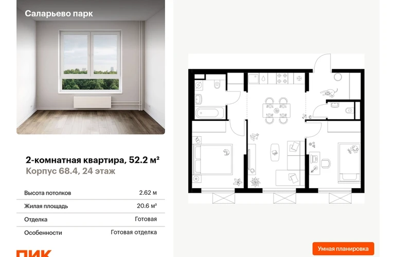 Продаётся 2-комн.квартира площадью 52.20 кв.м на 24 этаже 24 этажного дома (Корпус 68.4, секция 1) проекта ПИК Саларьево парк. Светлый просторный подъезд на уровне земли, функциональная планировка, большие окна, с отделкой. <br> <br>Жилой район «Саларьево парк» расположен в Новой Москве, в четырёх километрах от МКАД по Киевскому шоссе. Две станции метро: «Саларьево» и «Филатов луг» — находятся в пешей доступности от проекта. Дойти до них можно за 5–10 минут. В квартале уже создана качественная среда, где есть абсолютно всё для полноценной жизни, работы и отдыха. <br> <br>«Саларьево парк» — не просто квартал, а полноценный жилой район, который отличается разноплановой архитектурой. Над концепцией квартала работали несколько ведущих архитектурных бюро, которые стремились добиться разнообразия в фасадных решениях. Ярким примером такого подхода станет корпус 83, который относится к «Серии плюс». <br> <br>Новый корпус 83 был создан по принципам южной архитектуры: расслабленный и лаконичный силуэт зданий, привлекающий к себе внимание. Архитектурная изюминка 83-го корпуса — террасы и фигурные балконы. Вместе с окнами и другими акцентными элементами они создают уникальный облик здания, отсылая нас к изысканной южной архитектуре. <br> <br>Все корпуса в квартале гармонично сочетаются, образуя единую городскую среду. Здесь приятно гулять и проводить время на улице всей семьёй. <br> <br>В «Саларьево парке» создана уникальная образовательная среда, включающая в себя шесть школ, рассчитанных на 6 250 учеников. Две из них уже открыты, их посещает 2 300 детей. Также на территории «Саларьево парка» находится 12 детских садов, один из которых с бассейном. Сейчас уже открыты 7 садов. <br> <br>В «Саларьево парке» открыта уникальная игровая площадка — PlayHub «Оригами». Здесь есть ручей, горка-труба и рельефные холмы. Взрослые смогут отдохнуть в уютном кафе, пока дети играют. Также на территории проекта есть SportHub — большая спортивная зона, разделённая по интересам и возрастам. Здесь можно заниматься разными видами спорта: футболом, баскетболом, волейболом и стритболом. Зимой центральную часть площадки превращают в каток. <br> <br>Во дворах-парках жилого квартала есть места для отдыха, детские и спортивные площадки. На первых этажах домов расположены магазины, кафе и полезные сервисы. Также вблизи проекта есть несколько масштабных торговых центров. До ТЦ «Саларис» пять минут пешком, до «Рио», Metro Cash & Carry и «Лемана про» — пять минут на автомобиле. Артикул - 867823О застройщике