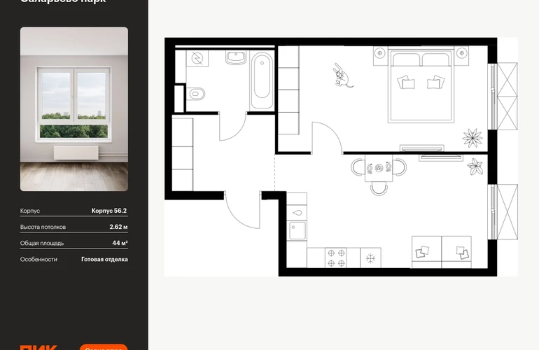 Продаётся 1-комн.квартира площадью 44.00 кв.м на 14 этаже 22 этажного дома (Корпус 56.2 , секция 1) проекта ПИК Саларьево парк. Светлый просторный подъезд на уровне земли, функциональная планировка, большие окна, с отделкой. <br> <br>Жилой район «Саларьево парк» расположен в Новой Москве, в четырёх километрах от МКАД по Киевскому шоссе. Две станции метро: «Саларьево» и «Филатов луг» — находятся в пешей доступности от проекта. Дойти до них можно за 5–10 минут. В квартале уже создана качественная среда, где есть абсолютно всё для полноценной жизни, работы и отдыха. <br> <br>«Саларьево парк» — не просто квартал, а полноценный жилой район, который отличается разноплановой архитектурой. Над концепцией квартала работали несколько ведущих архитектурных бюро, которые стремились добиться разнообразия в фасадных решениях. Ярким примером такого подхода станет корпус 83, который относится к «Серии плюс». <br> <br>Новый корпус 83 был создан по принципам южной архитектуры: расслабленный и лаконичный силуэт зданий, привлекающий к себе внимание. Архитектурная изюминка 83-го корпуса — террасы и фигурные балконы. Вместе с окнами и другими акцентными элементами они создают уникальный облик здания, отсылая нас к изысканной южной архитектуре. <br> <br>Все корпуса в квартале гармонично сочетаются, образуя единую городскую среду. Здесь приятно гулять и проводить время на улице всей семьёй. <br> <br>В «Саларьево парке» создана уникальная образовательная среда, включающая в себя шесть школ, рассчитанных на 6 250 учеников. Две из них уже открыты, их посещает 2 300 детей. Также на территории «Саларьево парка» находится 12 детских садов, один из которых с бассейном. Сейчас уже открыты 7 садов. <br> <br>В «Саларьево парке» открыта уникальная игровая площадка — PlayHub «Оригами». Здесь есть ручей, горка-труба и рельефные холмы. Взрослые смогут отдохнуть в уютном кафе, пока дети играют. Также на территории проекта есть SportHub — большая спортивная зона, разделённая по интересам и возрастам. Здесь можно заниматься разными видами спорта: футболом, баскетболом, волейболом и стритболом. Зимой центральную часть площадки превращают в каток. <br> <br>Во дворах-парках жилого квартала есть места для отдыха, детские и спортивные площадки. На первых этажах домов расположены магазины, кафе и полезные сервисы. Также вблизи проекта есть несколько масштабных торговых центров. До ТЦ «Саларис» пять минут пешком, до «Рио», Metro Cash & Carry и «Лемана про» — пять минут на автомобиле. Артикул - 990156О застройщике