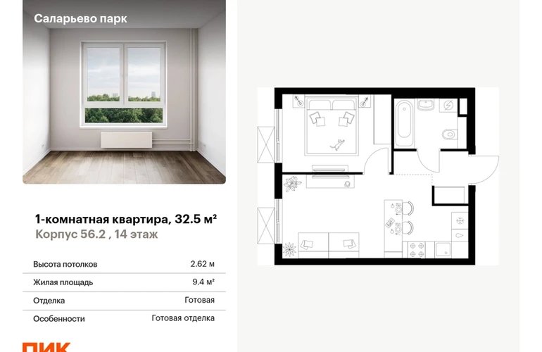 Продаётся 1-комн.квартира площадью 32.50 кв.м на 14 этаже 22 этажного дома (Корпус 56.2 , секция 1) проекта ПИК Саларьево парк. Светлый просторный подъезд на уровне земли, функциональная планировка, большие окна, с отделкой. <br> <br>Жилой район «Саларьево парк» расположен в Новой Москве, в четырёх километрах от МКАД по Киевскому шоссе. Две станции метро: «Саларьево» и «Филатов луг» — находятся в пешей доступности от проекта. Дойти до них можно за 5–10 минут. В квартале уже создана качественная среда, где есть абсолютно всё для полноценной жизни, работы и отдыха. <br> <br>«Саларьево парк» — не просто квартал, а полноценный жилой район, который отличается разноплановой архитектурой. Над концепцией квартала работали несколько ведущих архитектурных бюро, которые стремились добиться разнообразия в фасадных решениях. Ярким примером такого подхода станет корпус 83, который относится к «Серии плюс». <br> <br>Новый корпус 83 был создан по принципам южной архитектуры: расслабленный и лаконичный силуэт зданий, привлекающий к себе внимание. Архитектурная изюминка 83-го корпуса — террасы и фигурные балконы. Вместе с окнами и другими акцентными элементами они создают уникальный облик здания, отсылая нас к изысканной южной архитектуре. <br> <br>Все корпуса в квартале гармонично сочетаются, образуя единую городскую среду. Здесь приятно гулять и проводить время на улице всей семьёй. <br> <br>В «Саларьево парке» создана уникальная образовательная среда, включающая в себя шесть школ, рассчитанных на 6 250 учеников. Две из них уже открыты, их посещает 2 300 детей. Также на территории «Саларьево парка» находится 12 детских садов, один из которых с бассейном. Сейчас уже открыты 7 садов. <br> <br>В «Саларьево парке» открыта уникальная игровая площадка — PlayHub «Оригами». Здесь есть ручей, горка-труба и рельефные холмы. Взрослые смогут отдохнуть в уютном кафе, пока дети играют. Также на территории проекта есть SportHub — большая спортивная зона, разделённая по интересам и возрастам. Здесь можно заниматься разными видами спорта: футболом, баскетболом, волейболом и стритболом. Зимой центральную часть площадки превращают в каток. <br> <br>Во дворах-парках жилого квартала есть места для отдыха, детские и спортивные площадки. На первых этажах домов расположены магазины, кафе и полезные сервисы. Также вблизи проекта есть несколько масштабных торговых центров. До ТЦ «Саларис» пять минут пешком, до «Рио», Metro Cash & Carry и «Леруа Мерлен» — пять минут на автомобиле. Артикул - 990162О застройщике
