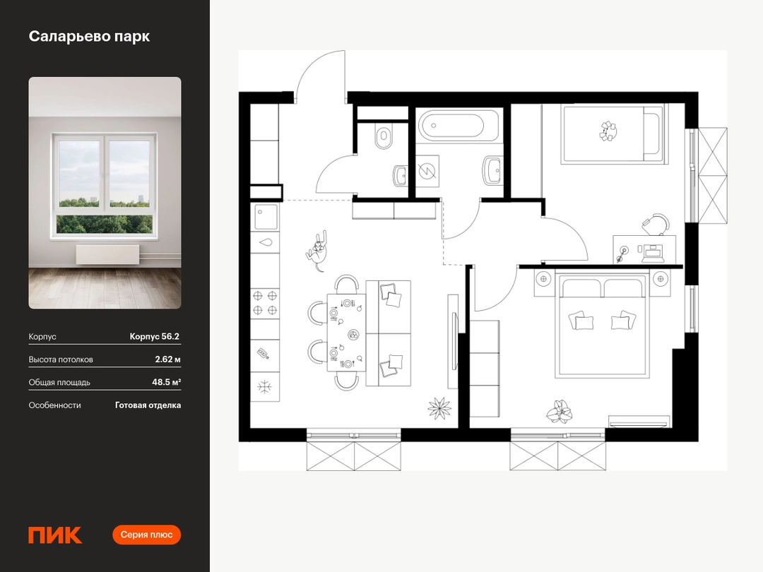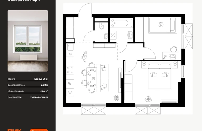 Продаётся 2-комн.квартира площадью 48.50 кв.м на 8 этаже 22 этажного дома (Корпус 56.2 , секция 1) проекта ПИК Саларьево парк. Светлый просторный подъезд на уровне земли, функциональная планировка, большие окна, с отделкой. <br> <br>Жилой район «Саларьево парк» расположен в Новой Москве, в четырёх километрах от МКАД по Киевскому шоссе. Две станции метро: «Саларьево» и «Филатов луг» — находятся в пешей доступности от проекта. Дойти до них можно за 5–10 минут. В квартале уже создана качественная среда, где есть абсолютно всё для полноценной жизни, работы и отдыха. <br> <br>«Саларьево парк» — не просто квартал, а полноценный жилой район, который отличается разноплановой архитектурой. Над концепцией квартала работали несколько ведущих архитектурных бюро, которые стремились добиться разнообразия в фасадных решениях. Ярким примером такого подхода станет корпус 83, который относится к «Серии плюс». <br> <br>Новый корпус 83 был создан по принципам южной архитектуры: расслабленный и лаконичный силуэт зданий, привлекающий к себе внимание. Архитектурная изюминка 83-го корпуса — террасы и фигурные балконы. Вместе с окнами и другими акцентными элементами они создают уникальный облик здания, отсылая нас к изысканной южной архитектуре. <br> <br>Все корпуса в квартале гармонично сочетаются, образуя единую городскую среду. Здесь приятно гулять и проводить время на улице всей семьёй. <br> <br>В «Саларьево парке» создана уникальная образовательная среда, включающая в себя шесть школ, рассчитанных на 6 250 учеников. Две из них уже открыты, их посещает 2 300 детей. Также на территории «Саларьево парка» находится 12 детских садов, один из которых с бассейном. Сейчас уже открыты 7 садов. <br> <br>В «Саларьево парке» открыта уникальная игровая площадка — PlayHub «Оригами». Здесь есть ручей, горка-труба и рельефные холмы. Взрослые смогут отдохнуть в уютном кафе, пока дети играют. Также на территории проекта есть SportHub — большая спортивная зона, разделённая по интересам и возрастам. Здесь можно заниматься разными видами спорта: футболом, баскетболом, волейболом и стритболом. Зимой центральную часть площадки превращают в каток. <br> <br>Во дворах-парках жилого квартала есть места для отдыха, детские и спортивные площадки. На первых этажах домов расположены магазины, кафе и полезные сервисы. Также вблизи проекта есть несколько масштабных торговых центров. До ТЦ «Саларис» пять минут пешком, до «Рио», Metro Cash & Carry и «Леруа Мерлен» — пять минут на автомобиле. Артикул - 990063О застройщике