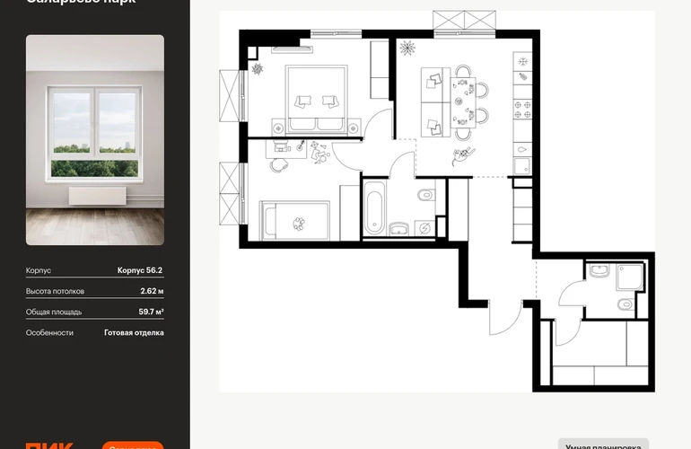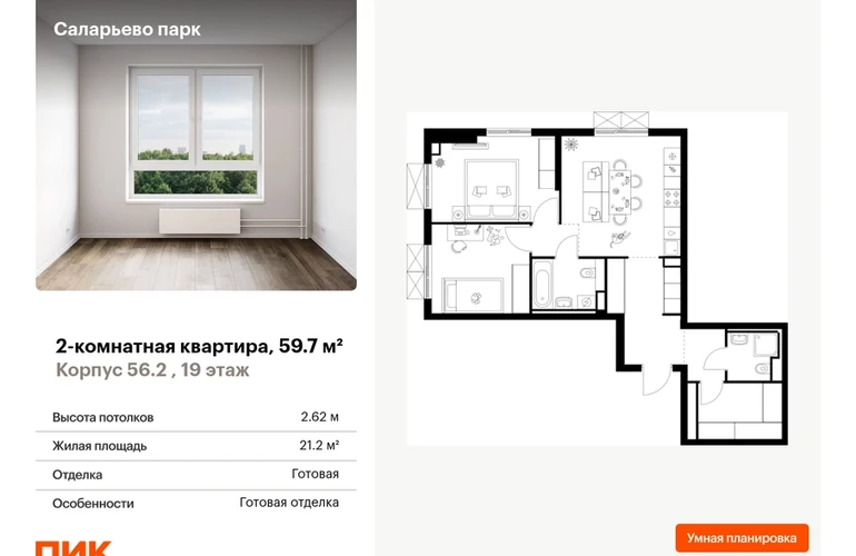 Продаётся 2-комн.квартира площадью 59.70 кв.м на 19 этаже 22 этажного дома (Корпус 56.2 , секция 2) проекта ПИК Саларьево парк. Светлый просторный подъезд на уровне земли, функциональная планировка, большие окна, с отделкой. <br> <br>Жилой район «Саларьево парк» расположен в Новой Москве, в четырёх километрах от МКАД по Киевскому шоссе. Две станции метро: «Саларьево» и «Филатов луг» — находятся в пешей доступности от проекта. Дойти до них можно за 5–10 минут. В квартале уже создана качественная среда, где есть абсолютно всё для полноценной жизни, работы и отдыха. <br> <br>«Саларьево парк» — не просто квартал, а полноценный жилой район, который отличается разноплановой архитектурой. Над концепцией квартала работали несколько ведущих архитектурных бюро, которые стремились добиться разнообразия в фасадных решениях. Ярким примером такого подхода станет корпус 83, который относится к «Серии плюс». <br> <br>Новый корпус 83 был создан по принципам южной архитектуры: расслабленный и лаконичный силуэт зданий, привлекающий к себе внимание. Архитектурная изюминка 83-го корпуса — террасы и фигурные балконы. Вместе с окнами и другими акцентными элементами они создают уникальный облик здания, отсылая нас к изысканной южной архитектуре. <br> <br>Все корпуса в квартале гармонично сочетаются, образуя единую городскую среду. Здесь приятно гулять и проводить время на улице всей семьёй. <br> <br>В «Саларьево парке» создана уникальная образовательная среда, включающая в себя шесть школ, рассчитанных на 6 250 учеников. Две из них уже открыты, их посещает 2 300 детей. Также на территории «Саларьево парка» находится 12 детских садов, один из которых с бассейном. Сейчас уже открыты 7 садов. <br> <br>В «Саларьево парке» открыта уникальная игровая площадка — PlayHub «Оригами». Здесь есть ручей, горка-труба и рельефные холмы. Взрослые смогут отдохнуть в уютном кафе, пока дети играют. Также на территории проекта есть SportHub — большая спортивная зона, разделённая по интересам и возрастам. Здесь можно заниматься разными видами спорта: футболом, баскетболом, волейболом и стритболом. Зимой центральную часть площадки превращают в каток. <br> <br>Во дворах-парках жилого квартала есть места для отдыха, детские и спортивные площадки. На первых этажах домов расположены магазины, кафе и полезные сервисы. Также вблизи проекта есть несколько масштабных торговых центров. До ТЦ «Саларис» пять минут пешком, до «Рио», Metro Cash & Carry и «Лемана про» — пять минут на автомобиле. Артикул - 990955О застройщике