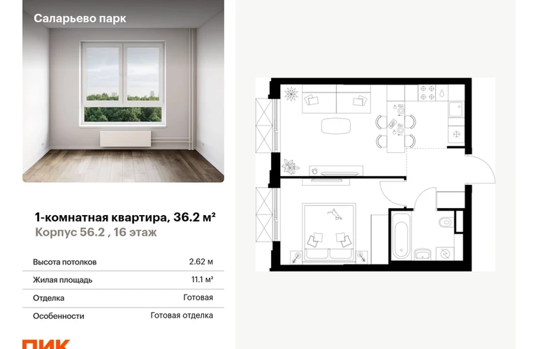Продаётся 1-комн.квартира площадью 36.20 кв.м на 16 этаже 22 этажного дома (Корпус 56.2 , секция 2) проекта ПИК Саларьево парк. Светлый просторный подъезд на уровне земли, функциональная планировка, большие окна, с отделкой. <br> <br>Жилой район «Саларьево парк» расположен в Новой Москве, в четырёх километрах от МКАД по Киевскому шоссе. Две станции метро: «Саларьево» и «Филатов луг» — находятся в пешей доступности от проекта. Дойти до них можно за 5–10 минут. В квартале уже создана качественная среда, где есть абсолютно всё для полноценной жизни, работы и отдыха. <br> <br>«Саларьево парк» — не просто квартал, а полноценный жилой район, который отличается разноплановой архитектурой. Над концепцией квартала работали несколько ведущих архитектурных бюро, которые стремились добиться разнообразия в фасадных решениях. Ярким примером такого подхода станет корпус 83, который относится к «Серии плюс». <br> <br>Новый корпус 83 был создан по принципам южной архитектуры: расслабленный и лаконичный силуэт зданий, привлекающий к себе внимание. Архитектурная изюминка 83-го корпуса — террасы и фигурные балконы. Вместе с окнами и другими акцентными элементами они создают уникальный облик здания, отсылая нас к изысканной южной архитектуре. <br> <br>Все корпуса в квартале гармонично сочетаются, образуя единую городскую среду. Здесь приятно гулять и проводить время на улице всей семьёй. <br> <br>В «Саларьево парке» создана уникальная образовательная среда, включающая в себя шесть школ, рассчитанных на 6 250 учеников. Две из них уже открыты, их посещает 2 300 детей. Также на территории «Саларьево парка» находится 12 детских садов, один из которых с бассейном. Сейчас уже открыты 7 садов. <br> <br>В «Саларьево парке» открыта уникальная игровая площадка — PlayHub «Оригами». Здесь есть ручей, горка-труба и рельефные холмы. Взрослые смогут отдохнуть в уютном кафе, пока дети играют. Также на территории проекта есть SportHub — большая спортивная зона, разделённая по интересам и возрастам. Здесь можно заниматься разными видами спорта: футболом, баскетболом, волейболом и стритболом. Зимой центральную часть площадки превращают в каток. <br> <br>Во дворах-парках жилого квартала есть места для отдыха, детские и спортивные площадки. На первых этажах домов расположены магазины, кафе и полезные сервисы. Также вблизи проекта есть несколько масштабных торговых центров. До ТЦ «Саларис» пять минут пешком, до «Рио», Metro Cash & Carry и «Лемана про» — пять минут на автомобиле. Артикул - 990901О застройщике