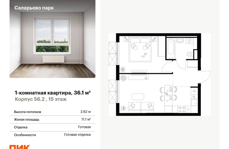 Продаётся 1-комн.квартира площадью 36.10 кв.м на 15 этаже 22 этажного дома (Корпус 56.2 , секция 2) проекта ПИК Саларьево парк. Светлый просторный подъезд на уровне земли, функциональная планировка, большие окна, с отделкой. <br> <br>Жилой район «Саларьево парк» расположен в Новой Москве, в четырёх километрах от МКАД по Киевскому шоссе. Две станции метро: «Саларьево» и «Филатов луг» — находятся в пешей доступности от проекта. Дойти до них можно за 5–10 минут. В квартале уже создана качественная среда, где есть абсолютно всё для полноценной жизни, работы и отдыха. <br> <br>«Саларьево парк» — не просто квартал, а полноценный жилой район, который отличается разноплановой архитектурой. Над концепцией квартала работали несколько ведущих архитектурных бюро, которые стремились добиться разнообразия в фасадных решениях. Ярким примером такого подхода станет корпус 83, который относится к «Серии плюс». <br> <br>Новый корпус 83 был создан по принципам южной архитектуры: расслабленный и лаконичный силуэт зданий, привлекающий к себе внимание. Архитектурная изюминка 83-го корпуса — террасы и фигурные балконы. Вместе с окнами и другими акцентными элементами они создают уникальный облик здания, отсылая нас к изысканной южной архитектуре. <br> <br>Все корпуса в квартале гармонично сочетаются, образуя единую городскую среду. Здесь приятно гулять и проводить время на улице всей семьёй. <br> <br>В «Саларьево парке» создана уникальная образовательная среда, включающая в себя шесть школ, рассчитанных на 6 250 учеников. Две из них уже открыты, их посещает 2 300 детей. Также на территории «Саларьево парка» находится 12 детских садов, один из которых с бассейном. Сейчас уже открыты 7 садов. <br> <br>В «Саларьево парке» открыта уникальная игровая площадка — PlayHub «Оригами». Здесь есть ручей, горка-труба и рельефные холмы. Взрослые смогут отдохнуть в уютном кафе, пока дети играют. Также на территории проекта есть SportHub — большая спортивная зона, разделённая по интересам и возрастам. Здесь можно заниматься разными видами спорта: футболом, баскетболом, волейболом и стритболом. Зимой центральную часть площадки превращают в каток. <br> <br>Во дворах-парках жилого квартала есть места для отдыха, детские и спортивные площадки. На первых этажах домов расположены магазины, кафе и полезные сервисы. Также вблизи проекта есть несколько масштабных торговых центров. До ТЦ «Саларис» пять минут пешком, до «Рио», Metro Cash & Carry и «Леруа Мерлен» — пять минут на автомобиле. Артикул - 990886О застройщике
