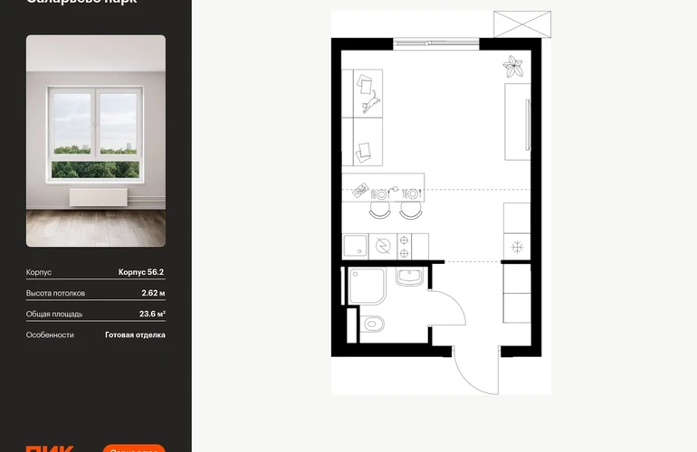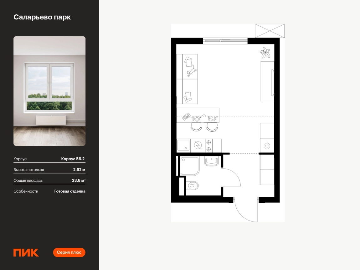 Продаётся квартира-студия площадью 23.60 кв.м на 22 этаже 22 этажного дома (Корпус 56.2 , секция 1) проекта ПИК Саларьево парк. Светлый просторный подъезд на уровне земли, функциональная планировка, большие окна, с отделкой. Жилой район «Саларьево парк» расположен в Новой Москве, в четырёх километрах от МКАД по Киевскому шоссе. Две станции метро: «Саларьево» и «Филатов луг» — находятся в пешей доступности от проекта. Дойти до них можно за 5–10 минут. В квартале уже создана качественная среда, где есть абсолютно всё для полноценной жизни, работы и отдыха. «Саларьево парк» — не просто квартал, а полноценный жилой район, который отличается разноплановой архитектурой. Над концепцией квартала работали несколько ведущих архитектурных бюро, которые стремились добиться разнообразия в фасадных решениях. Ярким примером такого подхода станет корпус 83, который относится к «Серии плюс». Новый корпус 83 был создан по принципам южной архитектуры: расслабленный и лаконичный силуэт зданий, привлекающий к себе внимание. Архитектурная изюминка 83-го корпуса — террасы и фигурные балконы. Вместе с окнами и другими акцентными элементами они создают уникальный облик здания, отсылая нас к изысканной южной архитектуре. Все корпуса в квартале гармонично сочетаются, образуя единую городскую среду. Здесь приятно гулять и проводить время на улице всей семьёй. В «Саларьево парке» создана уникальная образовательная среда, включающая в себя шесть школ, рассчитанных на 6 250 учеников. Две из них уже открыты, их посещает 2 300 детей. Также на территории «Саларьево парка» находится 12 детских садов, один из которых с бассейном. Сейчас уже открыты 7 садов. В «Саларьево парке» открыта уникальная игровая площадка — PlayHub «Оригами». Здесь есть ручей, горка-труба и рельефные холмы. Взрослые смогут отдохнуть в уютном кафе, пока дети играют. Также на территории проекта есть SportHub — большая спортивная зона, разделённая по интересам и возрастам. Здесь можно заниматься разными видами спорта: футболом, баскетболом, волейболом и стритболом. Зимой центральную часть площадки превращают в каток. Во дворах-парках жилого квартала есть места для отдыха, детские и спортивные площадки. На первых этажах домов расположены магазины, кафе и полезные сервисы. Также вблизи проекта есть несколько масштабных торговых центров. До ТЦ «Саларис» пять минут пешком, до «Рио», Metro Cash & Carry и «Лемана про» — пять минут на автомобиле. Артикул - 990299О застройщике