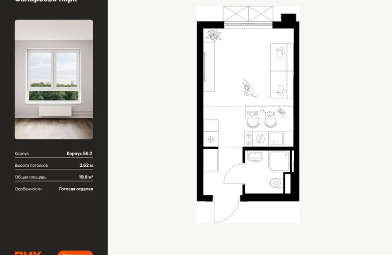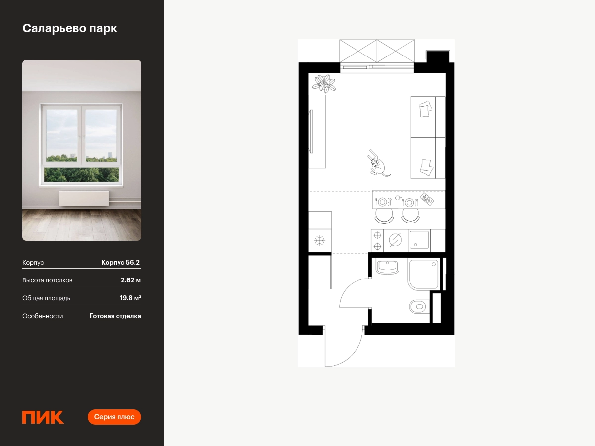 Продаётся квартира-студия площадью 19.80 кв.м на 22 этаже 22 этажного дома (Корпус 56.2 , секция 3) проекта ПИК Саларьево парк. Светлый просторный подъезд на уровне земли, функциональная планировка, большие окна, с отделкой. <br> <br>Жилой район «Саларьево парк» расположен в Новой Москве, в четырёх километрах от МКАД по Киевскому шоссе. Две станции метро: «Саларьево» и «Филатов луг» — находятся в пешей доступности от проекта. Дойти до них можно за 5–10 минут. В квартале уже создана качественная среда, где есть абсолютно всё для полноценной жизни, работы и отдыха. <br> <br>«Саларьево парк» — не просто квартал, а полноценный жилой район, который отличается разноплановой архитектурой. Над концепцией квартала работали несколько ведущих архитектурных бюро, которые стремились добиться разнообразия в фасадных решениях. Ярким примером такого подхода станет корпус 83, который относится к «Серии плюс». <br> <br>Новый корпус 83 был создан по принципам южной архитектуры: расслабленный и лаконичный силуэт зданий, привлекающий к себе внимание. Архитектурная изюминка 83-го корпуса — террасы и фигурные балконы. Вместе с окнами и другими акцентными элементами они создают уникальный облик здания, отсылая нас к изысканной южной архитектуре. <br> <br>Все корпуса в квартале гармонично сочетаются, образуя единую городскую среду. Здесь приятно гулять и проводить время на улице всей семьёй. <br> <br>В «Саларьево парке» создана уникальная образовательная среда, включающая в себя шесть школ, рассчитанных на 6 250 учеников. Две из них уже открыты, их посещает 2 300 детей. Также на территории «Саларьево парка» находится 12 детских садов, один из которых с бассейном. Сейчас уже открыты 7 садов. <br> <br>В «Саларьево парке» открыта уникальная игровая площадка — PlayHub «Оригами». Здесь есть ручей, горка-труба и рельефные холмы. Взрослые смогут отдохнуть в уютном кафе, пока дети играют. Также на территории проекта есть SportHub — большая спортивная зона, разделённая по интересам и возрастам. Здесь можно заниматься разными видами спорта: футболом, баскетболом, волейболом и стритболом. Зимой центральную часть площадки превращают в каток. <br> <br>Во дворах-парках жилого квартала есть места для отдыха, детские и спортивные площадки. На первых этажах домов расположены магазины, кафе и полезные сервисы. Также вблизи проекта есть несколько масштабных торговых центров. До ТЦ «Саларис» пять минут пешком, до «Рио», Metro Cash & Carry и «Леруа Мерлен» — пять минут на автомобиле. Артикул - 990811О застройщике