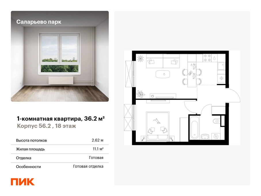 Продаётся 1-комн.квартира площадью 36.20 кв.м на 18 этаже 22 этажного дома (Корпус 56.2 , секция 3) проекта ПИК Саларьево парк. Светлый просторный подъезд на уровне земли, функциональная планировка, большие окна, с отделкой. <br> <br>Жилой район «Саларьево парк» расположен в Новой Москве, в четырёх километрах от МКАД по Киевскому шоссе. Две станции метро: «Саларьево» и «Филатов луг» — находятся в пешей доступности от проекта. Дойти до них можно за 5–10 минут. В квартале уже создана качественная среда, где есть абсолютно всё для полноценной жизни, работы и отдыха. <br> <br>«Саларьево парк» — не просто квартал, а полноценный жилой район, который отличается разноплановой архитектурой. Над концепцией квартала работали несколько ведущих архитектурных бюро, которые стремились добиться разнообразия в фасадных решениях. Ярким примером такого подхода станет корпус 83, который относится к «Серии плюс». <br> <br>Новый корпус 83 был создан по принципам южной архитектуры: расслабленный и лаконичный силуэт зданий, привлекающий к себе внимание. Архитектурная изюминка 83-го корпуса — террасы и фигурные балконы. Вместе с окнами и другими акцентными элементами они создают уникальный облик здания, отсылая нас к изысканной южной архитектуре. <br> <br>Все корпуса в квартале гармонично сочетаются, образуя единую городскую среду. Здесь приятно гулять и проводить время на улице всей семьёй. <br> <br>В «Саларьево парке» создана уникальная образовательная среда, включающая в себя шесть школ, рассчитанных на 6 250 учеников. Две из них уже открыты, их посещает 2 300 детей. Также на территории «Саларьево парка» находится 12 детских садов, один из которых с бассейном. Сейчас уже открыты 7 садов. <br> <br>В «Саларьево парке» открыта уникальная игровая площадка — PlayHub «Оригами». Здесь есть ручей, горка-труба и рельефные холмы. Взрослые смогут отдохнуть в уютном кафе, пока дети играют. Также на территории проекта есть SportHub — большая спортивная зона, разделённая по интересам и возрастам. Здесь можно заниматься разными видами спорта: футболом, баскетболом, волейболом и стритболом. Зимой центральную часть площадки превращают в каток. <br> <br>Во дворах-парках жилого квартала есть места для отдыха, детские и спортивные площадки. На первых этажах домов расположены магазины, кафе и полезные сервисы. Также вблизи проекта есть несколько масштабных торговых центров. До ТЦ «Саларис» пять минут пешком, до «Рио», Metro Cash & Carry и «Леруа Мерлен» — пять минут на автомобиле. Артикул - 990669О застройщике