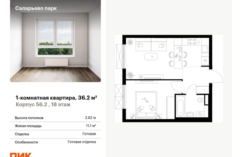 Продаётся 1-комн.квартира площадью 36.20 кв.м на 18 этаже 22 этажного дома (Корпус 56.2 , секция 3) проекта ПИК Саларьево парк. Светлый просторный подъезд на уровне земли, функциональная планировка, большие окна, с отделкой. <br> <br>Жилой район «Саларьево парк» расположен в Новой Москве, в четырёх километрах от МКАД по Киевскому шоссе. Две станции метро: «Саларьево» и «Филатов луг» — находятся в пешей доступности от проекта. Дойти до них можно за 5–10 минут. В квартале уже создана качественная среда, где есть абсолютно всё для полноценной жизни, работы и отдыха. <br> <br>«Саларьево парк» — не просто квартал, а полноценный жилой район, который отличается разноплановой архитектурой. Над концепцией квартала работали несколько ведущих архитектурных бюро, которые стремились добиться разнообразия в фасадных решениях. Ярким примером такого подхода станет корпус 83, который относится к «Серии плюс». <br> <br>Новый корпус 83 был создан по принципам южной архитектуры: расслабленный и лаконичный силуэт зданий, привлекающий к себе внимание. Архитектурная изюминка 83-го корпуса — террасы и фигурные балконы. Вместе с окнами и другими акцентными элементами они создают уникальный облик здания, отсылая нас к изысканной южной архитектуре. <br> <br>Все корпуса в квартале гармонично сочетаются, образуя единую городскую среду. Здесь приятно гулять и проводить время на улице всей семьёй. <br> <br>В «Саларьево парке» создана уникальная образовательная среда, включающая в себя шесть школ, рассчитанных на 6 250 учеников. Две из них уже открыты, их посещает 2 300 детей. Также на территории «Саларьево парка» находится 12 детских садов, один из которых с бассейном. Сейчас уже открыты 7 садов. <br> <br>В «Саларьево парке» открыта уникальная игровая площадка — PlayHub «Оригами». Здесь есть ручей, горка-труба и рельефные холмы. Взрослые смогут отдохнуть в уютном кафе, пока дети играют. Также на территории проекта есть SportHub — большая спортивная зона, разделённая по интересам и возрастам. Здесь можно заниматься разными видами спорта: футболом, баскетболом, волейболом и стритболом. Зимой центральную часть площадки превращают в каток. <br> <br>Во дворах-парках жилого квартала есть места для отдыха, детские и спортивные площадки. На первых этажах домов расположены магазины, кафе и полезные сервисы. Также вблизи проекта есть несколько масштабных торговых центров. До ТЦ «Саларис» пять минут пешком, до «Рио», Metro Cash & Carry и «Леруа Мерлен» — пять минут на автомобиле. Артикул - 990669О застройщике