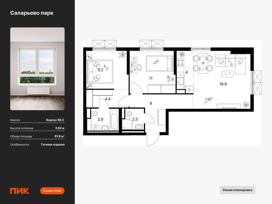 Продаётся 2-комн.квартира площадью 61.80 кв.м на 2 этаже 22 этажного дома (Корпус 56.2 , секция 2) проекта ПИК Саларьево парк. Светлый просторный подъезд на уровне земли, функциональная планировка, большие окна, с отделкой. <br> <br>Жилой район «Саларьево парк» расположен в Новой Москве, в четырёх километрах от МКАД по Киевскому шоссе. Две станции метро: «Саларьево» и «Филатов луг» — находятся в пешей доступности от проекта. Дойти до них можно за 5–10 минут. В квартале уже создана качественная среда, где есть абсолютно всё для полноценной жизни, работы и отдыха. <br> <br>«Саларьево парк» — не просто квартал, а полноценный жилой район, который отличается разноплановой архитектурой. Над концепцией квартала работали несколько ведущих архитектурных бюро, которые стремились добиться разнообразия в фасадных решениях. Ярким примером такого подхода станет корпус 83, который относится к «Серии плюс». <br> <br>Новый корпус 83 был создан по принципам южной архитектуры: расслабленный и лаконичный силуэт зданий, привлекающий к себе внимание. Архитектурная изюминка 83-го корпуса — террасы и фигурные балконы. Вместе с окнами и другими акцентными элементами они создают уникальный облик здания, отсылая нас к изысканной южной архитектуре. <br> <br>Все корпуса в квартале гармонично сочетаются, образуя единую городскую среду. Здесь приятно гулять и проводить время на улице всей семьёй. <br> <br>В «Саларьево парке» создана уникальная образовательная среда, включающая в себя шесть школ, рассчитанных на 6 250 учеников. Две из них уже открыты, их посещает 2 300 детей. Также на территории «Саларьево парка» находится 12 детских садов, один из которых с бассейном. Сейчас уже открыты 7 садов. <br> <br>В «Саларьево парке» открыта уникальная игровая площадка — PlayHub «Оригами». Здесь есть ручей, горка-труба и рельефные холмы. Взрослые смогут отдохнуть в уютном кафе, пока дети играют. Также на территории проекта есть SportHub — большая спортивная зона, разделённая по интересам и возрастам. Здесь можно заниматься разными видами спорта: футболом, баскетболом, волейболом и стритболом. Зимой центральную часть площадки превращают в каток. <br> <br>Во дворах-парках жилого квартала есть места для отдыха, детские и спортивные площадки. На первых этажах домов расположены магазины, кафе и полезные сервисы. Также вблизи проекта есть несколько масштабных торговых центров. До ТЦ «Саларис» пять минут пешком, до «Рио», Metro Cash & Carry и «Лемана про» — пять минут на автомобиле. Артикул - 990491О застройщике