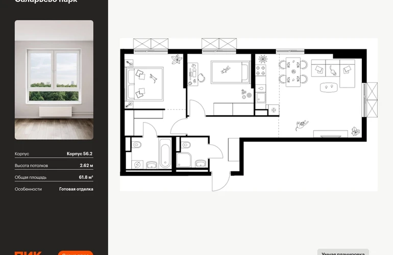 Продаётся 2-комн.квартира площадью 61.80 кв.м на 2 этаже 22 этажного дома (Корпус 56.2 , секция 2) проекта ПИК Саларьево парк. Светлый просторный подъезд на уровне земли, функциональная планировка, большие окна, с отделкой. <br> <br>Жилой район «Саларьево парк» расположен в Новой Москве, в четырёх километрах от МКАД по Киевскому шоссе. Две станции метро: «Саларьево» и «Филатов луг» — находятся в пешей доступности от проекта. Дойти до них можно за 5–10 минут. В квартале уже создана качественная среда, где есть абсолютно всё для полноценной жизни, работы и отдыха. <br> <br>«Саларьево парк» — не просто квартал, а полноценный жилой район, который отличается разноплановой архитектурой. Над концепцией квартала работали несколько ведущих архитектурных бюро, которые стремились добиться разнообразия в фасадных решениях. Ярким примером такого подхода станет корпус 83, который относится к «Серии плюс». <br> <br>Новый корпус 83 был создан по принципам южной архитектуры: расслабленный и лаконичный силуэт зданий, привлекающий к себе внимание. Архитектурная изюминка 83-го корпуса — террасы и фигурные балконы. Вместе с окнами и другими акцентными элементами они создают уникальный облик здания, отсылая нас к изысканной южной архитектуре. <br> <br>Все корпуса в квартале гармонично сочетаются, образуя единую городскую среду. Здесь приятно гулять и проводить время на улице всей семьёй. <br> <br>В «Саларьево парке» создана уникальная образовательная среда, включающая в себя шесть школ, рассчитанных на 6 250 учеников. Две из них уже открыты, их посещает 2 300 детей. Также на территории «Саларьево парка» находится 12 детских садов, один из которых с бассейном. Сейчас уже открыты 7 садов. <br> <br>В «Саларьево парке» открыта уникальная игровая площадка — PlayHub «Оригами». Здесь есть ручей, горка-труба и рельефные холмы. Взрослые смогут отдохнуть в уютном кафе, пока дети играют. Также на территории проекта есть SportHub — большая спортивная зона, разделённая по интересам и возрастам. Здесь можно заниматься разными видами спорта: футболом, баскетболом, волейболом и стритболом. Зимой центральную часть площадки превращают в каток. <br> <br>Во дворах-парках жилого квартала есть места для отдыха, детские и спортивные площадки. На первых этажах домов расположены магазины, кафе и полезные сервисы. Также вблизи проекта есть несколько масштабных торговых центров. До ТЦ «Саларис» пять минут пешком, до «Рио», Metro Cash & Carry и «Лемана про» — пять минут на автомобиле. Артикул - 990491О застройщике