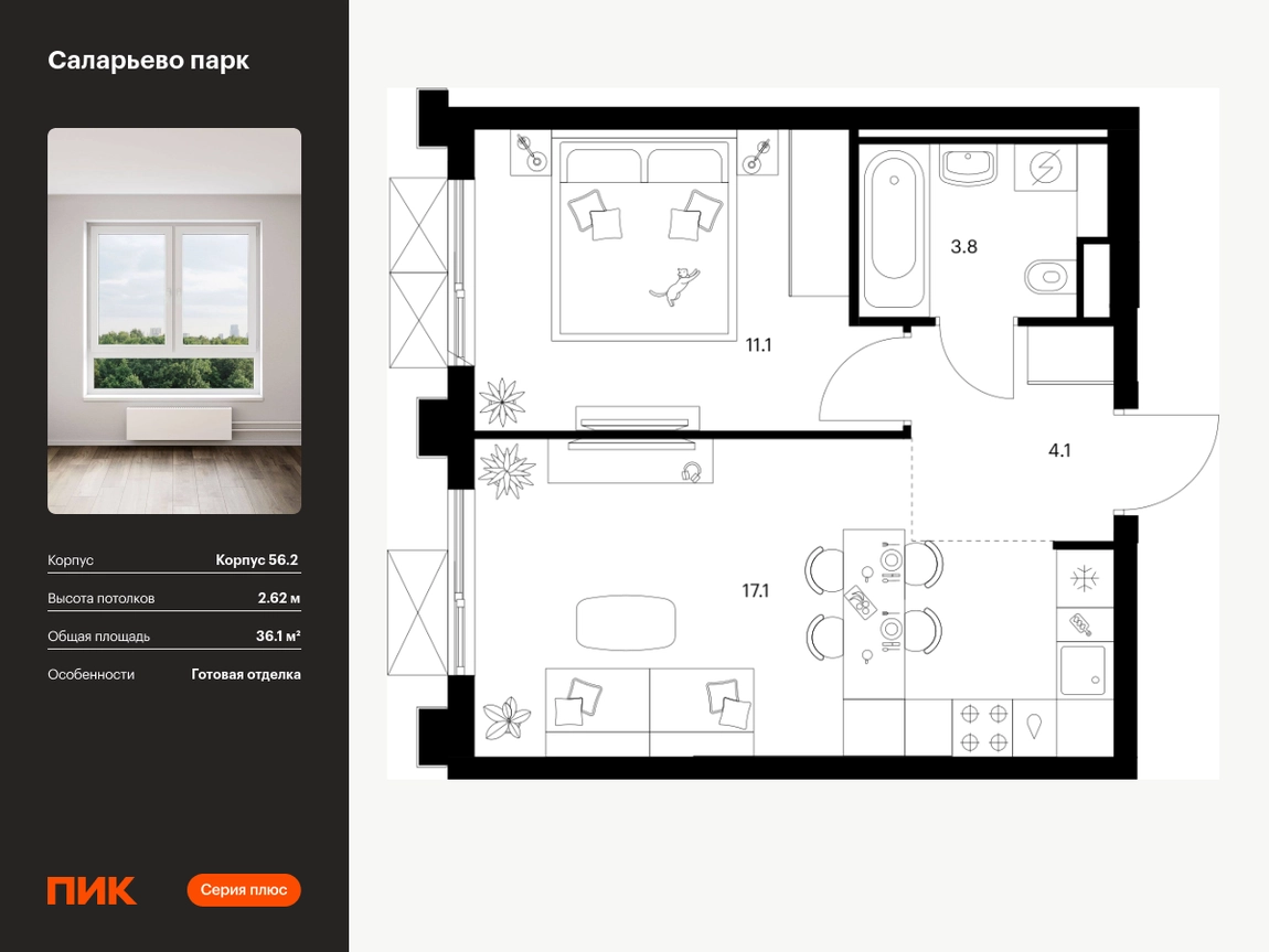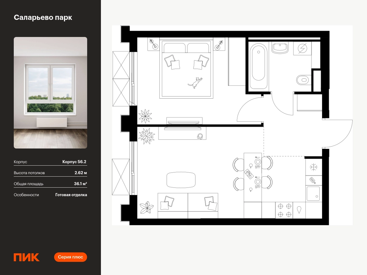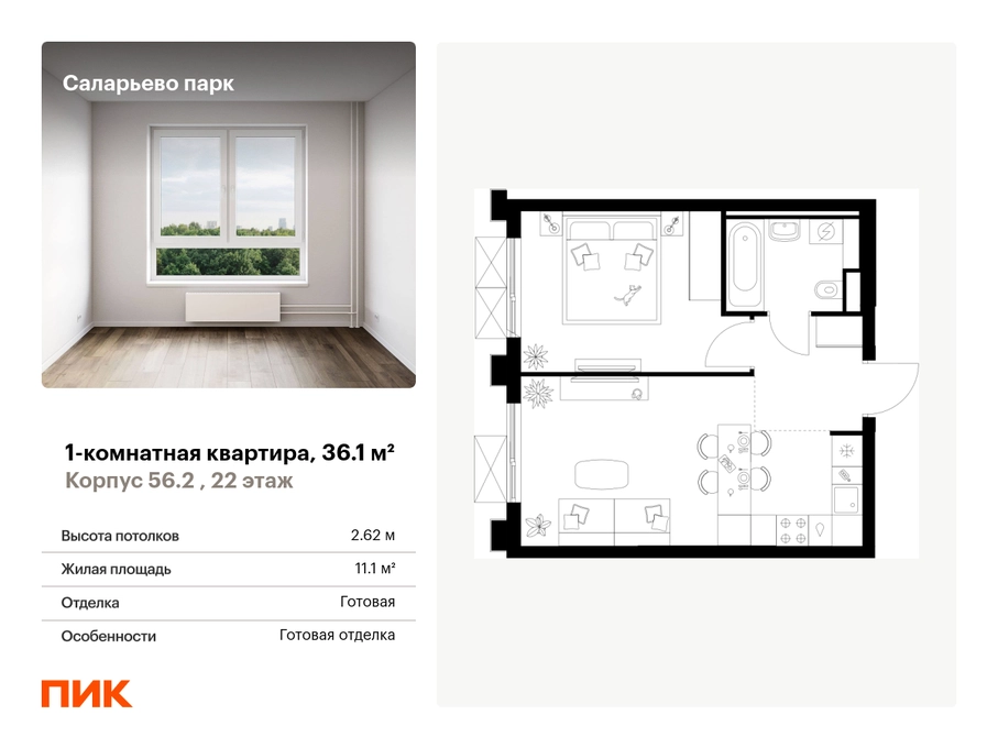 Продаётся 1-комн.квартира площадью 36.10 кв.м на 22 этаже 22 этажного дома (Корпус 56.2 , секция 3) проекта ПИК Саларьево парк. Светлый просторный подъезд на уровне земли, функциональная планировка, большие окна, с отделкой. <br> <br>Жилой район «Саларьево парк» расположен в Новой Москве, в четырёх километрах от МКАД по Киевскому шоссе. Две станции метро: «Саларьево» и «Филатов луг» — находятся в пешей доступности от проекта. Дойти до них можно за 5–10 минут. В квартале уже создана качественная среда, где есть абсолютно всё для полноценной жизни, работы и отдыха. <br> <br>«Саларьево парк» — не просто квартал, а полноценный жилой район, который отличается разноплановой архитектурой. Над концепцией квартала работали несколько ведущих архитектурных бюро, которые стремились добиться разнообразия в фасадных решениях. Ярким примером такого подхода станет корпус 83, который относится к «Серии плюс». <br> <br>Новый корпус 83 был создан по принципам южной архитектуры: расслабленный и лаконичный силуэт зданий, привлекающий к себе внимание. Архитектурная изюминка 83-го корпуса — террасы и фигурные балконы. Вместе с окнами и другими акцентными элементами они создают уникальный облик здания, отсылая нас к изысканной южной архитектуре. <br> <br>Все корпуса в квартале гармонично сочетаются, образуя единую городскую среду. Здесь приятно гулять и проводить время на улице всей семьёй. <br> <br>В «Саларьево парке» создана уникальная образовательная среда, включающая в себя шесть школ, рассчитанных на 6 250 учеников. Две из них уже открыты, их посещает 2 300 детей. Также на территории «Саларьево парка» находится 12 детских садов, один из которых с бассейном. Сейчас уже открыты 7 садов. <br> <br>В «Саларьево парке» открыта уникальная игровая площадка — PlayHub «Оригами». Здесь есть ручей, горка-труба и рельефные холмы. Взрослые смогут отдохнуть в уютном кафе, пока дети играют. Также на территории проекта есть SportHub — большая спортивная зона, разделённая по интересам и возрастам. Здесь можно заниматься разными видами спорта: футболом, баскетболом, волейболом и стритболом. Зимой центральную часть площадки превращают в каток. <br> <br>Во дворах-парках жилого квартала есть места для отдыха, детские и спортивные площадки. На первых этажах домов расположены магазины, кафе и полезные сервисы. Также вблизи проекта есть несколько масштабных торговых центров. До ТЦ «Саларис» пять минут пешком, до «Рио», Metro Cash & Carry и «Лемана про» — пять минут на автомобиле. Артикул - 990814О застройщике