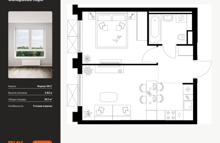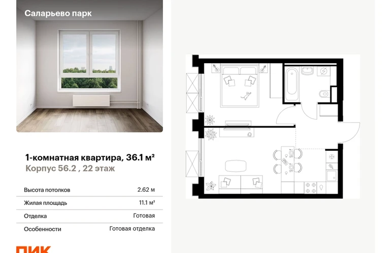 Продаётся 1-комн.квартира площадью 36.10 кв.м на 22 этаже 22 этажного дома (Корпус 56.2 , секция 3) проекта ПИК Саларьево парк. Светлый просторный подъезд на уровне земли, функциональная планировка, большие окна, с отделкой. <br> <br>Жилой район «Саларьево парк» расположен в Новой Москве, в четырёх километрах от МКАД по Киевскому шоссе. Две станции метро: «Саларьево» и «Филатов луг» — находятся в пешей доступности от проекта. Дойти до них можно за 5–10 минут. В квартале уже создана качественная среда, где есть абсолютно всё для полноценной жизни, работы и отдыха. <br> <br>«Саларьево парк» — не просто квартал, а полноценный жилой район, который отличается разноплановой архитектурой. Над концепцией квартала работали несколько ведущих архитектурных бюро, которые стремились добиться разнообразия в фасадных решениях. Ярким примером такого подхода станет корпус 83, который относится к «Серии плюс». <br> <br>Новый корпус 83 был создан по принципам южной архитектуры: расслабленный и лаконичный силуэт зданий, привлекающий к себе внимание. Архитектурная изюминка 83-го корпуса — террасы и фигурные балконы. Вместе с окнами и другими акцентными элементами они создают уникальный облик здания, отсылая нас к изысканной южной архитектуре. <br> <br>Все корпуса в квартале гармонично сочетаются, образуя единую городскую среду. Здесь приятно гулять и проводить время на улице всей семьёй. <br> <br>В «Саларьево парке» создана уникальная образовательная среда, включающая в себя шесть школ, рассчитанных на 6 250 учеников. Две из них уже открыты, их посещает 2 300 детей. Также на территории «Саларьево парка» находится 12 детских садов, один из которых с бассейном. Сейчас уже открыты 7 садов. <br> <br>В «Саларьево парке» открыта уникальная игровая площадка — PlayHub «Оригами». Здесь есть ручей, горка-труба и рельефные холмы. Взрослые смогут отдохнуть в уютном кафе, пока дети играют. Также на территории проекта есть SportHub — большая спортивная зона, разделённая по интересам и возрастам. Здесь можно заниматься разными видами спорта: футболом, баскетболом, волейболом и стритболом. Зимой центральную часть площадки превращают в каток. <br> <br>Во дворах-парках жилого квартала есть места для отдыха, детские и спортивные площадки. На первых этажах домов расположены магазины, кафе и полезные сервисы. Также вблизи проекта есть несколько масштабных торговых центров. До ТЦ «Саларис» пять минут пешком, до «Рио», Metro Cash & Carry и «Лемана про» — пять минут на автомобиле. Артикул - 990814О застройщике