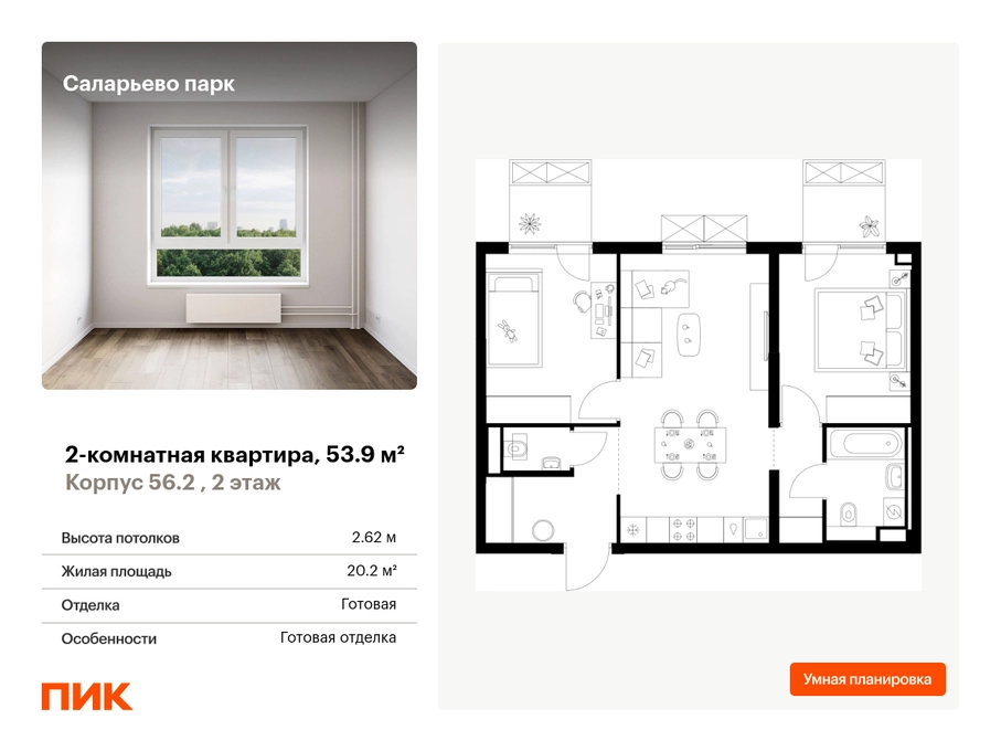 Продаётся 2-комн.квартира площадью 53.90 кв.м на 2 этаже 22 этажного дома (Корпус 56.2 , секция 3) проекта ПИК Саларьево парк. Светлый просторный подъезд на уровне земли, функциональная планировка, большие окна, с отделкой. <br> <br>Жилой район «Саларьево парк» расположен в Новой Москве, в четырёх километрах от МКАД по Киевскому шоссе. Две станции метро: «Саларьево» и «Филатов луг» — находятся в пешей доступности от проекта. Дойти до них можно за 5–10 минут. В квартале уже создана качественная среда, где есть абсолютно всё для полноценной жизни, работы и отдыха. <br> <br>«Саларьево парк» — не просто квартал, а полноценный жилой район, который отличается разноплановой архитектурой. Над концепцией квартала работали несколько ведущих архитектурных бюро, которые стремились добиться разнообразия в фасадных решениях. Ярким примером такого подхода станет корпус 83, который относится к «Серии плюс». <br> <br>Новый корпус 83 был создан по принципам южной архитектуры: расслабленный и лаконичный силуэт зданий, привлекающий к себе внимание. Архитектурная изюминка 83-го корпуса — террасы и фигурные балконы. Вместе с окнами и другими акцентными элементами они создают уникальный облик здания, отсылая нас к изысканной южной архитектуре. <br> <br>Все корпуса в квартале гармонично сочетаются, образуя единую городскую среду. Здесь приятно гулять и проводить время на улице всей семьёй. <br> <br>В «Саларьево парке» создана уникальная образовательная среда, включающая в себя шесть школ, рассчитанных на 6 250 учеников. Две из них уже открыты, их посещает 2 300 детей. Также на территории «Саларьево парка» находится 12 детских садов, один из которых с бассейном. Сейчас уже открыты 7 садов. <br> <br>В «Саларьево парке» открыта уникальная игровая площадка — PlayHub «Оригами». Здесь есть ручей, горка-труба и рельефные холмы. Взрослые смогут отдохнуть в уютном кафе, пока дети играют. Также на территории проекта есть SportHub — большая спортивная зона, разделённая по интересам и возрастам. Здесь можно заниматься разными видами спорта: футболом, баскетболом, волейболом и стритболом. Зимой центральную часть площадки превращают в каток. <br> <br>Во дворах-парках жилого квартала есть места для отдыха, детские и спортивные площадки. На первых этажах домов расположены магазины, кафе и полезные сервисы. Также вблизи проекта есть несколько масштабных торговых центров. До ТЦ «Саларис» пять минут пешком, до «Рио», Metro Cash & Carry и «Леруа Мерлен» — пять минут на автомобиле. Артикул - 990314О застройщике