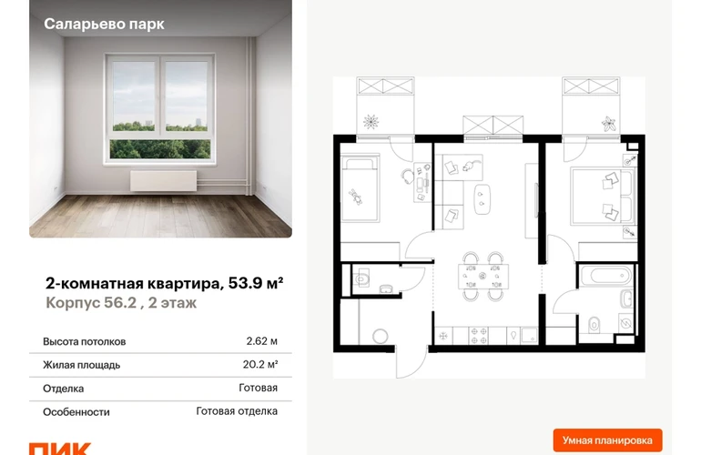 Продаётся 2-комн.квартира площадью 53.90 кв.м на 2 этаже 22 этажного дома (Корпус 56.2 , секция 3) проекта ПИК Саларьево парк. Светлый просторный подъезд на уровне земли, функциональная планировка, большие окна, с отделкой. <br> <br>Жилой район «Саларьево парк» расположен в Новой Москве, в четырёх километрах от МКАД по Киевскому шоссе. Две станции метро: «Саларьево» и «Филатов луг» — находятся в пешей доступности от проекта. Дойти до них можно за 5–10 минут. В квартале уже создана качественная среда, где есть абсолютно всё для полноценной жизни, работы и отдыха. <br> <br>«Саларьево парк» — не просто квартал, а полноценный жилой район, который отличается разноплановой архитектурой. Над концепцией квартала работали несколько ведущих архитектурных бюро, которые стремились добиться разнообразия в фасадных решениях. Ярким примером такого подхода станет корпус 83, который относится к «Серии плюс». <br> <br>Новый корпус 83 был создан по принципам южной архитектуры: расслабленный и лаконичный силуэт зданий, привлекающий к себе внимание. Архитектурная изюминка 83-го корпуса — террасы и фигурные балконы. Вместе с окнами и другими акцентными элементами они создают уникальный облик здания, отсылая нас к изысканной южной архитектуре. <br> <br>Все корпуса в квартале гармонично сочетаются, образуя единую городскую среду. Здесь приятно гулять и проводить время на улице всей семьёй. <br> <br>В «Саларьево парке» создана уникальная образовательная среда, включающая в себя шесть школ, рассчитанных на 6 250 учеников. Две из них уже открыты, их посещает 2 300 детей. Также на территории «Саларьево парка» находится 12 детских садов, один из которых с бассейном. Сейчас уже открыты 7 садов. <br> <br>В «Саларьево парке» открыта уникальная игровая площадка — PlayHub «Оригами». Здесь есть ручей, горка-труба и рельефные холмы. Взрослые смогут отдохнуть в уютном кафе, пока дети играют. Также на территории проекта есть SportHub — большая спортивная зона, разделённая по интересам и возрастам. Здесь можно заниматься разными видами спорта: футболом, баскетболом, волейболом и стритболом. Зимой центральную часть площадки превращают в каток. <br> <br>Во дворах-парках жилого квартала есть места для отдыха, детские и спортивные площадки. На первых этажах домов расположены магазины, кафе и полезные сервисы. Также вблизи проекта есть несколько масштабных торговых центров. До ТЦ «Саларис» пять минут пешком, до «Рио», Metro Cash & Carry и «Леруа Мерлен» — пять минут на автомобиле. Артикул - 990314О застройщике