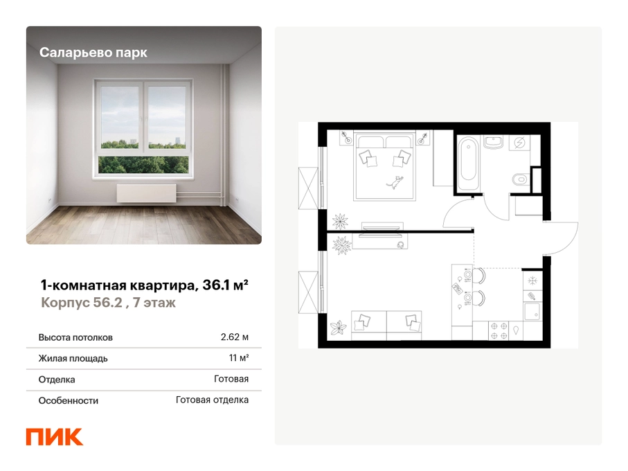 Продаётся 1-комн.квартира площадью 36.10 кв.м на 7 этаже 22 этажного дома (Корпус 56.2 , секция 1) проекта ПИК Саларьево парк. Светлый просторный подъезд на уровне земли, функциональная планировка, большие окна, с отделкой. <br> <br>Жилой район «Саларьево парк» расположен в Новой Москве, в четырёх километрах от МКАД по Киевскому шоссе. Две станции метро: «Саларьево» и «Филатов луг» — находятся в пешей доступности от проекта. Дойти до них можно за 5–10 минут. В квартале уже создана качественная среда, где есть абсолютно всё для полноценной жизни, работы и отдыха. <br> <br>«Саларьево парк» — не просто квартал, а полноценный жилой район, который отличается разноплановой архитектурой. Над концепцией квартала работали несколько ведущих архитектурных бюро, которые стремились добиться разнообразия в фасадных решениях. Ярким примером такого подхода станет корпус 83, который относится к «Серии плюс». <br> <br>Новый корпус 83 был создан по принципам южной архитектуры: расслабленный и лаконичный силуэт зданий, привлекающий к себе внимание. Архитектурная изюминка 83-го корпуса — террасы и фигурные балконы. Вместе с окнами и другими акцентными элементами они создают уникальный облик здания, отсылая нас к изысканной южной архитектуре. <br> <br>Все корпуса в квартале гармонично сочетаются, образуя единую городскую среду. Здесь приятно гулять и проводить время на улице всей семьёй. <br> <br>В «Саларьево парке» создана уникальная образовательная среда, включающая в себя шесть школ, рассчитанных на 6 250 учеников. Две из них уже открыты, их посещает 2 300 детей. Также на территории «Саларьево парка» находится 12 детских садов, один из которых с бассейном. Сейчас уже открыты 7 садов. <br> <br>В «Саларьево парке» открыта уникальная игровая площадка — PlayHub «Оригами». Здесь есть ручей, горка-труба и рельефные холмы. Взрослые смогут отдохнуть в уютном кафе, пока дети играют. Также на территории проекта есть SportHub — большая спортивная зона, разделённая по интересам и возрастам. Здесь можно заниматься разными видами спорта: футболом, баскетболом, волейболом и стритболом. Зимой центральную часть площадки превращают в каток. <br> <br>Во дворах-парках жилого квартала есть места для отдыха, детские и спортивные площадки. На первых этажах домов расположены магазины, кафе и полезные сервисы. Также вблизи проекта есть несколько масштабных торговых центров. До ТЦ «Саларис» пять минут пешком, до «Рио», Metro Cash & Carry и «Леруа Мерлен» — пять минут на автомобиле. Артикул - 990052О застройщике