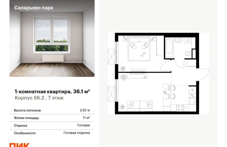 Продаётся 1-комн.квартира площадью 36.10 кв.м на 7 этаже 22 этажного дома (Корпус 56.2 , секция 1) проекта ПИК Саларьево парк. Светлый просторный подъезд на уровне земли, функциональная планировка, большие окна, с отделкой. <br> <br>Жилой район «Саларьево парк» расположен в Новой Москве, в четырёх километрах от МКАД по Киевскому шоссе. Две станции метро: «Саларьево» и «Филатов луг» — находятся в пешей доступности от проекта. Дойти до них можно за 5–10 минут. В квартале уже создана качественная среда, где есть абсолютно всё для полноценной жизни, работы и отдыха. <br> <br>«Саларьево парк» — не просто квартал, а полноценный жилой район, который отличается разноплановой архитектурой. Над концепцией квартала работали несколько ведущих архитектурных бюро, которые стремились добиться разнообразия в фасадных решениях. Ярким примером такого подхода станет корпус 83, который относится к «Серии плюс». <br> <br>Новый корпус 83 был создан по принципам южной архитектуры: расслабленный и лаконичный силуэт зданий, привлекающий к себе внимание. Архитектурная изюминка 83-го корпуса — террасы и фигурные балконы. Вместе с окнами и другими акцентными элементами они создают уникальный облик здания, отсылая нас к изысканной южной архитектуре. <br> <br>Все корпуса в квартале гармонично сочетаются, образуя единую городскую среду. Здесь приятно гулять и проводить время на улице всей семьёй. <br> <br>В «Саларьево парке» создана уникальная образовательная среда, включающая в себя шесть школ, рассчитанных на 6 250 учеников. Две из них уже открыты, их посещает 2 300 детей. Также на территории «Саларьево парка» находится 12 детских садов, один из которых с бассейном. Сейчас уже открыты 7 садов. <br> <br>В «Саларьево парке» открыта уникальная игровая площадка — PlayHub «Оригами». Здесь есть ручей, горка-труба и рельефные холмы. Взрослые смогут отдохнуть в уютном кафе, пока дети играют. Также на территории проекта есть SportHub — большая спортивная зона, разделённая по интересам и возрастам. Здесь можно заниматься разными видами спорта: футболом, баскетболом, волейболом и стритболом. Зимой центральную часть площадки превращают в каток. <br> <br>Во дворах-парках жилого квартала есть места для отдыха, детские и спортивные площадки. На первых этажах домов расположены магазины, кафе и полезные сервисы. Также вблизи проекта есть несколько масштабных торговых центров. До ТЦ «Саларис» пять минут пешком, до «Рио», Metro Cash & Carry и «Леруа Мерлен» — пять минут на автомобиле. Артикул - 990052О застройщике