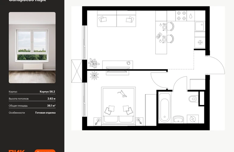 Продаётся 1-комн.квартира площадью 36.10 кв.м на 22 этаже 22 этажного дома (Корпус 56.2 , секция 1) проекта ПИК Саларьево парк. Светлый просторный подъезд на уровне земли, функциональная планировка, большие окна, с отделкой. <br> <br>Жилой район «Саларьево парк» расположен в Новой Москве, в четырёх километрах от МКАД по Киевскому шоссе. Две станции метро: «Саларьево» и «Филатов луг» — находятся в пешей доступности от проекта. Дойти до них можно за 5–10 минут. В квартале уже создана качественная среда, где есть абсолютно всё для полноценной жизни, работы и отдыха. <br> <br>«Саларьево парк» — не просто квартал, а полноценный жилой район, который отличается разноплановой архитектурой. Над концепцией квартала работали несколько ведущих архитектурных бюро, которые стремились добиться разнообразия в фасадных решениях. Ярким примером такого подхода станет корпус 83, который относится к «Серии плюс». <br> <br>Новый корпус 83 был создан по принципам южной архитектуры: расслабленный и лаконичный силуэт зданий, привлекающий к себе внимание. Архитектурная изюминка 83-го корпуса — террасы и фигурные балконы. Вместе с окнами и другими акцентными элементами они создают уникальный облик здания, отсылая нас к изысканной южной архитектуре. <br> <br>Все корпуса в квартале гармонично сочетаются, образуя единую городскую среду. Здесь приятно гулять и проводить время на улице всей семьёй. <br> <br>В «Саларьево парке» создана уникальная образовательная среда, включающая в себя шесть школ, рассчитанных на 6 250 учеников. Две из них уже открыты, их посещает 2 300 детей. Также на территории «Саларьево парка» находится 12 детских садов, один из которых с бассейном. Сейчас уже открыты 7 садов. <br> <br>В «Саларьево парке» открыта уникальная игровая площадка — PlayHub «Оригами». Здесь есть ручей, горка-труба и рельефные холмы. Взрослые смогут отдохнуть в уютном кафе, пока дети играют. Также на территории проекта есть SportHub — большая спортивная зона, разделённая по интересам и возрастам. Здесь можно заниматься разными видами спорта: футболом, баскетболом, волейболом и стритболом. Зимой центральную часть площадки превращают в каток. <br> <br>Во дворах-парках жилого квартала есть места для отдыха, детские и спортивные площадки. На первых этажах домов расположены магазины, кафе и полезные сервисы. Также вблизи проекта есть несколько масштабных торговых центров. До ТЦ «Саларис» пять минут пешком, до «Рио», Metro Cash & Carry и «Лемана про» — пять минут на автомобиле. Артикул - 990289О застройщике