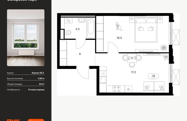 Продаётся 1-комн.квартира площадью 44.00 кв.м на 22 этаже 22 этажного дома (Корпус 56.2 , секция 2) проекта ПИК Саларьево парк. Светлый просторный подъезд на уровне земли, функциональная планировка, большие окна, с отделкой. <br> <br>Жилой район «Саларьево парк» расположен в Новой Москве, в четырёх километрах от МКАД по Киевскому шоссе. Две станции метро: «Саларьево» и «Филатов луг» — находятся в пешей доступности от проекта. Дойти до них можно за 5–10 минут. В квартале уже создана качественная среда, где есть абсолютно всё для полноценной жизни, работы и отдыха. <br> <br>«Саларьево парк» — не просто квартал, а полноценный жилой район, который отличается разноплановой архитектурой. Над концепцией квартала работали несколько ведущих архитектурных бюро, которые стремились добиться разнообразия в фасадных решениях. Ярким примером такого подхода станет корпус 83, который относится к «Серии плюс». <br> <br>Новый корпус 83 был создан по принципам южной архитектуры: расслабленный и лаконичный силуэт зданий, привлекающий к себе внимание. Архитектурная изюминка 83-го корпуса — террасы и фигурные балконы. Вместе с окнами и другими акцентными элементами они создают уникальный облик здания, отсылая нас к изысканной южной архитектуре. <br> <br>Все корпуса в квартале гармонично сочетаются, образуя единую городскую среду. Здесь приятно гулять и проводить время на улице всей семьёй. <br> <br>В «Саларьево парке» создана уникальная образовательная среда, включающая в себя шесть школ, рассчитанных на 6 250 учеников. Две из них уже открыты, их посещает 2 300 детей. Также на территории «Саларьево парка» находится 12 детских садов, один из которых с бассейном. Сейчас уже открыты 7 садов. <br> <br>В «Саларьево парке» открыта уникальная игровая площадка — PlayHub «Оригами». Здесь есть ручей, горка-труба и рельефные холмы. Взрослые смогут отдохнуть в уютном кафе, пока дети играют. Также на территории проекта есть SportHub — большая спортивная зона, разделённая по интересам и возрастам. Здесь можно заниматься разными видами спорта: футболом, баскетболом, волейболом и стритболом. Зимой центральную часть площадки превращают в каток. <br> <br>Во дворах-парках жилого квартала есть места для отдыха, детские и спортивные площадки. На первых этажах домов расположены магазины, кафе и полезные сервисы. Также вблизи проекта есть несколько масштабных торговых центров. До ТЦ «Саларис» пять минут пешком, до «Рио», Metro Cash & Carry и «Лемана про» — пять минут на автомобиле. Артикул - 991011О застройщике