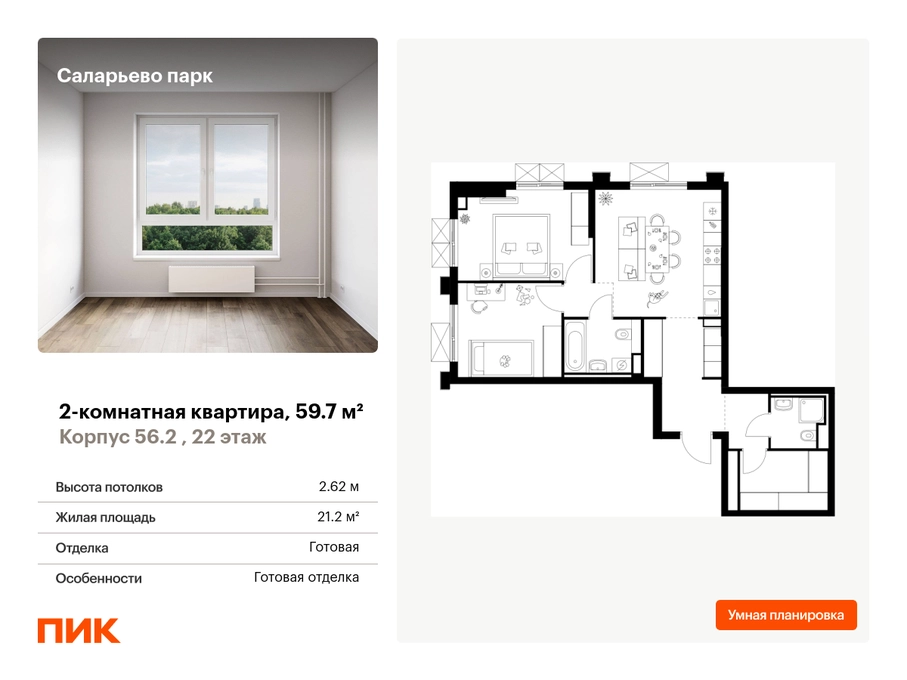 Продаётся 2-комн.квартира площадью 59.70 кв.м на 22 этаже 22 этажного дома (Корпус 56.2 , секция 3) проекта ПИК Саларьево парк. Светлый просторный подъезд на уровне земли, функциональная планировка, большие окна, с отделкой. <br> <br>Жилой район «Саларьево парк» расположен в Новой Москве, в четырёх километрах от МКАД по Киевскому шоссе. Две станции метро: «Саларьево» и «Филатов луг» — находятся в пешей доступности от проекта. Дойти до них можно за 5–10 минут. В квартале уже создана качественная среда, где есть абсолютно всё для полноценной жизни, работы и отдыха. <br> <br>«Саларьево парк» — не просто квартал, а полноценный жилой район, который отличается разноплановой архитектурой. Над концепцией квартала работали несколько ведущих архитектурных бюро, которые стремились добиться разнообразия в фасадных решениях. Ярким примером такого подхода станет корпус 83, который относится к «Серии плюс». <br> <br>Новый корпус 83 был создан по принципам южной архитектуры: расслабленный и лаконичный силуэт зданий, привлекающий к себе внимание. Архитектурная изюминка 83-го корпуса — террасы и фигурные балконы. Вместе с окнами и другими акцентными элементами они создают уникальный облик здания, отсылая нас к изысканной южной архитектуре. <br> <br>Все корпуса в квартале гармонично сочетаются, образуя единую городскую среду. Здесь приятно гулять и проводить время на улице всей семьёй. <br> <br>В «Саларьево парке» создана уникальная образовательная среда, включающая в себя шесть школ, рассчитанных на 6 250 учеников. Две из них уже открыты, их посещает 2 300 детей. Также на территории «Саларьево парка» находится 12 детских садов, один из которых с бассейном. Сейчас уже открыты 7 садов. <br> <br>В «Саларьево парке» открыта уникальная игровая площадка — PlayHub «Оригами». Здесь есть ручей, горка-труба и рельефные холмы. Взрослые смогут отдохнуть в уютном кафе, пока дети играют. Также на территории проекта есть SportHub — большая спортивная зона, разделённая по интересам и возрастам. Здесь можно заниматься разными видами спорта: футболом, баскетболом, волейболом и стритболом. Зимой центральную часть площадки превращают в каток. <br> <br>Во дворах-парках жилого квартала есть места для отдыха, детские и спортивные площадки. На первых этажах домов расположены магазины, кафе и полезные сервисы. Также вблизи проекта есть несколько масштабных торговых центров. До ТЦ «Саларис» пять минут пешком, до «Рио», Metro Cash & Carry и «Лемана про» — пять минут на автомобиле. Артикул - 990802О застройщике