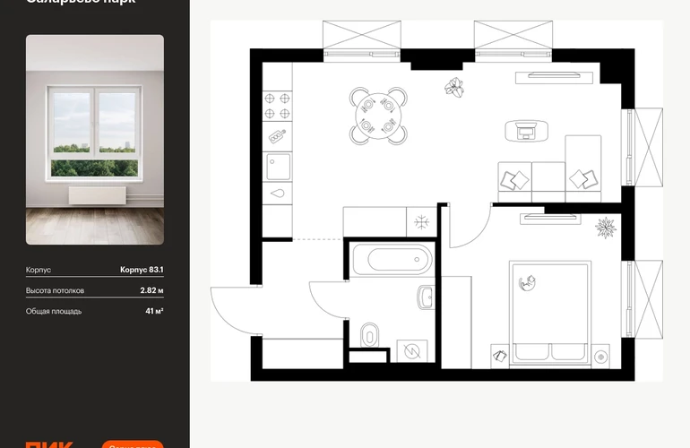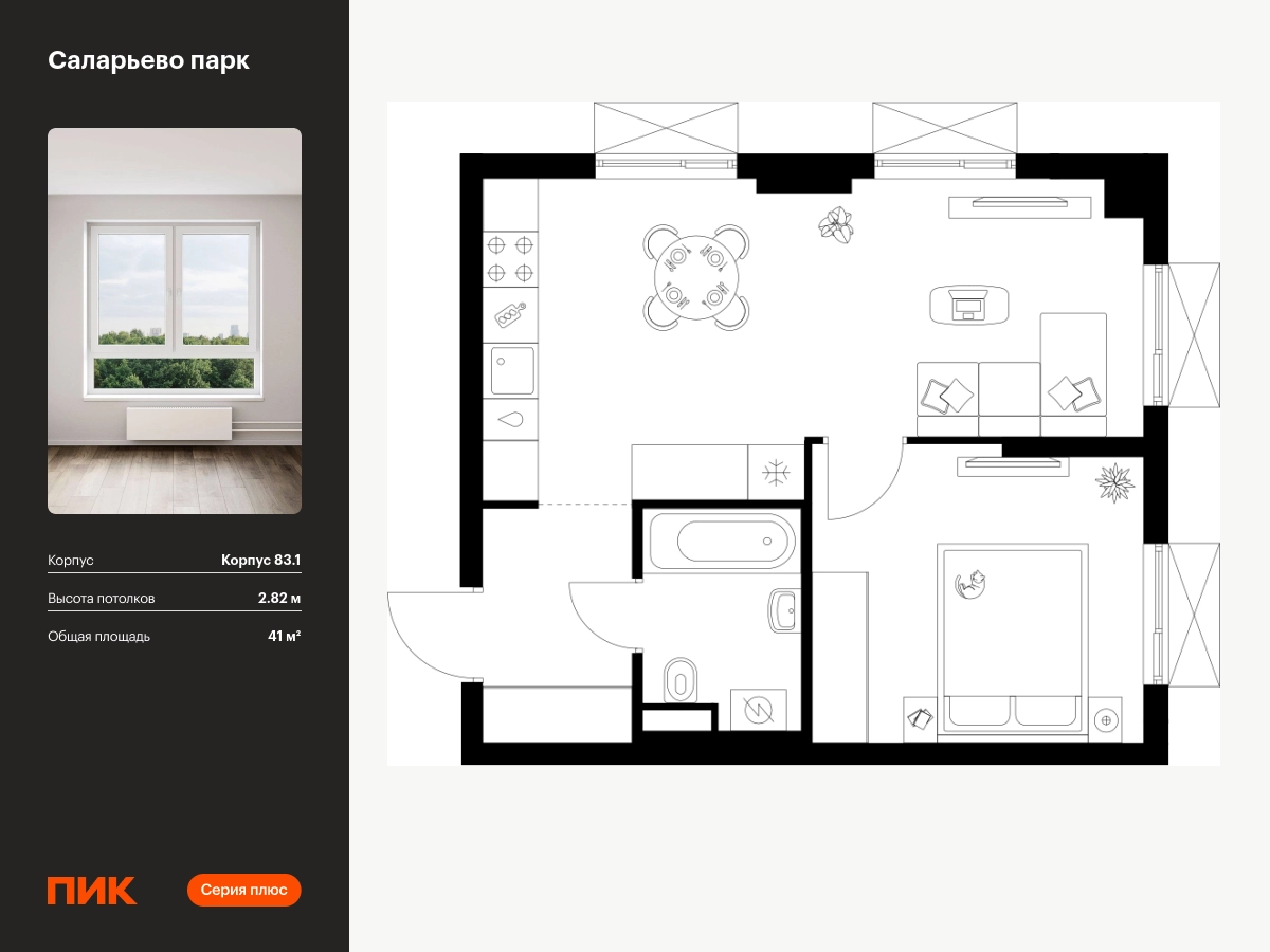 Продаётся 1-комн.квартира площадью 41.00 кв.м на 10 этаже 16 этажного дома (Корпус 83.1, секция 1) проекта ПИК Саларьево парк. Светлый просторный подъезд на уровне земли, функциональная планировка, большие окна. <br> <br>Жилой район «Саларьево парк» расположен в Новой Москве, в четырёх километрах от МКАД по Киевскому шоссе. Две станции метро: «Саларьево» и «Филатов луг» — находятся в пешей доступности от проекта. Дойти до них можно за 5–10 минут. В квартале уже создана качественная среда, где есть абсолютно всё для полноценной жизни, работы и отдыха. <br> <br>«Саларьево парк» — не просто квартал, а полноценный жилой район, который отличается разноплановой архитектурой. Над концепцией квартала работали несколько ведущих архитектурных бюро, которые стремились добиться разнообразия в фасадных решениях. Ярким примером такого подхода станет корпус 83, который относится к «Серии плюс». <br> <br>Новый корпус 83 был создан по принципам южной архитектуры: расслабленный и лаконичный силуэт зданий, привлекающий к себе внимание. Архитектурная изюминка 83-го корпуса — террасы и фигурные балконы. Вместе с окнами и другими акцентными элементами они создают уникальный облик здания, отсылая нас к изысканной южной архитектуре. <br> <br>Все корпуса в квартале гармонично сочетаются, образуя единую городскую среду. Здесь приятно гулять и проводить время на улице всей семьёй. <br> <br>В «Саларьево парке» создана уникальная образовательная среда, включающая в себя шесть школ, рассчитанных на 6 250 учеников. Две из них уже открыты, их посещает 2 300 детей. Также на территории «Саларьево парка» находится 12 детских садов, один из которых с бассейном. Сейчас уже открыты 7 садов. <br> <br>В «Саларьево парке» открыта уникальная игровая площадка — PlayHub «Оригами». Здесь есть ручей, горка-труба и рельефные холмы. Взрослые смогут отдохнуть в уютном кафе, пока дети играют. Также на территории проекта есть SportHub — большая спортивная зона, разделённая по интересам и возрастам. Здесь можно заниматься разными видами спорта: футболом, баскетболом, волейболом и стритболом. Зимой центральную часть площадки превращают в каток. <br> <br>Во дворах-парках жилого квартала есть места для отдыха, детские и спортивные площадки. На первых этажах домов расположены магазины, кафе и полезные сервисы. Также вблизи проекта есть несколько масштабных торговых центров. До ТЦ «Саларис» пять минут пешком, до «Рио», Metro Cash & Carry и «Лемана про» — пять минут на автомобиле. Артикул - 996336О застройщике
