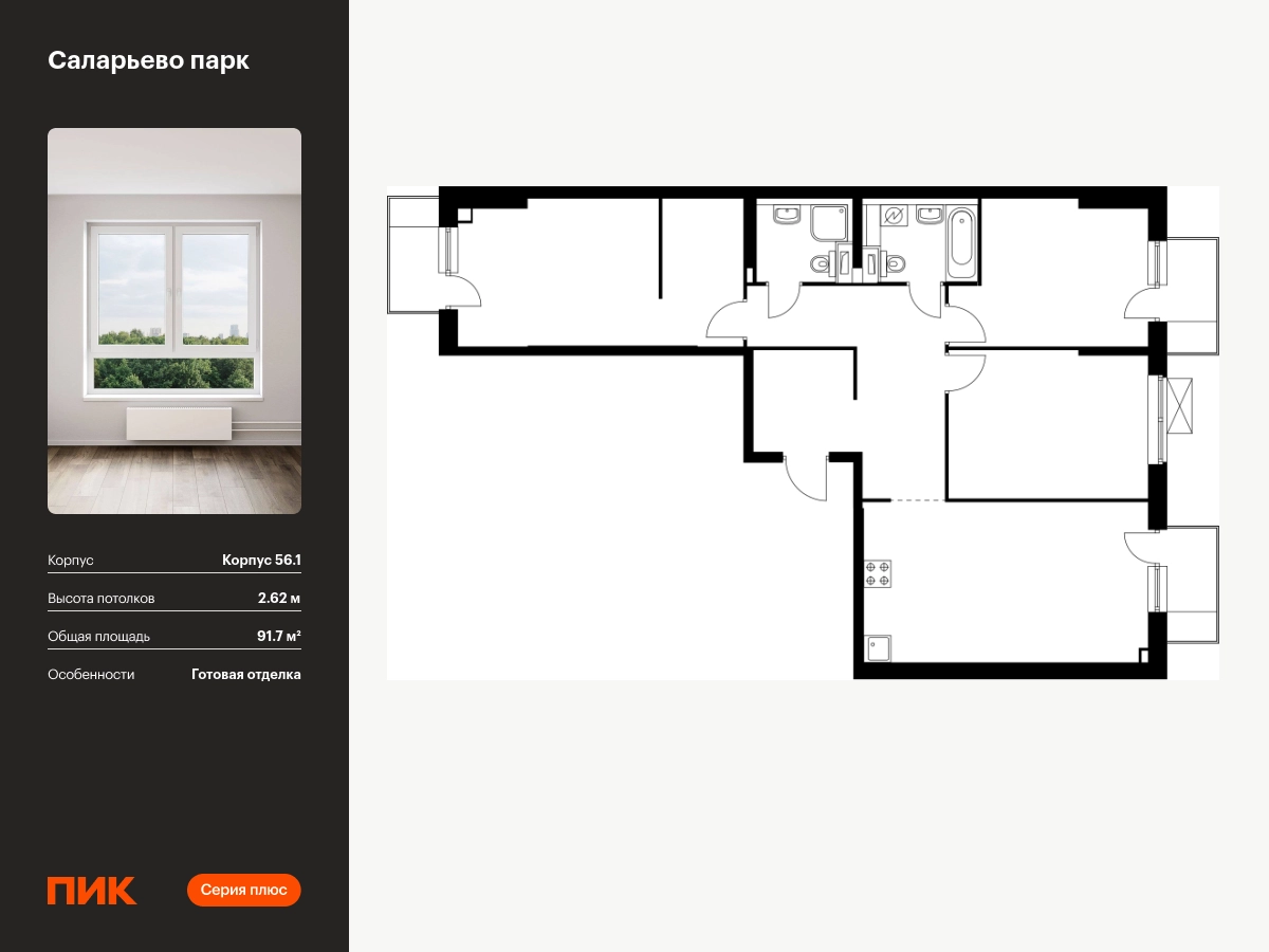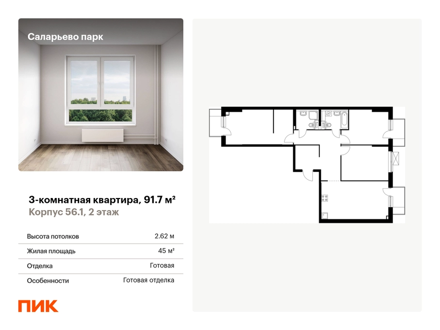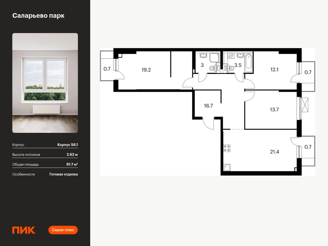 Продаётся 3-комн.квартира площадью 91.70 кв.м на 2 этаже 14 этажного дома (Корпус 56.1, секция 2) проекта ПИК Саларьево парк. Светлый просторный подъезд на уровне земли, функциональная планировка, большие окна, с отделкой. Жилой район «Саларьево парк» расположен в Новой Москве, в четырёх километрах от МКАД по Киевскому шоссе. Две станции метро: «Саларьево» и «Филатов луг» — находятся в пешей доступности от проекта. Дойти до них можно за 5–10 минут. В квартале уже создана качественная среда, где есть абсолютно всё для полноценной жизни, работы и отдыха. «Саларьево парк» — не просто квартал, а полноценный жилой район, который отличается разноплановой архитектурой. Над концепцией квартала работали несколько ведущих архитектурных бюро, которые стремились добиться разнообразия в фасадных решениях. Ярким примером такого подхода станет корпус 83, который относится к «Серии плюс». Новый корпус 83 был создан по принципам южной архитектуры: расслабленный и лаконичный силуэт зданий, привлекающий к себе внимание. Архитектурная изюминка 83-го корпуса — террасы и фигурные балконы. Вместе с окнами и другими акцентными элементами они создают уникальный облик здания, отсылая нас к изысканной южной архитектуре. Все корпуса в квартале гармонично сочетаются, образуя единую городскую среду. Здесь приятно гулять и проводить время на улице всей семьёй. В «Саларьево парке» создана уникальная образовательная среда, включающая в себя шесть школ, рассчитанных на 6 250 учеников. Две из них уже открыты, их посещает 2 300 детей. Также на территории «Саларьево парка» находится 12 детских садов, один из которых с бассейном. Сейчас уже открыты 7 садов. В «Саларьево парке» открыта уникальная игровая площадка — PlayHub «Оригами». Здесь есть ручей, горка-труба и рельефные холмы. Взрослые смогут отдохнуть в уютном кафе, пока дети играют. Также на территории проекта есть SportHub — большая спортивная зона, разделённая по интересам и возрастам. Здесь можно заниматься разными видами спорта: футболом, баскетболом, волейболом и стритболом. Зимой центральную часть площадки превращают в каток. Во дворах-парках жилого квартала есть места для отдыха, детские и спортивные площадки. На первых этажах домов расположены магазины, кафе и полезные сервисы. Также вблизи проекта есть несколько масштабных торговых центров. До ТЦ «Саларис» пять минут пешком, до «Рио», Metro Cash & Carry и «Лемана про» — пять минут на автомобиле. Артикул - 883015О застройщике