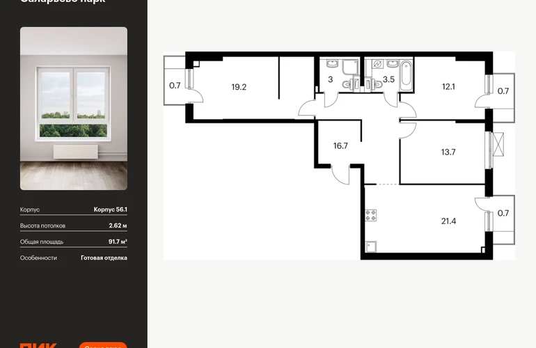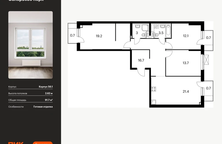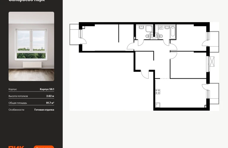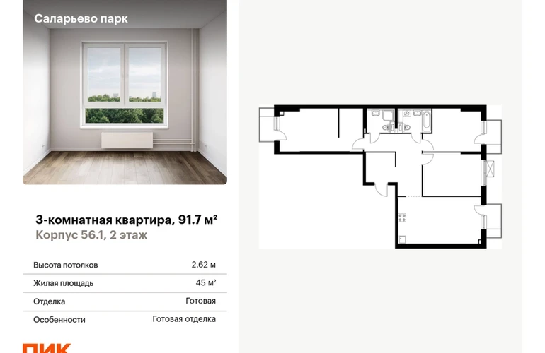 Продаётся 3-комн.квартира площадью 91.70 кв.м на 2 этаже 14 этажного дома (Корпус 56.1, секция 2) проекта ПИК Саларьево парк. Светлый просторный подъезд на уровне земли, функциональная планировка, большие окна, с отделкой. Жилой район «Саларьево парк» расположен в Новой Москве, в четырёх километрах от МКАД по Киевскому шоссе. Две станции метро: «Саларьево» и «Филатов луг» — находятся в пешей доступности от проекта. Дойти до них можно за 5–10 минут. В квартале уже создана качественная среда, где есть абсолютно всё для полноценной жизни, работы и отдыха. «Саларьево парк» — не просто квартал, а полноценный жилой район, который отличается разноплановой архитектурой. Над концепцией квартала работали несколько ведущих архитектурных бюро, которые стремились добиться разнообразия в фасадных решениях. Ярким примером такого подхода станет корпус 83, который относится к «Серии плюс». Новый корпус 83 был создан по принципам южной архитектуры: расслабленный и лаконичный силуэт зданий, привлекающий к себе внимание. Архитектурная изюминка 83-го корпуса — террасы и фигурные балконы. Вместе с окнами и другими акцентными элементами они создают уникальный облик здания, отсылая нас к изысканной южной архитектуре. Все корпуса в квартале гармонично сочетаются, образуя единую городскую среду. Здесь приятно гулять и проводить время на улице всей семьёй. В «Саларьево парке» создана уникальная образовательная среда, включающая в себя шесть школ, рассчитанных на 6 250 учеников. Две из них уже открыты, их посещает 2 300 детей. Также на территории «Саларьево парка» находится 12 детских садов, один из которых с бассейном. Сейчас уже открыты 7 садов. В «Саларьево парке» открыта уникальная игровая площадка — PlayHub «Оригами». Здесь есть ручей, горка-труба и рельефные холмы. Взрослые смогут отдохнуть в уютном кафе, пока дети играют. Также на территории проекта есть SportHub — большая спортивная зона, разделённая по интересам и возрастам. Здесь можно заниматься разными видами спорта: футболом, баскетболом, волейболом и стритболом. Зимой центральную часть площадки превращают в каток. Во дворах-парках жилого квартала есть места для отдыха, детские и спортивные площадки. На первых этажах домов расположены магазины, кафе и полезные сервисы. Также вблизи проекта есть несколько масштабных торговых центров. До ТЦ «Саларис» пять минут пешком, до «Рио», Metro Cash & Carry и «Лемана про» — пять минут на автомобиле. Артикул - 883015О застройщике