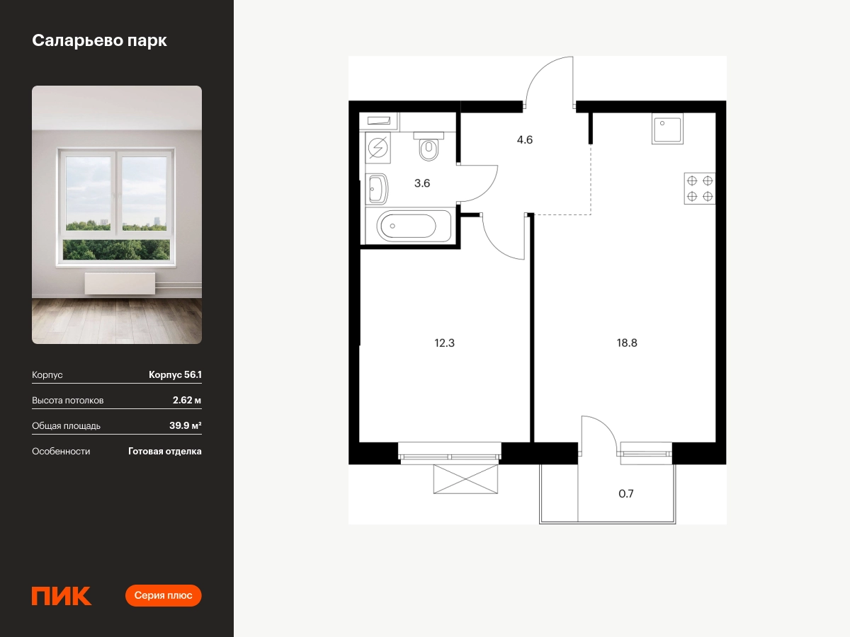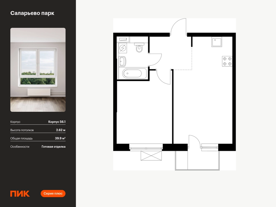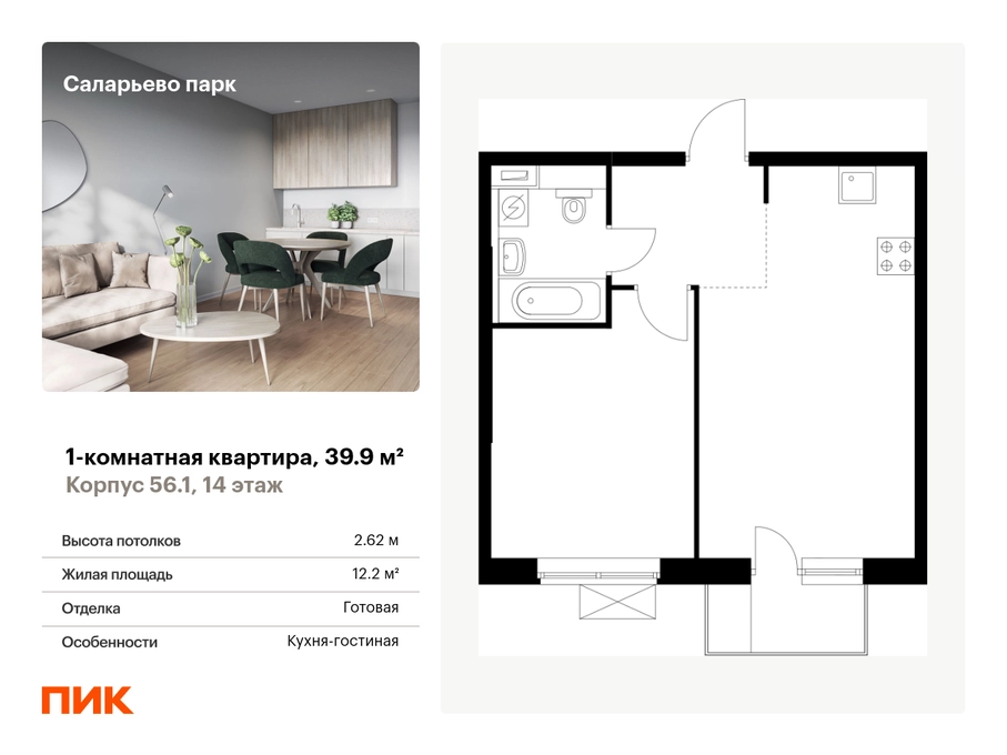 Продаётся 1-комн.квартира площадью 39.90 кв.м на 14 этаже 14 этажного дома (Корпус 56.1, секция 6) проекта ПИК Саларьево парк. Светлый просторный подъезд на уровне земли, функциональная планировка, большие окна, с отделкой. Жилой район «Саларьево парк» расположен в Новой Москве, в четырёх километрах от МКАД по Киевскому шоссе. Две станции метро: «Саларьево» и «Филатов луг» — находятся в пешей доступности от проекта. Дойти до них можно за 5–10 минут. В квартале уже создана качественная среда, где есть абсолютно всё для полноценной жизни, работы и отдыха. «Саларьево парк» — не просто квартал, а полноценный жилой район, который отличается разноплановой архитектурой. Над концепцией квартала работали несколько ведущих архитектурных бюро, которые стремились добиться разнообразия в фасадных решениях. Ярким примером такого подхода станет корпус 83, который относится к «Серии плюс». Новый корпус 83 был создан по принципам южной архитектуры: расслабленный и лаконичный силуэт зданий, привлекающий к себе внимание. Архитектурная изюминка 83-го корпуса — террасы и фигурные балконы. Вместе с окнами и другими акцентными элементами они создают уникальный облик здания, отсылая нас к изысканной южной архитектуре. Все корпуса в квартале гармонично сочетаются, образуя единую городскую среду. Здесь приятно гулять и проводить время на улице всей семьёй. В «Саларьево парке» создана уникальная образовательная среда, включающая в себя шесть школ, рассчитанных на 6 250 учеников. Две из них уже открыты, их посещает 2 300 детей. Также на территории «Саларьево парка» находится 12 детских садов, один из которых с бассейном. Сейчас уже открыты 7 садов. В «Саларьево парке» открыта уникальная игровая площадка — PlayHub «Оригами». Здесь есть ручей, горка-труба и рельефные холмы. Взрослые смогут отдохнуть в уютном кафе, пока дети играют. Также на территории проекта есть SportHub — большая спортивная зона, разделённая по интересам и возрастам. Здесь можно заниматься разными видами спорта: футболом, баскетболом, волейболом и стритболом. Зимой центральную часть площадки превращают в каток. Во дворах-парках жилого квартала есть места для отдыха, детские и спортивные площадки. На первых этажах домов расположены магазины, кафе и полезные сервисы. Также вблизи проекта есть несколько масштабных торговых центров. До ТЦ «Саларис» пять минут пешком, до «Рио», Metro Cash & Carry и «Лемана про» — пять минут на автомобиле. Артикул - 883564О застройщике