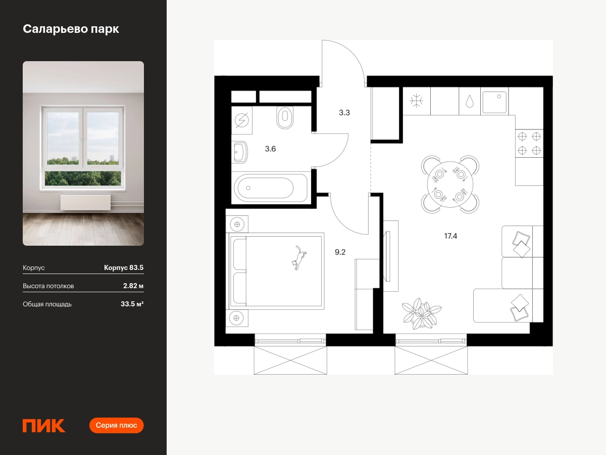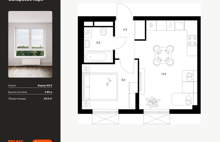 Продаётся 1-комн.квартира площадью 33.50 кв.м на 2 этаже 16 этажного дома (Корпус 83.5, секция 5) проекта ПИК Саларьево парк. Светлый просторный подъезд на уровне земли, функциональная планировка, большие окна. <br> <br>Жилой район «Саларьево парк» расположен в Новой Москве, в четырёх километрах от МКАД по Киевскому шоссе. Две станции метро: «Саларьево» и «Филатов луг» — находятся в пешей доступности от проекта. Дойти до них можно за 5–10 минут. В квартале уже создана качественная среда, где есть абсолютно всё для полноценной жизни, работы и отдыха. <br> <br>«Саларьево парк» — не просто квартал, а полноценный жилой район, который отличается разноплановой архитектурой. Над концепцией квартала работали несколько ведущих архитектурных бюро, которые стремились добиться разнообразия в фасадных решениях. Ярким примером такого подхода станет корпус 83, который относится к «Серии плюс». <br> <br>Новый корпус 83 был создан по принципам южной архитектуры: расслабленный и лаконичный силуэт зданий, привлекающий к себе внимание. Архитектурная изюминка 83-го корпуса — террасы и фигурные балконы. Вместе с окнами и другими акцентными элементами они создают уникальный облик здания, отсылая нас к изысканной южной архитектуре. <br> <br>Все корпуса в квартале гармонично сочетаются, образуя единую городскую среду. Здесь приятно гулять и проводить время на улице всей семьёй. <br> <br>В «Саларьево парке» создана уникальная образовательная среда, включающая в себя шесть школ, рассчитанных на 6 250 учеников. Две из них уже открыты, их посещает 2 300 детей. Также на территории «Саларьево парка» находится 12 детских садов, один из которых с бассейном. Сейчас уже открыты 7 садов. <br> <br>В «Саларьево парке» открыта уникальная игровая площадка — PlayHub «Оригами». Здесь есть ручей, горка-труба и рельефные холмы. Взрослые смогут отдохнуть в уютном кафе, пока дети играют. Также на территории проекта есть SportHub — большая спортивная зона, разделённая по интересам и возрастам. Здесь можно заниматься разными видами спорта: футболом, баскетболом, волейболом и стритболом. Зимой центральную часть площадки превращают в каток. <br> <br>Во дворах-парках жилого квартала есть места для отдыха, детские и спортивные площадки. На первых этажах домов расположены магазины, кафе и полезные сервисы. Также вблизи проекта есть несколько масштабных торговых центров. До ТЦ «Саларис» пять минут пешком, до «Рио», Metro Cash & Carry и «Лемана про» — пять минут на автомобиле. Артикул - 996692О застройщике