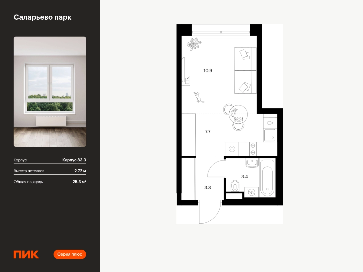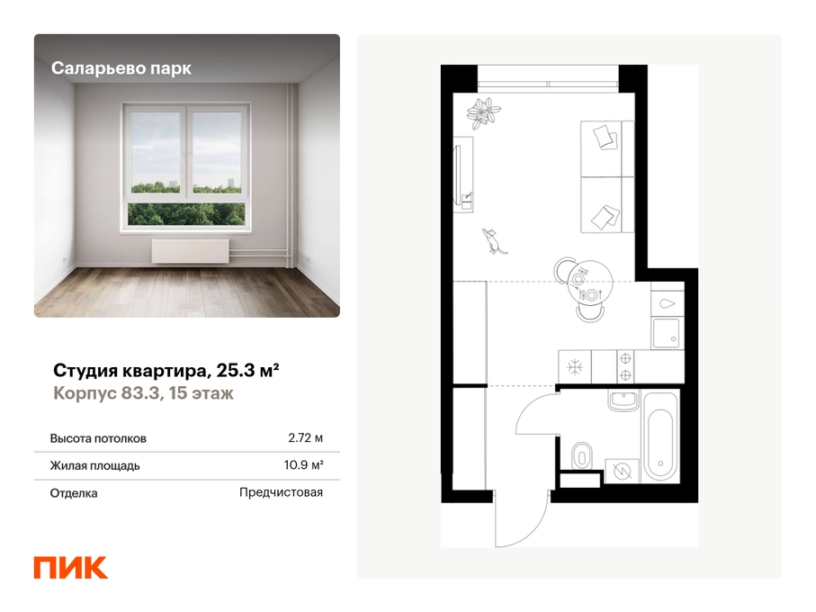 Продаётся квартира-студия площадью 25.30 кв.м на 15 этаже 18 этажного дома (Корпус 83.3, секция 3) проекта ПИК Саларьево парк. Светлый просторный подъезд на уровне земли, функциональная планировка, большие окна, с отделкой. Жилой район «Саларьево парк» расположен в Новой Москве, в четырёх километрах от МКАД по Киевскому шоссе. Две станции метро: «Саларьево» и «Филатов луг» — находятся в пешей доступности от проекта. Дойти до них можно за 5–10 минут. В квартале уже создана качественная среда, где есть абсолютно всё для полноценной жизни, работы и отдыха. «Саларьево парк» — не просто квартал, а полноценный жилой район, который отличается разноплановой архитектурой. Над концепцией квартала работали несколько ведущих архитектурных бюро, которые стремились добиться разнообразия в фасадных решениях. Ярким примером такого подхода станет корпус 83, который относится к «Серии плюс». Новый корпус 83 был создан по принципам южной архитектуры: расслабленный и лаконичный силуэт зданий, привлекающий к себе внимание. Архитектурная изюминка 83-го корпуса — террасы и фигурные балконы. Вместе с окнами и другими акцентными элементами они создают уникальный облик здания, отсылая нас к изысканной южной архитектуре. Все корпуса в квартале гармонично сочетаются, образуя единую городскую среду. Здесь приятно гулять и проводить время на улице всей семьёй. В «Саларьево парке» создана уникальная образовательная среда, включающая в себя шесть школ, рассчитанных на 6 250 учеников. Две из них уже открыты, их посещает 2 300 детей. Также на территории «Саларьево парка» находится 12 детских садов, один из которых с бассейном. Сейчас уже открыты 7 садов. В «Саларьево парке» открыта уникальная игровая площадка — PlayHub «Оригами». Здесь есть ручей, горка-труба и рельефные холмы. Взрослые смогут отдохнуть в уютном кафе, пока дети играют. Также на территории проекта есть SportHub — большая спортивная зона, разделённая по интересам и возрастам. Здесь можно заниматься разными видами спорта: футболом, баскетболом, волейболом и стритболом. Зимой центральную часть площадки превращают в каток. Во дворах-парках жилого квартала есть места для отдыха, детские и спортивные площадки. На первых этажах домов расположены магазины, кафе и полезные сервисы. Также вблизи проекта есть несколько масштабных торговых центров. До ТЦ «Саларис» пять минут пешком, до «Рио», Metro Cash & Carry и «Лемана про» — пять минут на автомобиле. Артикул - 996572О застройщике