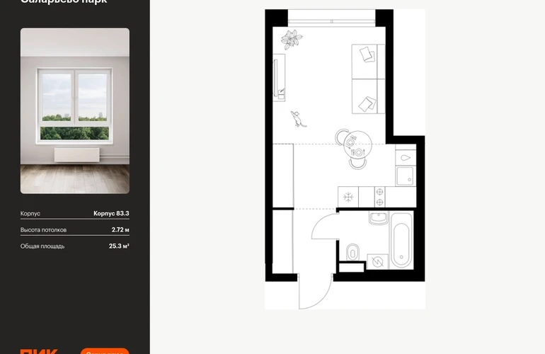 Продаётся квартира-студия площадью 25.30 кв.м на 15 этаже 18 этажного дома (Корпус 83.3, секция 3) проекта ПИК Саларьево парк. Светлый просторный подъезд на уровне земли, функциональная планировка, большие окна, с отделкой. Жилой район «Саларьево парк» расположен в Новой Москве, в четырёх километрах от МКАД по Киевскому шоссе. Две станции метро: «Саларьево» и «Филатов луг» — находятся в пешей доступности от проекта. Дойти до них можно за 5–10 минут. В квартале уже создана качественная среда, где есть абсолютно всё для полноценной жизни, работы и отдыха. «Саларьево парк» — не просто квартал, а полноценный жилой район, который отличается разноплановой архитектурой. Над концепцией квартала работали несколько ведущих архитектурных бюро, которые стремились добиться разнообразия в фасадных решениях. Ярким примером такого подхода станет корпус 83, который относится к «Серии плюс». Новый корпус 83 был создан по принципам южной архитектуры: расслабленный и лаконичный силуэт зданий, привлекающий к себе внимание. Архитектурная изюминка 83-го корпуса — террасы и фигурные балконы. Вместе с окнами и другими акцентными элементами они создают уникальный облик здания, отсылая нас к изысканной южной архитектуре. Все корпуса в квартале гармонично сочетаются, образуя единую городскую среду. Здесь приятно гулять и проводить время на улице всей семьёй. В «Саларьево парке» создана уникальная образовательная среда, включающая в себя шесть школ, рассчитанных на 6 250 учеников. Две из них уже открыты, их посещает 2 300 детей. Также на территории «Саларьево парка» находится 12 детских садов, один из которых с бассейном. Сейчас уже открыты 7 садов. В «Саларьево парке» открыта уникальная игровая площадка — PlayHub «Оригами». Здесь есть ручей, горка-труба и рельефные холмы. Взрослые смогут отдохнуть в уютном кафе, пока дети играют. Также на территории проекта есть SportHub — большая спортивная зона, разделённая по интересам и возрастам. Здесь можно заниматься разными видами спорта: футболом, баскетболом, волейболом и стритболом. Зимой центральную часть площадки превращают в каток. Во дворах-парках жилого квартала есть места для отдыха, детские и спортивные площадки. На первых этажах домов расположены магазины, кафе и полезные сервисы. Также вблизи проекта есть несколько масштабных торговых центров. До ТЦ «Саларис» пять минут пешком, до «Рио», Metro Cash & Carry и «Лемана про» — пять минут на автомобиле. Артикул - 996572О застройщике