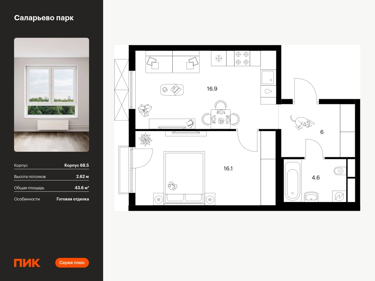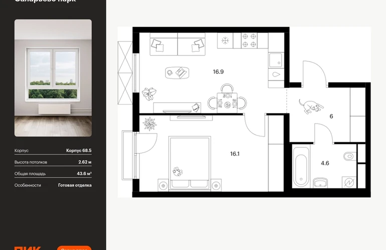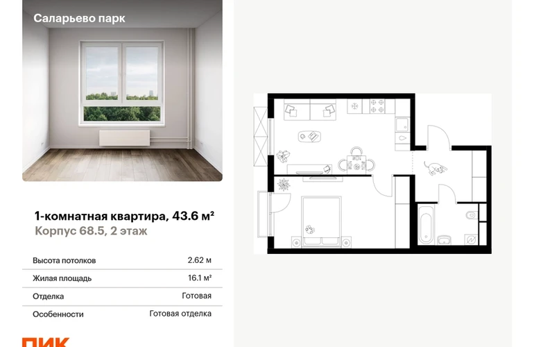 Продаётся 1-комн.квартира площадью 43.60 кв.м на 2 этаже 24 этажного дома (Корпус 68.5, секция 5) проекта ПИК Саларьево парк. Светлый просторный подъезд на уровне земли, функциональная планировка, большие окна, с отделкой. <br> <br>Жилой район «Саларьево парк» расположен в Новой Москве, в четырёх километрах от МКАД по Киевскому шоссе. Две станции метро: «Саларьево» и «Филатов луг» — находятся в пешей доступности от проекта. Дойти до них можно за 5–10 минут. В квартале уже создана качественная среда, где есть абсолютно всё для полноценной жизни, работы и отдыха. <br> <br>«Саларьево парк» — не просто квартал, а полноценный жилой район, который отличается разноплановой архитектурой. Над концепцией квартала работали несколько ведущих архитектурных бюро, которые стремились добиться разнообразия в фасадных решениях. Ярким примером такого подхода станет корпус 83, который относится к «Серии плюс». <br> <br>Новый корпус 83 был создан по принципам южной архитектуры: расслабленный и лаконичный силуэт зданий, привлекающий к себе внимание. Архитектурная изюминка 83-го корпуса — террасы и фигурные балконы. Вместе с окнами и другими акцентными элементами они создают уникальный облик здания, отсылая нас к изысканной южной архитектуре. <br> <br>Все корпуса в квартале гармонично сочетаются, образуя единую городскую среду. Здесь приятно гулять и проводить время на улице всей семьёй. <br> <br>В «Саларьево парке» создана уникальная образовательная среда, включающая в себя шесть школ, рассчитанных на 6 250 учеников. Две из них уже открыты, их посещает 2 300 детей. Также на территории «Саларьево парка» находится 12 детских садов, один из которых с бассейном. Сейчас уже открыты 7 садов. <br> <br>В «Саларьево парке» открыта уникальная игровая площадка — PlayHub «Оригами». Здесь есть ручей, горка-труба и рельефные холмы. Взрослые смогут отдохнуть в уютном кафе, пока дети играют. Также на территории проекта есть SportHub — большая спортивная зона, разделённая по интересам и возрастам. Здесь можно заниматься разными видами спорта: футболом, баскетболом, волейболом и стритболом. Зимой центральную часть площадки превращают в каток. <br> <br>Во дворах-парках жилого квартала есть места для отдыха, детские и спортивные площадки. На первых этажах домов расположены магазины, кафе и полезные сервисы. Также вблизи проекта есть несколько масштабных торговых центров. До ТЦ «Саларис» пять минут пешком, до «Рио», Metro Cash & Carry и «Лемана про» — пять минут на автомобиле. Артикул - 867344О застройщике