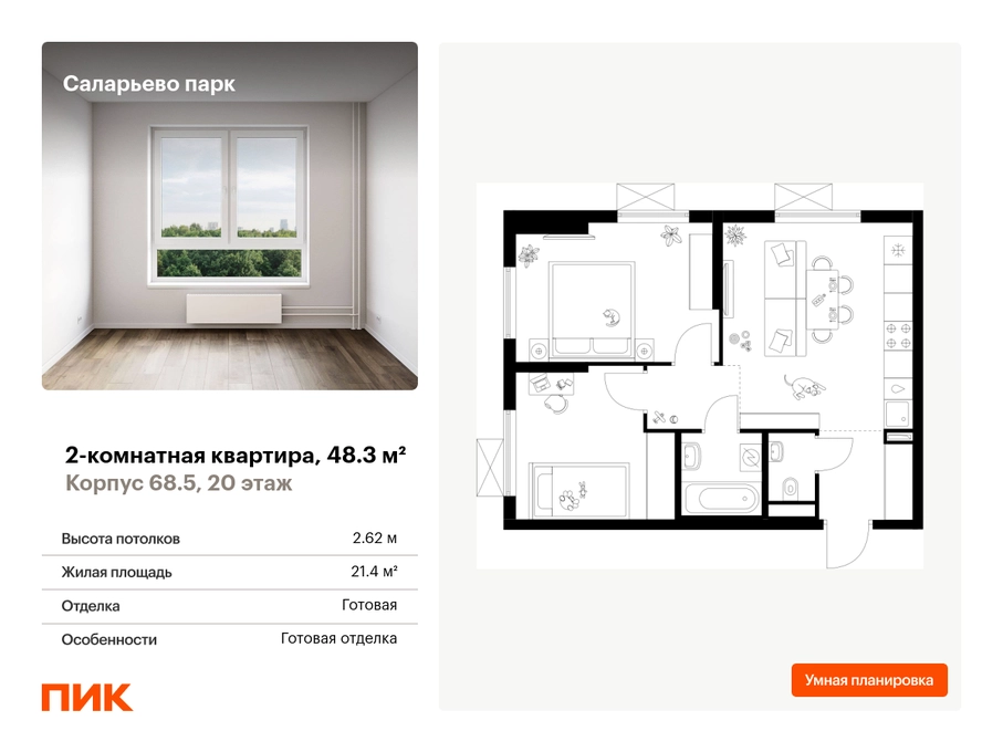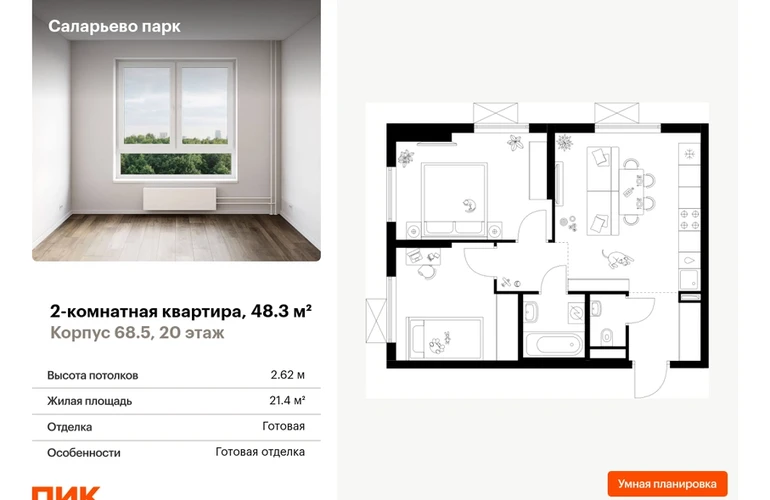 Продаётся 2-комн.квартира площадью 48.30 кв.м на 20 этаже 24 этажного дома (Корпус 68.5, секция 5) проекта ПИК Саларьево парк. Светлый просторный подъезд на уровне земли, функциональная планировка, большие окна, с отделкой. <br> <br>Жилой район «Саларьево парк» расположен в Новой Москве, в четырёх километрах от МКАД по Киевскому шоссе. Две станции метро: «Саларьево» и «Филатов луг» — находятся в пешей доступности от проекта. Дойти до них можно за 5–10 минут. В квартале уже создана качественная среда, где есть абсолютно всё для полноценной жизни, работы и отдыха. <br> <br>«Саларьево парк» — не просто квартал, а полноценный жилой район, который отличается разноплановой архитектурой. Над концепцией квартала работали несколько ведущих архитектурных бюро, которые стремились добиться разнообразия в фасадных решениях. Ярким примером такого подхода станет корпус 83, который относится к «Серии плюс». <br> <br>Новый корпус 83 был создан по принципам южной архитектуры: расслабленный и лаконичный силуэт зданий, привлекающий к себе внимание. Архитектурная изюминка 83-го корпуса — террасы и фигурные балконы. Вместе с окнами и другими акцентными элементами они создают уникальный облик здания, отсылая нас к изысканной южной архитектуре. <br> <br>Все корпуса в квартале гармонично сочетаются, образуя единую городскую среду. Здесь приятно гулять и проводить время на улице всей семьёй. <br> <br>В «Саларьево парке» создана уникальная образовательная среда, включающая в себя шесть школ, рассчитанных на 6 250 учеников. Две из них уже открыты, их посещает 2 300 детей. Также на территории «Саларьево парка» находится 12 детских садов, один из которых с бассейном. Сейчас уже открыты 7 садов. <br> <br>В «Саларьево парке» открыта уникальная игровая площадка — PlayHub «Оригами». Здесь есть ручей, горка-труба и рельефные холмы. Взрослые смогут отдохнуть в уютном кафе, пока дети играют. Также на территории проекта есть SportHub — большая спортивная зона, разделённая по интересам и возрастам. Здесь можно заниматься разными видами спорта: футболом, баскетболом, волейболом и стритболом. Зимой центральную часть площадки превращают в каток. <br> <br>Во дворах-парках жилого квартала есть места для отдыха, детские и спортивные площадки. На первых этажах домов расположены магазины, кафе и полезные сервисы. Также вблизи проекта есть несколько масштабных торговых центров. До ТЦ «Саларис» пять минут пешком, до «Рио», Metro Cash & Carry и «Лемана про» — пять минут на автомобиле. Артикул - 868213О застройщике