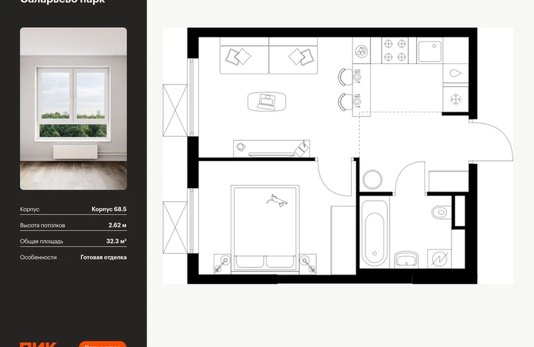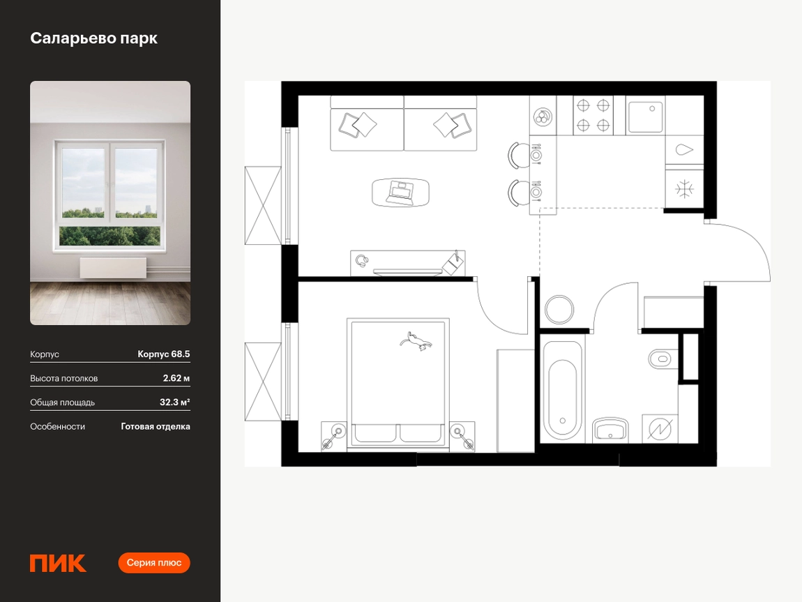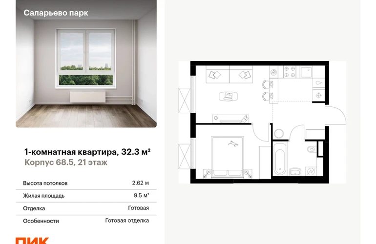 Продаётся 1-комн.квартира площадью 32.30 кв.м на 21 этаже 24 этажного дома (Корпус 68.5, секция 5) проекта ПИК Саларьево парк. Светлый просторный подъезд на уровне земли, функциональная планировка, большие окна, с отделкой. <br> <br>Жилой район «Саларьево парк» расположен в Новой Москве, в четырёх километрах от МКАД по Киевскому шоссе. Две станции метро: «Саларьево» и «Филатов луг» — находятся в пешей доступности от проекта. Дойти до них можно за 5–10 минут. В квартале уже создана качественная среда, где есть абсолютно всё для полноценной жизни, работы и отдыха. <br> <br>«Саларьево парк» — не просто квартал, а полноценный жилой район, который отличается разноплановой архитектурой. Над концепцией квартала работали несколько ведущих архитектурных бюро, которые стремились добиться разнообразия в фасадных решениях. Ярким примером такого подхода станет корпус 83, который относится к «Серии плюс». <br> <br>Новый корпус 83 был создан по принципам южной архитектуры: расслабленный и лаконичный силуэт зданий, привлекающий к себе внимание. Архитектурная изюминка 83-го корпуса — террасы и фигурные балконы. Вместе с окнами и другими акцентными элементами они создают уникальный облик здания, отсылая нас к изысканной южной архитектуре. <br> <br>Все корпуса в квартале гармонично сочетаются, образуя единую городскую среду. Здесь приятно гулять и проводить время на улице всей семьёй. <br> <br>В «Саларьево парке» создана уникальная образовательная среда, включающая в себя шесть школ, рассчитанных на 6 250 учеников. Две из них уже открыты, их посещает 2 300 детей. Также на территории «Саларьево парка» находится 12 детских садов, один из которых с бассейном. Сейчас уже открыты 7 садов. <br> <br>В «Саларьево парке» открыта уникальная игровая площадка — PlayHub «Оригами». Здесь есть ручей, горка-труба и рельефные холмы. Взрослые смогут отдохнуть в уютном кафе, пока дети играют. Также на территории проекта есть SportHub — большая спортивная зона, разделённая по интересам и возрастам. Здесь можно заниматься разными видами спорта: футболом, баскетболом, волейболом и стритболом. Зимой центральную часть площадки превращают в каток. <br> <br>Во дворах-парках жилого квартала есть места для отдыха, детские и спортивные площадки. На первых этажах домов расположены магазины, кафе и полезные сервисы. Также вблизи проекта есть несколько масштабных торговых центров. До ТЦ «Саларис» пять минут пешком, до «Рио», Metro Cash & Carry и «Лемана про» — пять минут на автомобиле. Артикул - 868228О застройщике