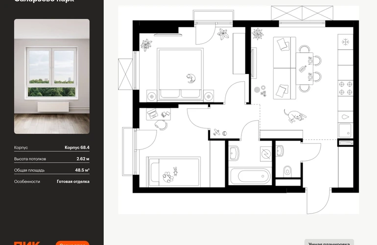 Продаётся 2-комн.квартира площадью 48.50 кв.м на 6 этаже 24 этажного дома (Корпус 68.4, секция 1) проекта ПИК Саларьево парк. Светлый просторный подъезд на уровне земли, функциональная планировка, большие окна, с отделкой. <br> <br>Жилой район «Саларьево парк» расположен в Новой Москве, в четырёх километрах от МКАД по Киевскому шоссе. Две станции метро: «Саларьево» и «Филатов луг» — находятся в пешей доступности от проекта. Дойти до них можно за 5–10 минут. В квартале уже создана качественная среда, где есть абсолютно всё для полноценной жизни, работы и отдыха. <br> <br>«Саларьево парк» — не просто квартал, а полноценный жилой район, который отличается разноплановой архитектурой. Над концепцией квартала работали несколько ведущих архитектурных бюро, которые стремились добиться разнообразия в фасадных решениях. Ярким примером такого подхода станет корпус 83, который относится к «Серии плюс». <br> <br>Новый корпус 83 был создан по принципам южной архитектуры: расслабленный и лаконичный силуэт зданий, привлекающий к себе внимание. Архитектурная изюминка 83-го корпуса — террасы и фигурные балконы. Вместе с окнами и другими акцентными элементами они создают уникальный облик здания, отсылая нас к изысканной южной архитектуре. <br> <br>Все корпуса в квартале гармонично сочетаются, образуя единую городскую среду. Здесь приятно гулять и проводить время на улице всей семьёй. <br> <br>В «Саларьево парке» создана уникальная образовательная среда, включающая в себя шесть школ, рассчитанных на 6 250 учеников. Две из них уже открыты, их посещает 2 300 детей. Также на территории «Саларьево парка» находится 12 детских садов, один из которых с бассейном. Сейчас уже открыты 7 садов. <br> <br>В «Саларьево парке» открыта уникальная игровая площадка — PlayHub «Оригами». Здесь есть ручей, горка-труба и рельефные холмы. Взрослые смогут отдохнуть в уютном кафе, пока дети играют. Также на территории проекта есть SportHub — большая спортивная зона, разделённая по интересам и возрастам. Здесь можно заниматься разными видами спорта: футболом, баскетболом, волейболом и стритболом. Зимой центральную часть площадки превращают в каток. <br> <br>Во дворах-парках жилого квартала есть места для отдыха, детские и спортивные площадки. На первых этажах домов расположены магазины, кафе и полезные сервисы. Также вблизи проекта есть несколько масштабных торговых центров. До ТЦ «Саларис» пять минут пешком, до «Рио», Metro Cash & Carry и «Леруа Мерлен» — пять минут на автомобиле. Артикул - 867041О застройщике