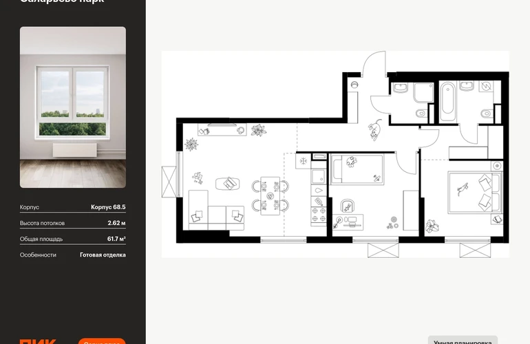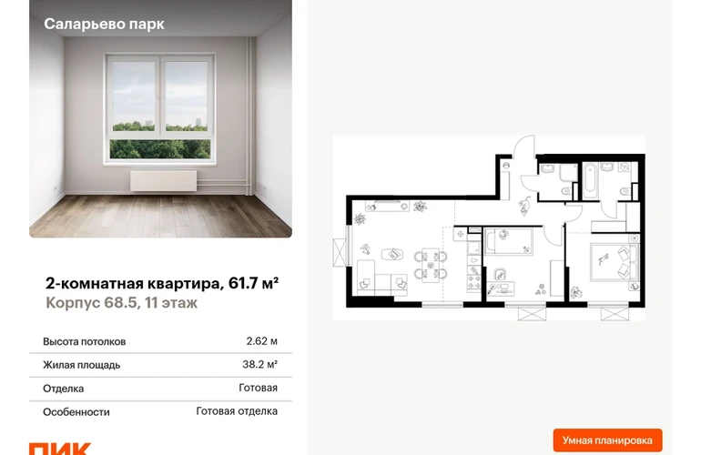 Продаётся 2-комн.квартира площадью 61.70 кв.м на 11 этаже 24 этажного дома (Корпус 68.5, секция 5) проекта ПИК Саларьево парк. Светлый просторный подъезд на уровне земли, функциональная планировка, большие окна, с отделкой. <br> <br>Жилой район «Саларьево парк» расположен в Новой Москве, в четырёх километрах от МКАД по Киевскому шоссе. Две станции метро: «Саларьево» и «Филатов луг» — находятся в пешей доступности от проекта. Дойти до них можно за 5–10 минут. В квартале уже создана качественная среда, где есть абсолютно всё для полноценной жизни, работы и отдыха. <br> <br>«Саларьево парк» — не просто квартал, а полноценный жилой район, который отличается разноплановой архитектурой. Над концепцией квартала работали несколько ведущих архитектурных бюро, которые стремились добиться разнообразия в фасадных решениях. Ярким примером такого подхода станет корпус 83, который относится к «Серии плюс». <br> <br>Новый корпус 83 был создан по принципам южной архитектуры: расслабленный и лаконичный силуэт зданий, привлекающий к себе внимание. Архитектурная изюминка 83-го корпуса — террасы и фигурные балконы. Вместе с окнами и другими акцентными элементами они создают уникальный облик здания, отсылая нас к изысканной южной архитектуре. <br> <br>Все корпуса в квартале гармонично сочетаются, образуя единую городскую среду. Здесь приятно гулять и проводить время на улице всей семьёй. <br> <br>В «Саларьево парке» создана уникальная образовательная среда, включающая в себя шесть школ, рассчитанных на 6 250 учеников. Две из них уже открыты, их посещает 2 300 детей. Также на территории «Саларьево парка» находится 12 детских садов, один из которых с бассейном. Сейчас уже открыты 7 садов. <br> <br>В «Саларьево парке» открыта уникальная игровая площадка — PlayHub «Оригами». Здесь есть ручей, горка-труба и рельефные холмы. Взрослые смогут отдохнуть в уютном кафе, пока дети играют. Также на территории проекта есть SportHub — большая спортивная зона, разделённая по интересам и возрастам. Здесь можно заниматься разными видами спорта: футболом, баскетболом, волейболом и стритболом. Зимой центральную часть площадки превращают в каток. <br> <br>Во дворах-парках жилого квартала есть места для отдыха, детские и спортивные площадки. На первых этажах домов расположены магазины, кафе и полезные сервисы. Также вблизи проекта есть несколько масштабных торговых центров. До ТЦ «Саларис» пять минут пешком, до «Рио», Metro Cash & Carry и «Лемана про» — пять минут на автомобиле. Артикул - 867888О застройщике