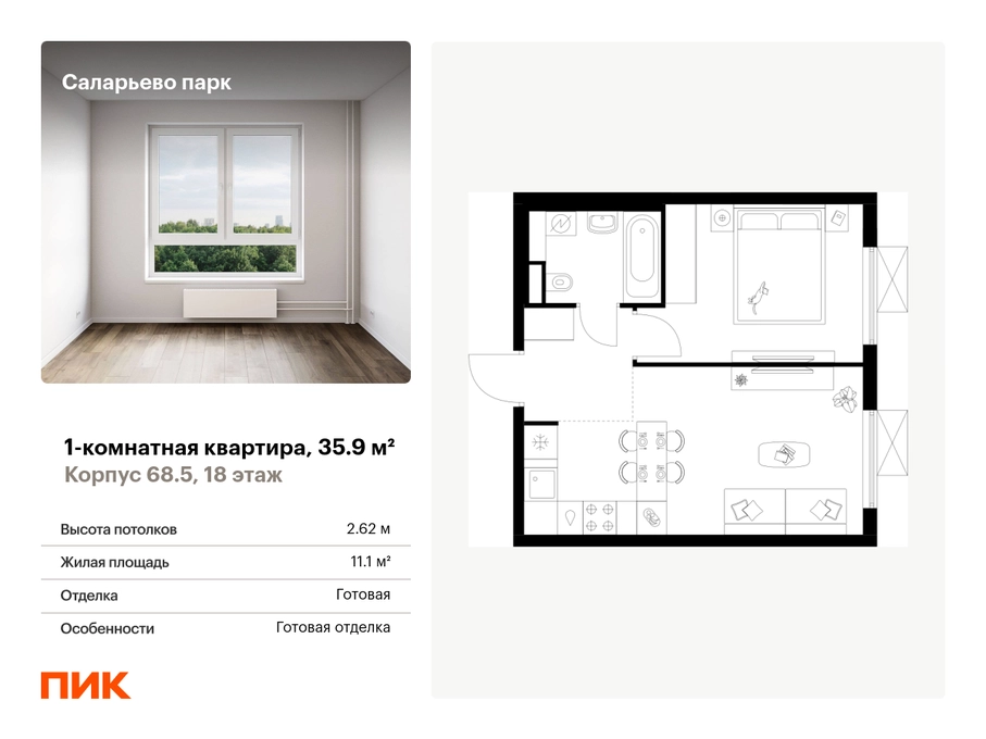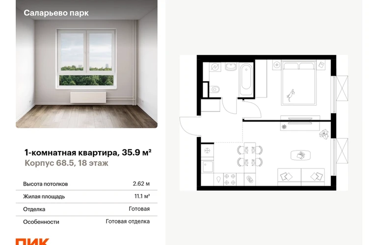 Продаётся 1-комн.квартира площадью 35.90 кв.м на 18 этаже 24 этажного дома (Корпус 68.5, секция 5) проекта ПИК Саларьево парк. Светлый просторный подъезд на уровне земли, функциональная планировка, большие окна, с отделкой. <br> <br>Жилой район «Саларьево парк» расположен в Новой Москве, в четырёх километрах от МКАД по Киевскому шоссе. Две станции метро: «Саларьево» и «Филатов луг» — находятся в пешей доступности от проекта. Дойти до них можно за 5–10 минут. В квартале уже создана качественная среда, где есть абсолютно всё для полноценной жизни, работы и отдыха. <br> <br>«Саларьево парк» — не просто квартал, а полноценный жилой район, который отличается разноплановой архитектурой. Над концепцией квартала работали несколько ведущих архитектурных бюро, которые стремились добиться разнообразия в фасадных решениях. Ярким примером такого подхода станет корпус 83, который относится к «Серии плюс». <br> <br>Новый корпус 83 был создан по принципам южной архитектуры: расслабленный и лаконичный силуэт зданий, привлекающий к себе внимание. Архитектурная изюминка 83-го корпуса — террасы и фигурные балконы. Вместе с окнами и другими акцентными элементами они создают уникальный облик здания, отсылая нас к изысканной южной архитектуре. <br> <br>Все корпуса в квартале гармонично сочетаются, образуя единую городскую среду. Здесь приятно гулять и проводить время на улице всей семьёй. <br> <br>В «Саларьево парке» создана уникальная образовательная среда, включающая в себя шесть школ, рассчитанных на 6 250 учеников. Две из них уже открыты, их посещает 2 300 детей. Также на территории «Саларьево парка» находится 12 детских садов, один из которых с бассейном. Сейчас уже открыты 7 садов. <br> <br>В «Саларьево парке» открыта уникальная игровая площадка — PlayHub «Оригами». Здесь есть ручей, горка-труба и рельефные холмы. Взрослые смогут отдохнуть в уютном кафе, пока дети играют. Также на территории проекта есть SportHub — большая спортивная зона, разделённая по интересам и возрастам. Здесь можно заниматься разными видами спорта: футболом, баскетболом, волейболом и стритболом. Зимой центральную часть площадки превращают в каток. <br> <br>Во дворах-парках жилого квартала есть места для отдыха, детские и спортивные площадки. На первых этажах домов расположены магазины, кафе и полезные сервисы. Также вблизи проекта есть несколько масштабных торговых центров. До ТЦ «Саларис» пять минут пешком, до «Рио», Metro Cash & Carry и «Леруа Мерлен» — пять минут на автомобиле. Артикул - 868163О застройщике