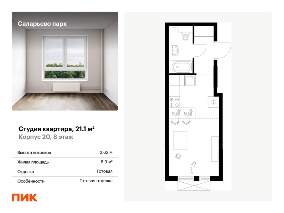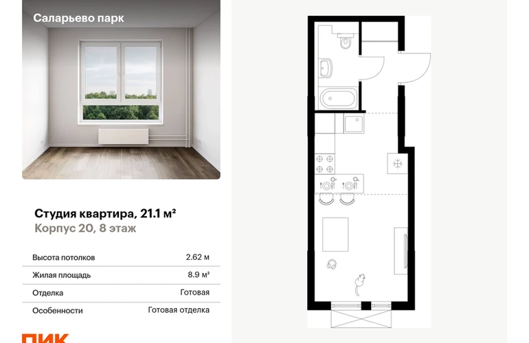 Продаётся квартира-студия площадью 21.10 кв.м на 8 этаже 17 этажного дома (Корпус 20, секция 1) проекта ПИК Саларьево парк. Светлый просторный подъезд на уровне земли, функциональная планировка, большие окна, с отделкой. <br> <br>Жилой район «Саларьево парк» расположен в Новой Москве, в четырёх километрах от МКАД по Киевскому шоссе. Две станции метро: «Саларьево» и «Филатов луг» — находятся в пешей доступности от проекта. Дойти до них можно за 5–10 минут. В квартале уже создана качественная среда, где есть абсолютно всё для полноценной жизни, работы и отдыха. <br> <br>«Саларьево парк» — не просто квартал, а полноценный жилой район, который отличается разноплановой архитектурой. Над концепцией квартала работали несколько ведущих архитектурных бюро, которые стремились добиться разнообразия в фасадных решениях. Ярким примером такого подхода станет корпус 83, который относится к «Серии плюс». <br> <br>Новый корпус 83 был создан по принципам южной архитектуры: расслабленный и лаконичный силуэт зданий, привлекающий к себе внимание. Архитектурная изюминка 83-го корпуса — террасы и фигурные балконы. Вместе с окнами и другими акцентными элементами они создают уникальный облик здания, отсылая нас к изысканной южной архитектуре. <br> <br>Все корпуса в квартале гармонично сочетаются, образуя единую городскую среду. Здесь приятно гулять и проводить время на улице всей семьёй. <br> <br>В «Саларьево парке» создана уникальная образовательная среда, включающая в себя шесть школ, рассчитанных на 6 250 учеников. Две из них уже открыты, их посещает 2 300 детей. Также на территории «Саларьево парка» находится 12 детских садов, один из которых с бассейном. Сейчас уже открыты 7 садов. <br> <br>В «Саларьево парке» открыта уникальная игровая площадка — PlayHub «Оригами». Здесь есть ручей, горка-труба и рельефные холмы. Взрослые смогут отдохнуть в уютном кафе, пока дети играют. Также на территории проекта есть SportHub — большая спортивная зона, разделённая по интересам и возрастам. Здесь можно заниматься разными видами спорта: футболом, баскетболом, волейболом и стритболом. Зимой центральную часть площадки превращают в каток. <br> <br>Во дворах-парках жилого квартала есть места для отдыха, детские и спортивные площадки. На первых этажах домов расположены магазины, кафе и полезные сервисы. Также вблизи проекта есть несколько масштабных торговых центров. До ТЦ «Саларис» пять минут пешком, до «Рио», Metro Cash & Carry и «Лемана про» — пять минут на автомобиле. Артикул - 946707О застройщике