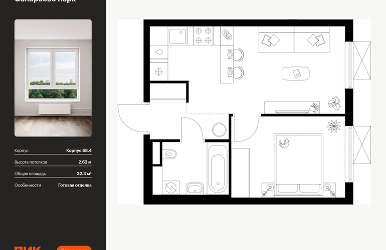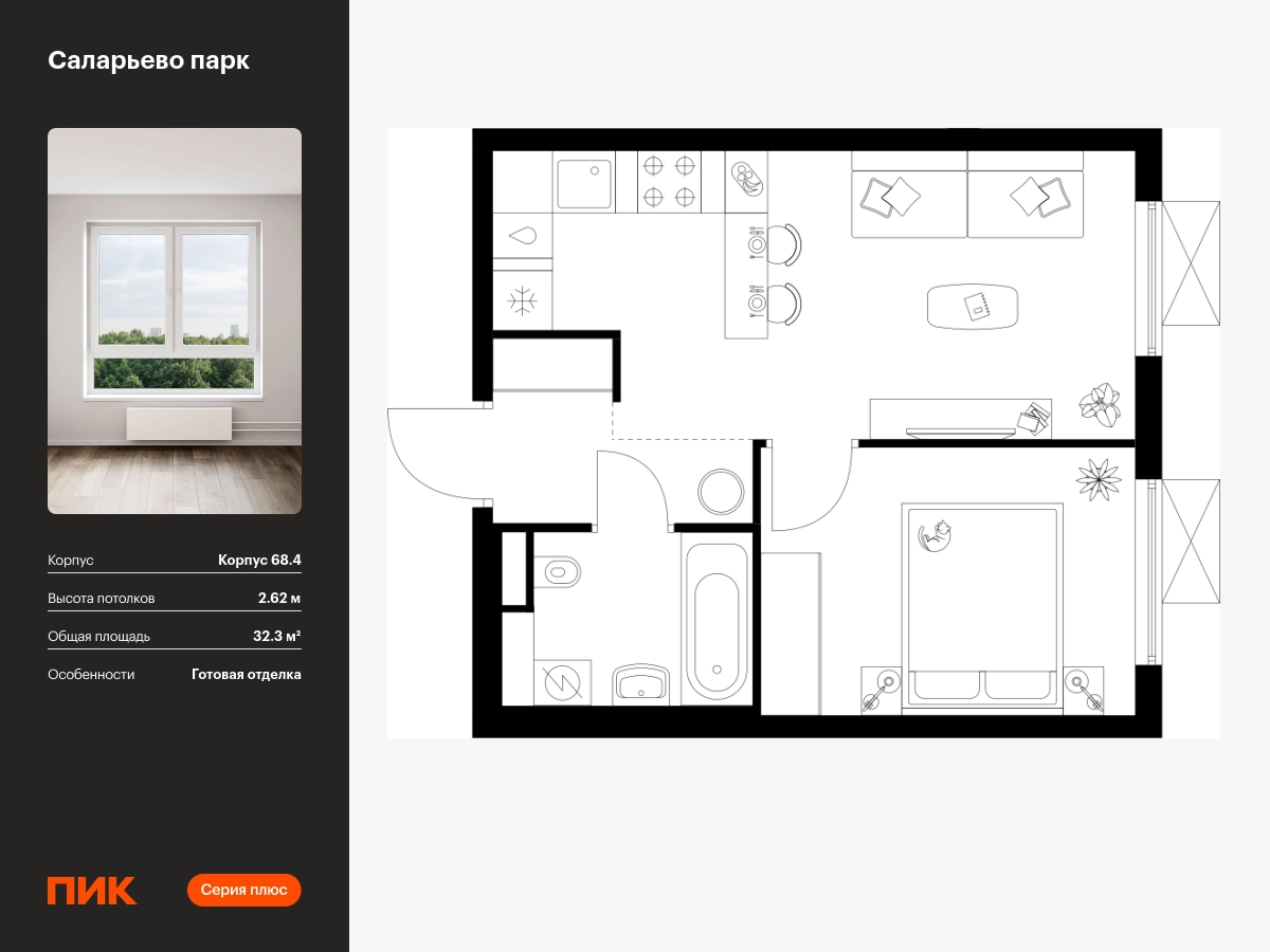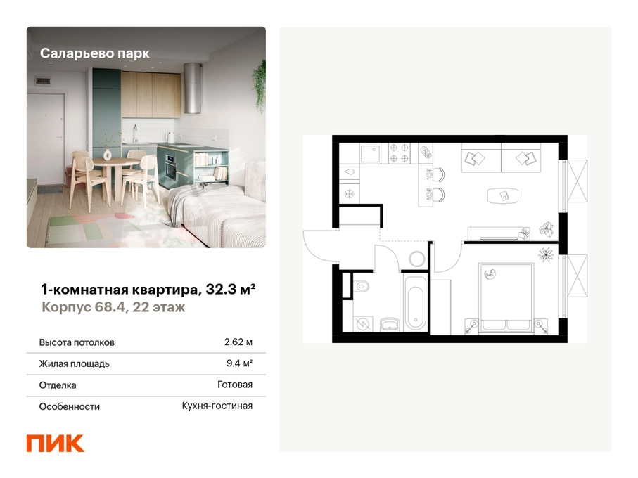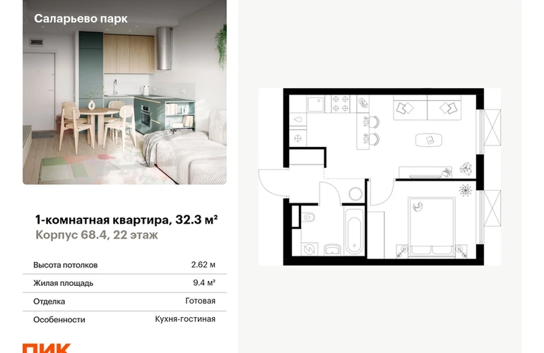 Продаётся 1-комн.квартира площадью 32.30 кв.м на 22 этаже 24 этажного дома (Корпус 68.4, секция 1) проекта ПИК Саларьево парк. Светлый просторный подъезд на уровне земли, функциональная планировка, большие окна, с отделкой. <br> <br>Жилой район «Саларьево парк» расположен в Новой Москве, в четырёх километрах от МКАД по Киевскому шоссе. Две станции метро: «Саларьево» и «Филатов луг» — находятся в пешей доступности от проекта. Дойти до них можно за 5–10 минут. В квартале уже создана качественная среда, где есть абсолютно всё для полноценной жизни, работы и отдыха. <br> <br>«Саларьево парк» — не просто квартал, а полноценный жилой район, который отличается разноплановой архитектурой. Над концепцией квартала работали несколько ведущих архитектурных бюро, которые стремились добиться разнообразия в фасадных решениях. Ярким примером такого подхода станет корпус 83, который относится к «Серии плюс». <br> <br>Новый корпус 83 был создан по принципам южной архитектуры: расслабленный и лаконичный силуэт зданий, привлекающий к себе внимание. Архитектурная изюминка 83-го корпуса — террасы и фигурные балконы. Вместе с окнами и другими акцентными элементами они создают уникальный облик здания, отсылая нас к изысканной южной архитектуре. <br> <br>Все корпуса в квартале гармонично сочетаются, образуя единую городскую среду. Здесь приятно гулять и проводить время на улице всей семьёй. <br> <br>В «Саларьево парке» создана уникальная образовательная среда, включающая в себя шесть школ, рассчитанных на 6 250 учеников. Две из них уже открыты, их посещает 2 300 детей. Также на территории «Саларьево парка» находится 12 детских садов, один из которых с бассейном. Сейчас уже открыты 7 садов. <br> <br>В «Саларьево парке» открыта уникальная игровая площадка — PlayHub «Оригами». Здесь есть ручей, горка-труба и рельефные холмы. Взрослые смогут отдохнуть в уютном кафе, пока дети играют. Также на территории проекта есть SportHub — большая спортивная зона, разделённая по интересам и возрастам. Здесь можно заниматься разными видами спорта: футболом, баскетболом, волейболом и стритболом. Зимой центральную часть площадки превращают в каток. <br> <br>Во дворах-парках жилого квартала есть места для отдыха, детские и спортивные площадки. На первых этажах домов расположены магазины, кафе и полезные сервисы. Также вблизи проекта есть несколько масштабных торговых центров. До ТЦ «Саларис» пять минут пешком, до «Рио», Metro Cash & Carry и «Лемана про» — пять минут на автомобиле. Артикул - 867653О застройщике