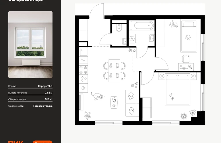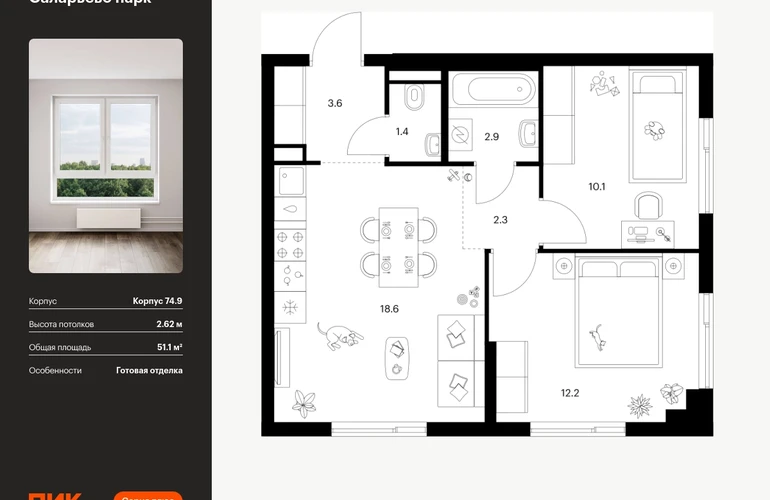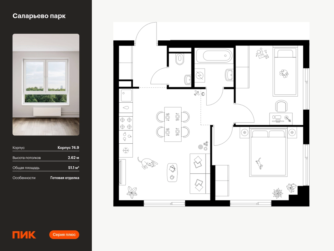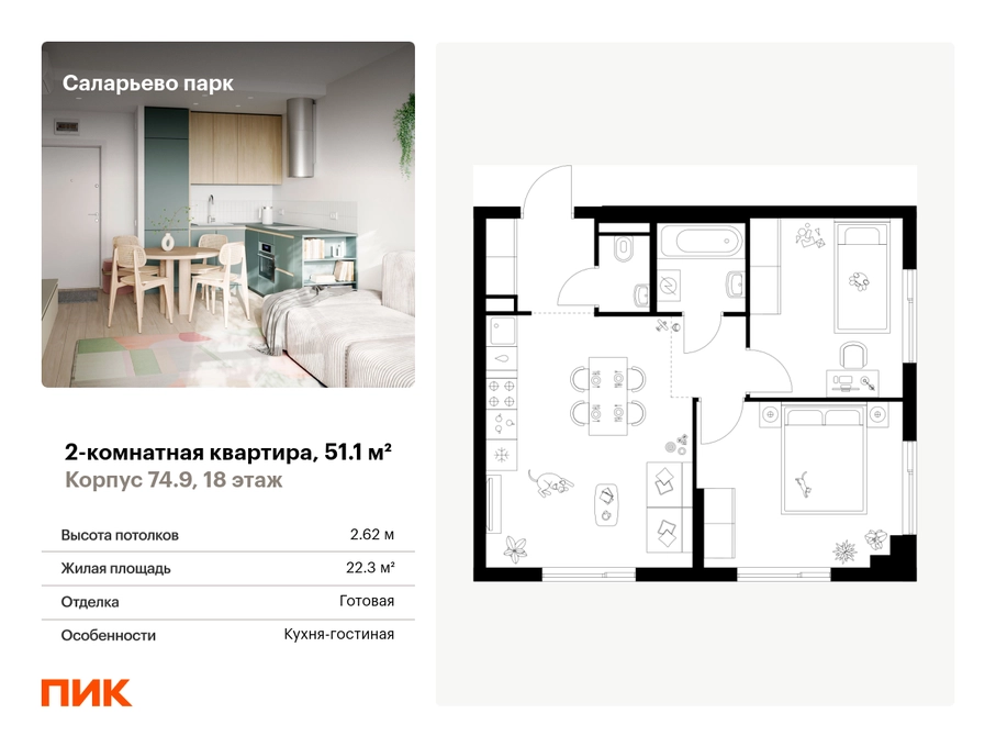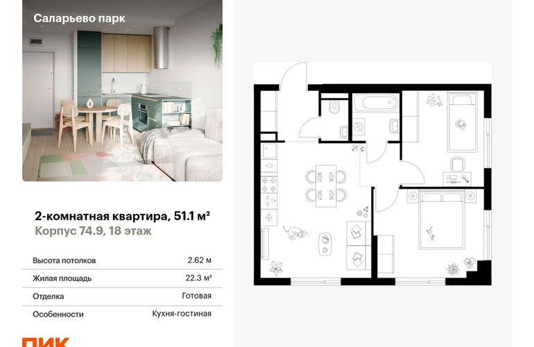 Продаётся 2-комн.квартира площадью 51.10 кв.м на 18 этаже 18 этажного дома (Корпус 74.9, секция 9) проекта ПИК Саларьево парк. Светлый просторный подъезд на уровне земли, функциональная планировка, большие окна, с отделкой. Жилой район «Саларьево парк» расположен в Новой Москве, в четырёх километрах от МКАД по Киевскому шоссе. Две станции метро: «Саларьево» и «Филатов луг», — находятся в пешей доступности от проекта. Дойти до них можно за 5–10 минут. В квартале уже создана качественная среда, где есть абсолютно всё для полноценной жизни, работы и отдыха. «Саларьево парк» — не просто квартал, а полноценный жилой район, который отличается разноплановой архитектурой. Над концепцией квартала работали несколько ведущих архитектурных бюро, которые стремились добиться разнообразия в фасадных решениях. Ярким примером такого подхода станут корпуса 82 и 83, которые относятся к «Серии плюс». Новый корпус 83 был создан по принципам южной архитектуры: расслабленный и лаконичный силуэт зданий, привлекающий к себе внимание. Архитектурная изюминка 83-го корпуса — террасы и фигурные балконы. Вместе с окнами и другими акцентными элементами они создают уникальный облик здания, отсылая нас к изысканной южной архитектуре. Все корпуса в квартале гармонично сочетаются, образуя единую городскую среду. Здесь приятно гулять и проводить время на улице всей семьёй. В «Саларьево парке» создана уникальная образовательная среда, включающая в себя шесть школ, рассчитанных на 6 250 учеников. Четыре из них уже открыты, их посещает 2 300 детей. Также на территории «Саларьево парка» находится 12 детских садов, один из которых с бассейном. Сейчас уже открыты 8 садов. В «Саларьево парке» открыта уникальная игровая площадка — PlayHub «Оригами». Здесь есть ручей, горка-труба и рельефные холмы. Взрослые смогут отдохнуть в уютном кафе, пока дети играют. Также на территории проекта есть SportHub — большая спортивная зона, разделённая по интересам и возрастам. Здесь можно заниматься разными видами спорта: футболом, баскетболом, волейболом и стритболом. Зимой центральную часть площадки превращают в каток. Во дворах-парках жилого квартала есть места для отдыха, детские и спортивные площадки. На первых этажах домов расположены магазины, кафе и полезные сервисы. Также вблизи проекта есть несколько масштабных торговых центров. До ТЦ «Саларис» пять минут пешком, до «Рио», Metro Cash & Carry и «Леруа Мерлен» — пять минут на автомобиле. Артикул - 1007473О застройщике