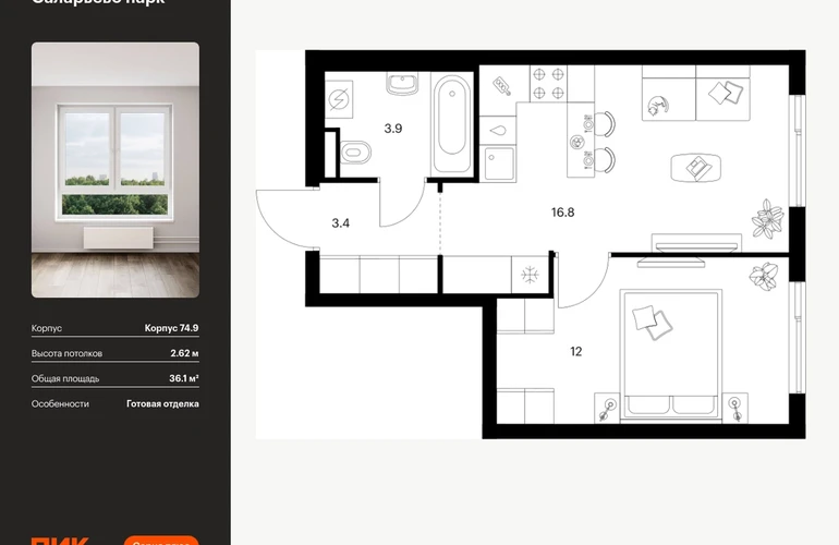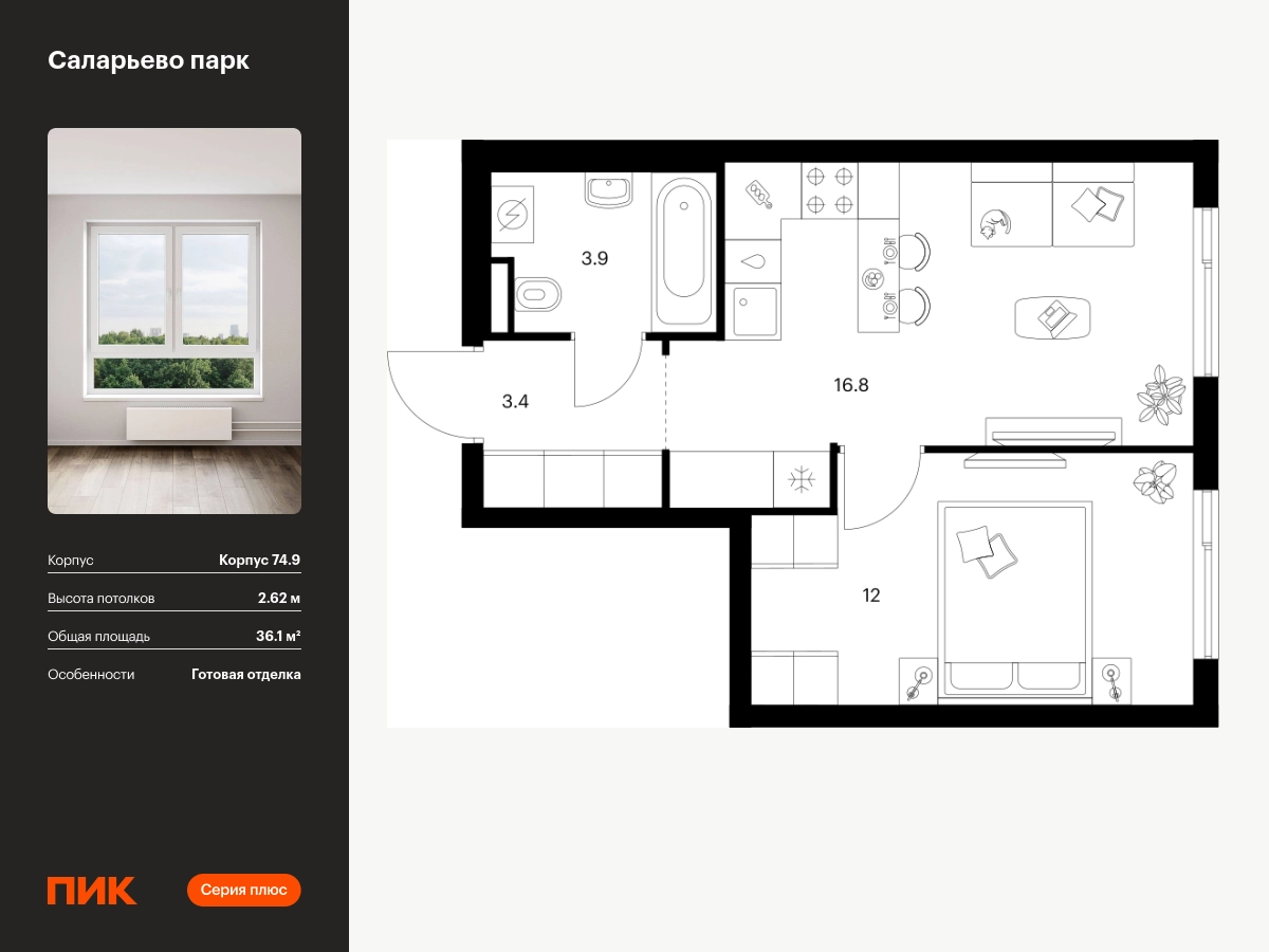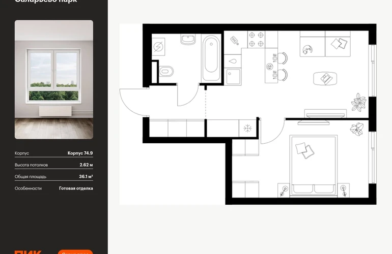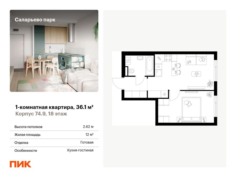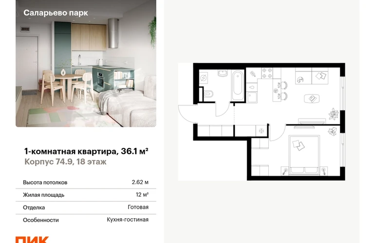 Продаётся 1-комн.квартира площадью 36.10 кв.м на 18 этаже 18 этажного дома (Корпус 74.9, секция 9) проекта ПИК Саларьево парк. Светлый просторный подъезд на уровне земли, функциональная планировка, большие окна, с отделкой. Жилой район «Саларьево парк» расположен в Новой Москве, в четырёх километрах от МКАД по Киевскому шоссе. Две станции метро: «Саларьево» и «Филатов луг», — находятся в пешей доступности от проекта. Дойти до них можно за 5–10 минут. В квартале уже создана качественная среда, где есть абсолютно всё для полноценной жизни, работы и отдыха. «Саларьево парк» — не просто квартал, а полноценный жилой район, который отличается разноплановой архитектурой. Над концепцией квартала работали несколько ведущих архитектурных бюро, которые стремились добиться разнообразия в фасадных решениях. Ярким примером такого подхода станут корпуса 82 и 83, которые относятся к «Серии плюс». Новый корпус 83 был создан по принципам южной архитектуры: расслабленный и лаконичный силуэт зданий, привлекающий к себе внимание. Архитектурная изюминка 83-го корпуса — террасы и фигурные балконы. Вместе с окнами и другими акцентными элементами они создают уникальный облик здания, отсылая нас к изысканной южной архитектуре. Все корпуса в квартале гармонично сочетаются, образуя единую городскую среду. Здесь приятно гулять и проводить время на улице всей семьёй. В «Саларьево парке» создана уникальная образовательная среда, включающая в себя шесть школ, рассчитанных на 6 250 учеников. Четыре из них уже открыты, их посещает 2 300 детей. Также на территории «Саларьево парка» находится 12 детских садов, один из которых с бассейном. Сейчас уже открыты 8 садов. В «Саларьево парке» открыта уникальная игровая площадка — PlayHub «Оригами». Здесь есть ручей, горка-труба и рельефные холмы. Взрослые смогут отдохнуть в уютном кафе, пока дети играют. Также на территории проекта есть SportHub — большая спортивная зона, разделённая по интересам и возрастам. Здесь можно заниматься разными видами спорта: футболом, баскетболом, волейболом и стритболом. Зимой центральную часть площадки превращают в каток. Во дворах-парках жилого квартала есть места для отдыха, детские и спортивные площадки. На первых этажах домов расположены магазины, кафе и полезные сервисы. Также вблизи проекта есть несколько масштабных торговых центров. До ТЦ «Саларис» пять минут пешком, до «Рио», Metro Cash & Carry и «Леруа Мерлен» — пять минут на автомобиле. Артикул - 1007483О застройщике