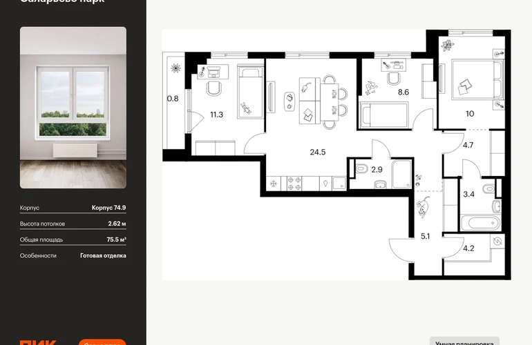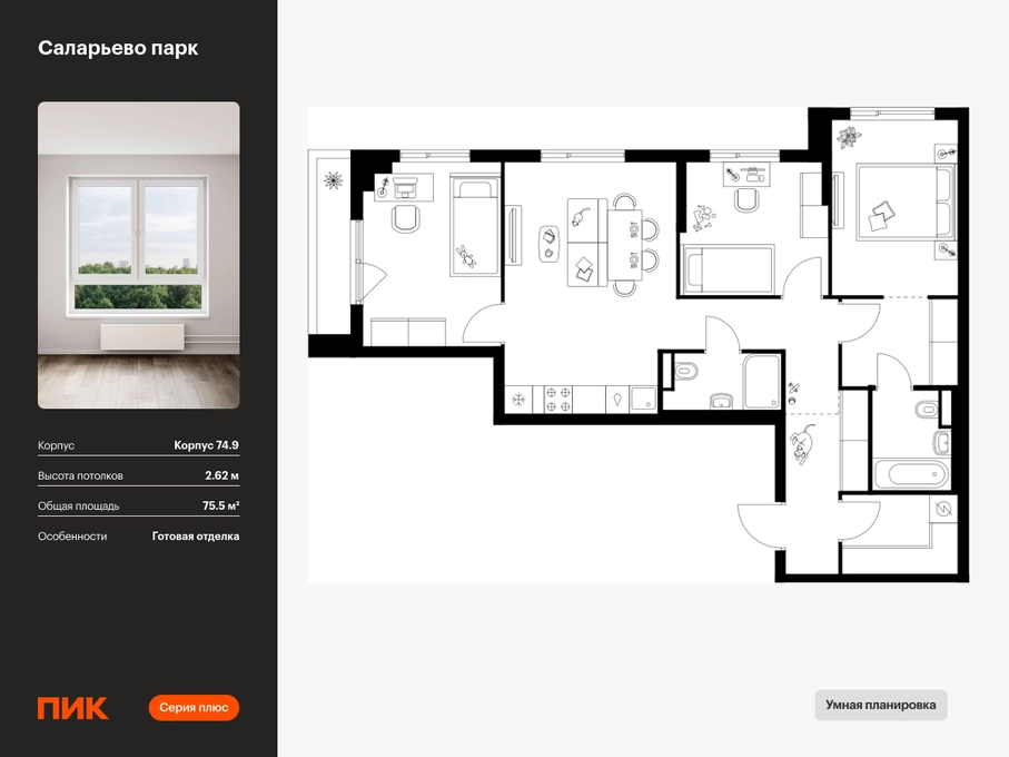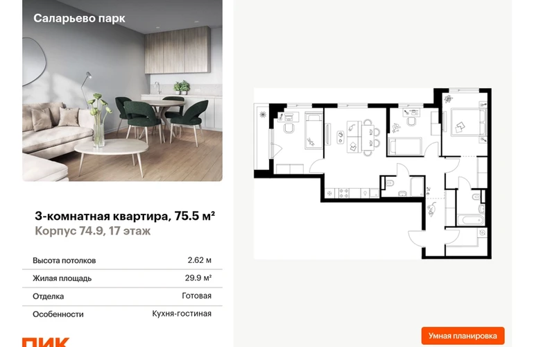 Продаётся 3-комн.квартира площадью 75.50 кв.м на 17 этаже 18 этажного дома (Корпус 74.9, секция 9) проекта ПИК Саларьево парк. Светлый просторный подъезд на уровне земли, функциональная планировка, большие окна, с отделкой. Жилой район «Саларьево парк» расположен в Новой Москве, в четырёх километрах от МКАД по Киевскому шоссе. Две станции метро: «Саларьево» и «Филатов луг» — находятся в пешей доступности от проекта. Дойти до них можно за 5–10 минут. В квартале уже создана качественная среда, где есть абсолютно всё для полноценной жизни, работы и отдыха. «Саларьево парк» — не просто квартал, а полноценный жилой район, который отличается разноплановой архитектурой. Над концепцией квартала работали несколько ведущих архитектурных бюро, которые стремились добиться разнообразия в фасадных решениях. Ярким примером такого подхода станет корпус 83, который относится к «Серии плюс». Новый корпус 83 был создан по принципам южной архитектуры: расслабленный и лаконичный силуэт зданий, привлекающий к себе внимание. Архитектурная изюминка 83-го корпуса — террасы и фигурные балконы. Вместе с окнами и другими акцентными элементами они создают уникальный облик здания, отсылая нас к изысканной южной архитектуре. Все корпуса в квартале гармонично сочетаются, образуя единую городскую среду. Здесь приятно гулять и проводить время на улице всей семьёй. В «Саларьево парке» создана уникальная образовательная среда, включающая в себя шесть школ, рассчитанных на 6 250 учеников. Две из них уже открыты, их посещает 2 300 детей. Также на территории «Саларьево парка» находится 12 детских садов, один из которых с бассейном. Сейчас уже открыты 7 садов. В «Саларьево парке» открыта уникальная игровая площадка — PlayHub «Оригами». Здесь есть ручей, горка-труба и рельефные холмы. Взрослые смогут отдохнуть в уютном кафе, пока дети играют. Также на территории проекта есть SportHub — большая спортивная зона, разделённая по интересам и возрастам. Здесь можно заниматься разными видами спорта: футболом, баскетболом, волейболом и стритболом. Зимой центральную часть площадки превращают в каток. Во дворах-парках жилого квартала есть места для отдыха, детские и спортивные площадки. На первых этажах домов расположены магазины, кафе и полезные сервисы. Также вблизи проекта есть несколько масштабных торговых центров. До ТЦ «Саларис» пять минут пешком, до «Рио», Metro Cash & Carry и «Лемана про» — пять минут на автомобиле. Артикул - 1007465О застройщике