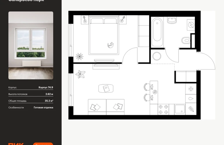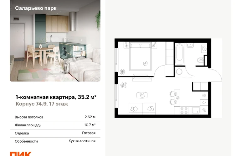 Продаётся 1-комн.квартира площадью 35.20 кв.м на 17 этаже 18 этажного дома (Корпус 74.9, секция 9) проекта ПИК Саларьево парк. Светлый просторный подъезд на уровне земли, функциональная планировка, большие окна, с отделкой. Жилой район «Саларьево парк» расположен в Новой Москве, в четырёх километрах от МКАД по Киевскому шоссе. Две станции метро: «Саларьево» и «Филатов луг», — находятся в пешей доступности от проекта. Дойти до них можно за 5–10 минут. В квартале уже создана качественная среда, где есть абсолютно всё для полноценной жизни, работы и отдыха. «Саларьево парк» — не просто квартал, а полноценный жилой район, который отличается разноплановой архитектурой. Над концепцией квартала работали несколько ведущих архитектурных бюро, которые стремились добиться разнообразия в фасадных решениях. Ярким примером такого подхода станут корпуса 82 и 83, которые относятся к «Серии плюс». Новый корпус 83 был создан по принципам южной архитектуры: расслабленный и лаконичный силуэт зданий, привлекающий к себе внимание. Архитектурная изюминка 83-го корпуса — террасы и фигурные балконы. Вместе с окнами и другими акцентными элементами они создают уникальный облик здания, отсылая нас к изысканной южной архитектуре. Все корпуса в квартале гармонично сочетаются, образуя единую городскую среду. Здесь приятно гулять и проводить время на улице всей семьёй. В «Саларьево парке» создана уникальная образовательная среда, включающая в себя шесть школ, рассчитанных на 6 250 учеников. Четыре из них уже открыты, их посещает 2 300 детей. Также на территории «Саларьево парка» находится 12 детских садов, один из которых с бассейном. Сейчас уже открыты 8 садов. В «Саларьево парке» открыта уникальная игровая площадка — PlayHub «Оригами». Здесь есть ручей, горка-труба и рельефные холмы. Взрослые смогут отдохнуть в уютном кафе, пока дети играют. Также на территории проекта есть SportHub — большая спортивная зона, разделённая по интересам и возрастам. Здесь можно заниматься разными видами спорта: футболом, баскетболом, волейболом и стритболом. Зимой центральную часть площадки превращают в каток. Во дворах-парках жилого квартала есть места для отдыха, детские и спортивные площадки. На первых этажах домов расположены магазины, кафе и полезные сервисы. Также вблизи проекта есть несколько масштабных торговых центров. До ТЦ «Саларис» пять минут пешком, до «Рио», Metro Cash & Carry и «Леруа Мерлен» — пять минут на автомобиле. Артикул - 1007461О застройщике