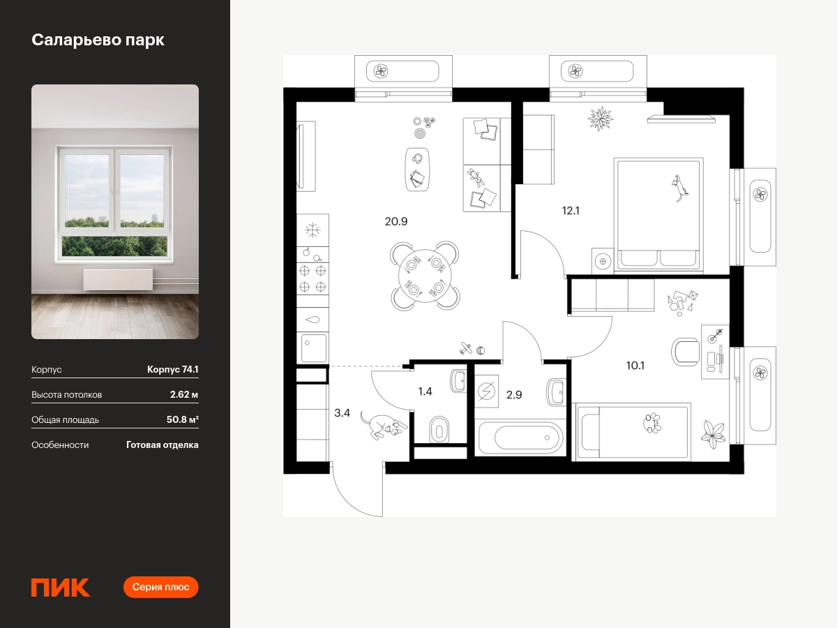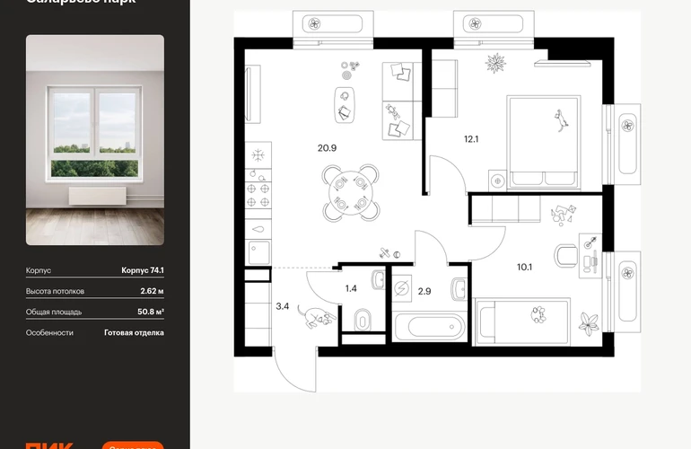 Продаётся 2-комн.квартира площадью 50.80 кв.м на 2 этаже 18 этажного дома (Корпус 74.1, секция 1) проекта ПИК Саларьево парк. Светлый просторный подъезд на уровне земли, функциональная планировка, большие окна, с отделкой. Жилой район «Саларьево парк» расположен в Новой Москве, в четырёх километрах от МКАД по Киевскому шоссе. Две станции метро: «Саларьево» и «Филатов луг», — находятся в пешей доступности от проекта. Дойти до них можно за 5–10 минут. В квартале уже создана качественная среда, где есть абсолютно всё для полноценной жизни, работы и отдыха. «Саларьево парк» — не просто квартал, а полноценный жилой район, который отличается разноплановой архитектурой. Над концепцией квартала работали несколько ведущих архитектурных бюро, которые стремились добиться разнообразия в фасадных решениях. Ярким примером такого подхода станут корпуса 82 и 83, которые относятся к «Серии плюс». Новый корпус 83 был создан по принципам южной архитектуры: расслабленный и лаконичный силуэт зданий, привлекающий к себе внимание. Архитектурная изюминка 83-го корпуса — террасы и фигурные балконы. Вместе с окнами и другими акцентными элементами они создают уникальный облик здания, отсылая нас к изысканной южной архитектуре. Все корпуса в квартале гармонично сочетаются, образуя единую городскую среду. Здесь приятно гулять и проводить время на улице всей семьёй. В «Саларьево парке» создана уникальная образовательная среда, включающая в себя шесть школ, рассчитанных на 6 250 учеников. Четыре из них уже открыты, их посещает 2 300 детей. Также на территории «Саларьево парка» находится 12 детских садов, один из которых с бассейном. Сейчас уже открыты 8 садов. В «Саларьево парке» открыта уникальная игровая площадка — PlayHub «Оригами». Здесь есть ручей, горка-труба и рельефные холмы. Взрослые смогут отдохнуть в уютном кафе, пока дети играют. Также на территории проекта есть SportHub — большая спортивная зона, разделённая по интересам и возрастам. Здесь можно заниматься разными видами спорта: футболом, баскетболом, волейболом и стритболом. Зимой центральную часть площадки превращают в каток. Во дворах-парках жилого квартала есть места для отдыха, детские и спортивные площадки. На первых этажах домов расположены магазины, кафе и полезные сервисы. Также вблизи проекта есть несколько масштабных торговых центров. До ТЦ «Саларис» пять минут пешком, до «Рио», Metro Cash & Carry и «Леруа Мерлен» — пять минут на автомобиле. Артикул - 1006032О застройщике