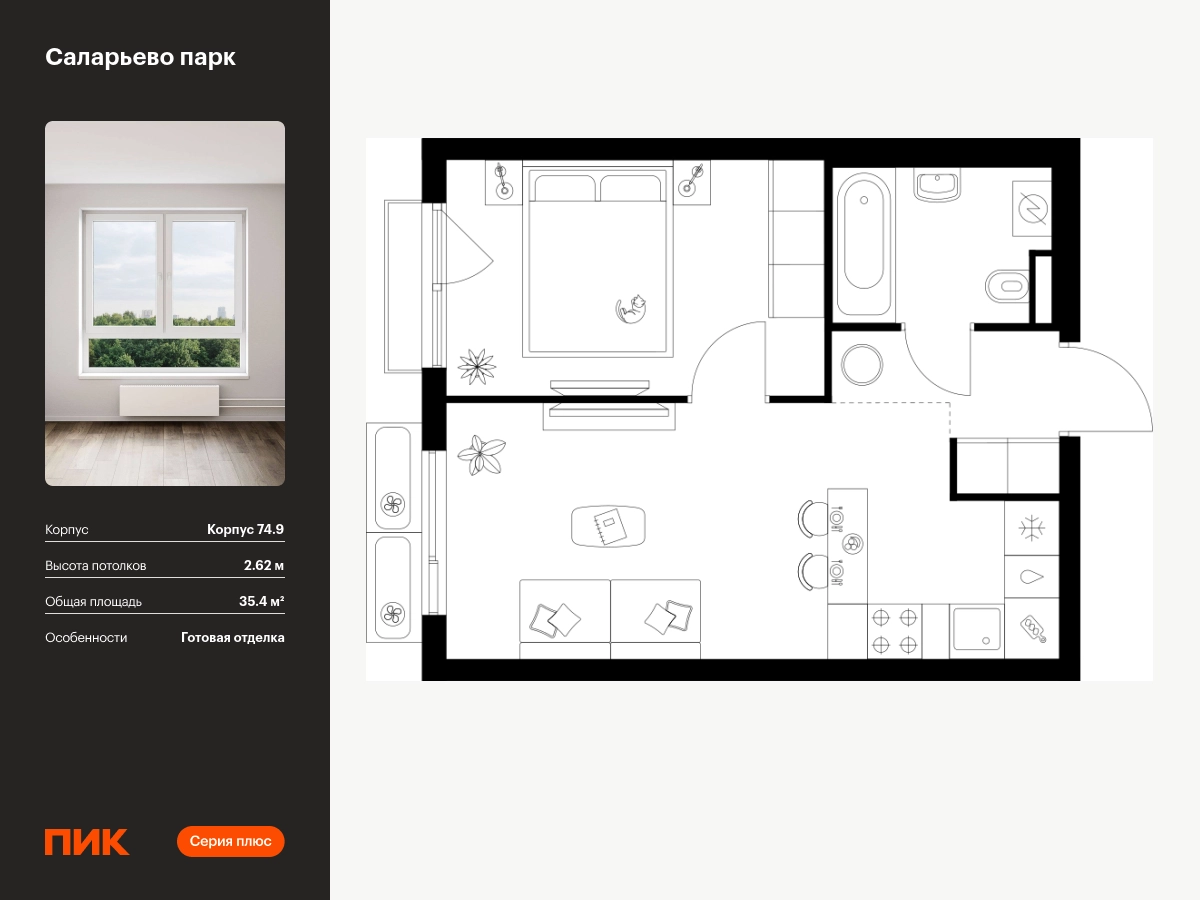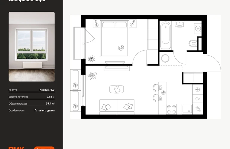 Продаётся 1-комн.квартира площадью 35.40 кв.м на 13 этаже 18 этажного дома (Корпус 74.9, секция 9) проекта ПИК Саларьево парк. Светлый просторный подъезд на уровне земли, функциональная планировка, большие окна, с отделкой. Жилой район «Саларьево парк» расположен в Новой Москве, в четырёх километрах от МКАД по Киевскому шоссе. Две станции метро: «Саларьево» и «Филатов луг» — находятся в пешей доступности от проекта. Дойти до них можно за 5–10 минут. В квартале уже создана качественная среда, где есть абсолютно всё для полноценной жизни, работы и отдыха. «Саларьево парк» — не просто квартал, а полноценный жилой район, который отличается разноплановой архитектурой. Над концепцией квартала работали несколько ведущих архитектурных бюро, которые стремились добиться разнообразия в фасадных решениях. Ярким примером такого подхода станет корпус 83, который относится к «Серии плюс». Новый корпус 83 был создан по принципам южной архитектуры: расслабленный и лаконичный силуэт зданий, привлекающий к себе внимание. Архитектурная изюминка 83-го корпуса — террасы и фигурные балконы. Вместе с окнами и другими акцентными элементами они создают уникальный облик здания, отсылая нас к изысканной южной архитектуре. Все корпуса в квартале гармонично сочетаются, образуя единую городскую среду. Здесь приятно гулять и проводить время на улице всей семьёй. В «Саларьево парке» создана уникальная образовательная среда, включающая в себя шесть школ, рассчитанных на 6 250 учеников. Две из них уже открыты, их посещает 2 300 детей. Также на территории «Саларьево парка» находится 12 детских садов, один из которых с бассейном. Сейчас уже открыты 7 садов. В «Саларьево парке» открыта уникальная игровая площадка — PlayHub «Оригами». Здесь есть ручей, горка-труба и рельефные холмы. Взрослые смогут отдохнуть в уютном кафе, пока дети играют. Также на территории проекта есть SportHub — большая спортивная зона, разделённая по интересам и возрастам. Здесь можно заниматься разными видами спорта: футболом, баскетболом, волейболом и стритболом. Зимой центральную часть площадки превращают в каток. Во дворах-парках жилого квартала есть места для отдыха, детские и спортивные площадки. На первых этажах домов расположены магазины, кафе и полезные сервисы. Также вблизи проекта есть несколько масштабных торговых центров. До ТЦ «Саларис» пять минут пешком, до «Рио», Metro Cash & Carry и «Лемана про» — пять минут на автомобиле. Артикул - 1007406О застройщике