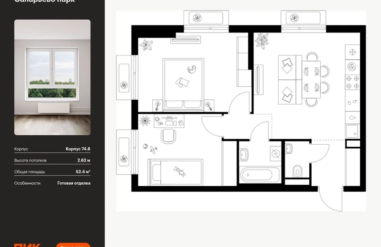 Продаётся 2-комн.квартира площадью 52.40 кв.м на 8 этаже 15 этажного дома (Корпус 74.8, секция 8) проекта ПИК Саларьево парк. Светлый просторный подъезд на уровне земли, функциональная планировка, большие окна, с отделкой. <br> <br>Жилой район «Саларьево парк» расположен в Новой Москве, в четырёх километрах от МКАД по Киевскому шоссе. Две станции метро: «Саларьево» и «Филатов луг» — находятся в пешей доступности от проекта. Дойти до них можно за 5–10 минут. В квартале уже создана качественная среда, где есть абсолютно всё для полноценной жизни, работы и отдыха. <br> <br>«Саларьево парк» — не просто квартал, а полноценный жилой район, который отличается разноплановой архитектурой. Над концепцией квартала работали несколько ведущих архитектурных бюро, которые стремились добиться разнообразия в фасадных решениях. Ярким примером такого подхода станет корпус 83, который относится к «Серии плюс». <br> <br>Новый корпус 83 был создан по принципам южной архитектуры: расслабленный и лаконичный силуэт зданий, привлекающий к себе внимание. Архитектурная изюминка 83-го корпуса — террасы и фигурные балконы. Вместе с окнами и другими акцентными элементами они создают уникальный облик здания, отсылая нас к изысканной южной архитектуре. <br> <br>Все корпуса в квартале гармонично сочетаются, образуя единую городскую среду. Здесь приятно гулять и проводить время на улице всей семьёй. <br> <br>В «Саларьево парке» создана уникальная образовательная среда, включающая в себя шесть школ, рассчитанных на 6 250 учеников. Две из них уже открыты, их посещает 2 300 детей. Также на территории «Саларьево парка» находится 12 детских садов, один из которых с бассейном. Сейчас уже открыты 7 садов. <br> <br>В «Саларьево парке» открыта уникальная игровая площадка — PlayHub «Оригами». Здесь есть ручей, горка-труба и рельефные холмы. Взрослые смогут отдохнуть в уютном кафе, пока дети играют. Также на территории проекта есть SportHub — большая спортивная зона, разделённая по интересам и возрастам. Здесь можно заниматься разными видами спорта: футболом, баскетболом, волейболом и стритболом. Зимой центральную часть площадки превращают в каток. <br> <br>Во дворах-парках жилого квартала есть места для отдыха, детские и спортивные площадки. На первых этажах домов расположены магазины, кафе и полезные сервисы. Также вблизи проекта есть несколько масштабных торговых центров. До ТЦ «Саларис» пять минут пешком, до «Рио», Metro Cash & Carry и «Лемана про» — пять минут на автомобиле. Артикул - 1007207О застройщике