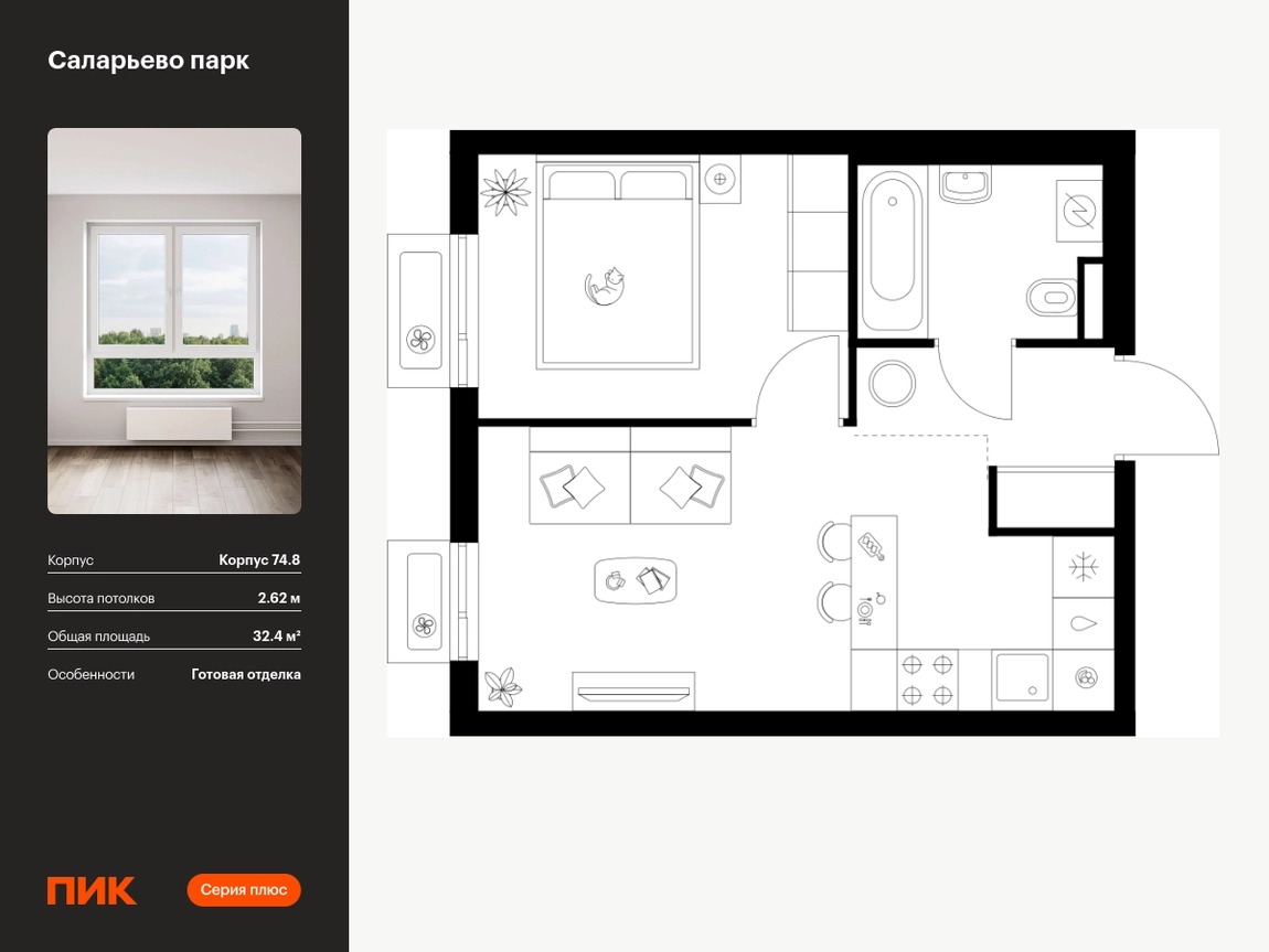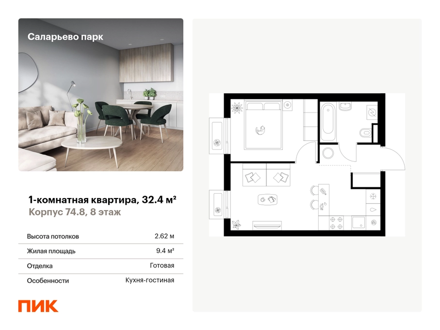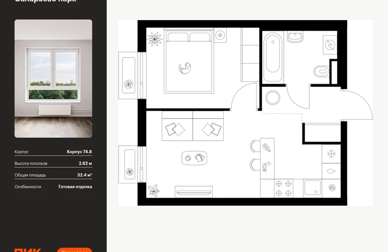 Продаётся 1-комн.квартира площадью 32.40 кв.м на 8 этаже 15 этажного дома (Корпус 74.8, секция 8) проекта ПИК Саларьево парк. Светлый просторный подъезд на уровне земли, функциональная планировка, большие окна, с отделкой. Жилой район «Саларьево парк» расположен в Новой Москве, в четырёх километрах от МКАД по Киевскому шоссе. Две станции метро: «Саларьево» и «Филатов луг» — находятся в пешей доступности от проекта. Дойти до них можно за 5–10 минут. В квартале уже создана качественная среда, где есть абсолютно всё для полноценной жизни, работы и отдыха. «Саларьево парк» — не просто квартал, а полноценный жилой район, который отличается разноплановой архитектурой. Над концепцией квартала работали несколько ведущих архитектурных бюро, которые стремились добиться разнообразия в фасадных решениях. Ярким примером такого подхода станет корпус 83, который относится к «Серии плюс». Новый корпус 83 был создан по принципам южной архитектуры: расслабленный и лаконичный силуэт зданий, привлекающий к себе внимание. Архитектурная изюминка 83-го корпуса — террасы и фигурные балконы. Вместе с окнами и другими акцентными элементами они создают уникальный облик здания, отсылая нас к изысканной южной архитектуре. Все корпуса в квартале гармонично сочетаются, образуя единую городскую среду. Здесь приятно гулять и проводить время на улице всей семьёй. В «Саларьево парке» создана уникальная образовательная среда, включающая в себя шесть школ, рассчитанных на 6 250 учеников. Две из них уже открыты, их посещает 2 300 детей. Также на территории «Саларьево парка» находится 12 детских садов, один из которых с бассейном. Сейчас уже открыты 7 садов. В «Саларьево парке» открыта уникальная игровая площадка — PlayHub «Оригами». Здесь есть ручей, горка-труба и рельефные холмы. Взрослые смогут отдохнуть в уютном кафе, пока дети играют. Также на территории проекта есть SportHub — большая спортивная зона, разделённая по интересам и возрастам. Здесь можно заниматься разными видами спорта: футболом, баскетболом, волейболом и стритболом. Зимой центральную часть площадки превращают в каток. Во дворах-парках жилого квартала есть места для отдыха, детские и спортивные площадки. На первых этажах домов расположены магазины, кафе и полезные сервисы. Также вблизи проекта есть несколько масштабных торговых центров. До ТЦ «Саларис» пять минут пешком, до «Рио», Metro Cash & Carry и «Лемана про» — пять минут на автомобиле. Артикул - 1007205О застройщике