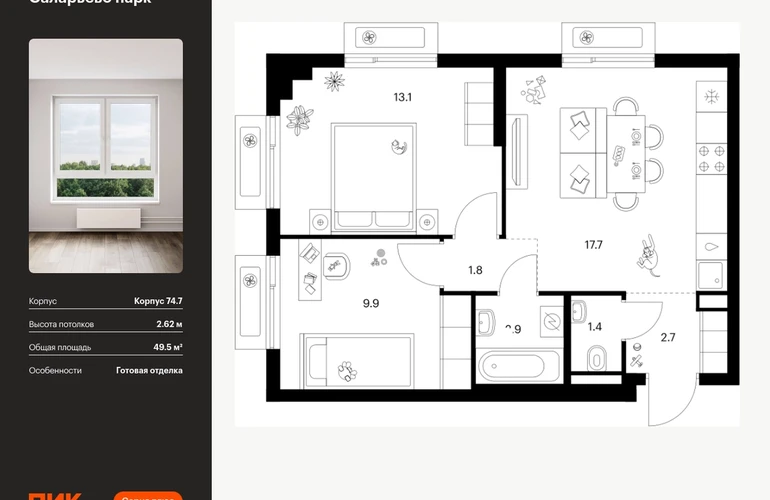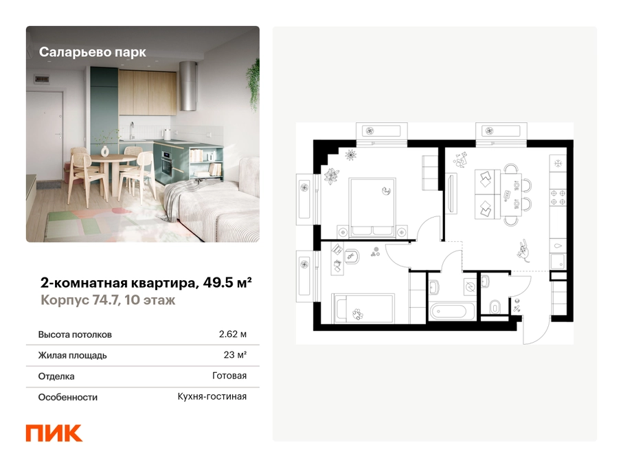 Продаётся 2-комн.квартира площадью 49.50 кв.м на 10 этаже 16 этажного дома (Корпус 74.7, секция 7) проекта ПИК Саларьево парк. Светлый просторный подъезд на уровне земли, функциональная планировка, большие окна, с отделкой. Жилой район «Саларьево парк» расположен в Новой Москве, в четырёх километрах от МКАД по Киевскому шоссе. Две станции метро: «Саларьево» и «Филатов луг», — находятся в пешей доступности от проекта. Дойти до них можно за 5–10 минут. В квартале уже создана качественная среда, где есть абсолютно всё для полноценной жизни, работы и отдыха. «Саларьево парк» — не просто квартал, а полноценный жилой район, который отличается разноплановой архитектурой. Над концепцией квартала работали несколько ведущих архитектурных бюро, которые стремились добиться разнообразия в фасадных решениях. Ярким примером такого подхода станут корпуса 82 и 83, которые относятся к «Серии плюс». Новый корпус 83 был создан по принципам южной архитектуры: расслабленный и лаконичный силуэт зданий, привлекающий к себе внимание. Архитектурная изюминка 83-го корпуса — террасы и фигурные балконы. Вместе с окнами и другими акцентными элементами они создают уникальный облик здания, отсылая нас к изысканной южной архитектуре. Все корпуса в квартале гармонично сочетаются, образуя единую городскую среду. Здесь приятно гулять и проводить время на улице всей семьёй. В «Саларьево парке» создана уникальная образовательная среда, включающая в себя шесть школ, рассчитанных на 6 250 учеников. Четыре из них уже открыты, их посещает 2 300 детей. Также на территории «Саларьево парка» находится 12 детских садов, один из которых с бассейном. Сейчас уже открыты 8 садов. В «Саларьево парке» открыта уникальная игровая площадка — PlayHub «Оригами». Здесь есть ручей, горка-труба и рельефные холмы. Взрослые смогут отдохнуть в уютном кафе, пока дети играют. Также на территории проекта есть SportHub — большая спортивная зона, разделённая по интересам и возрастам. Здесь можно заниматься разными видами спорта: футболом, баскетболом, волейболом и стритболом. Зимой центральную часть площадки превращают в каток. Во дворах-парках жилого квартала есть места для отдыха, детские и спортивные площадки. На первых этажах домов расположены магазины, кафе и полезные сервисы. Также вблизи проекта есть несколько масштабных торговых центров. До ТЦ «Саларис» пять минут пешком, до «Рио», Metro Cash & Carry и «Леруа Мерлен» — пять минут на автомобиле. Артикул - 1007086О застройщике
