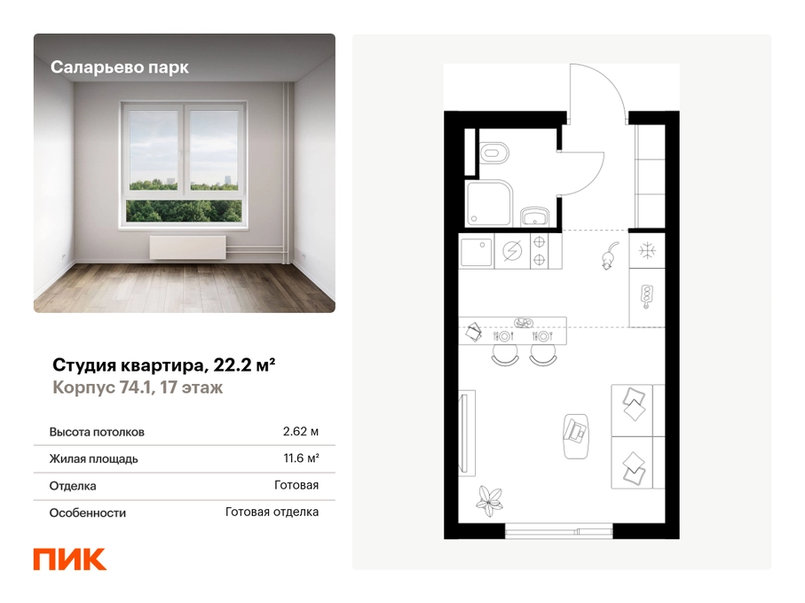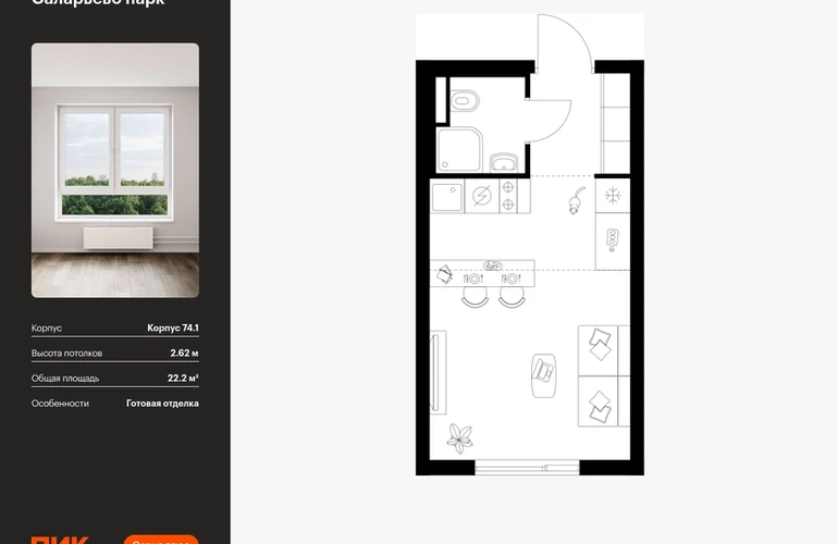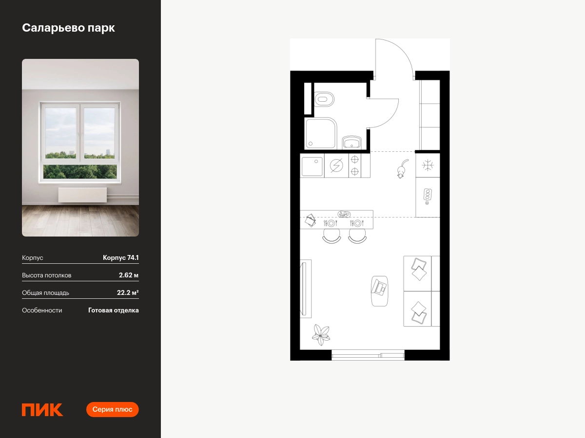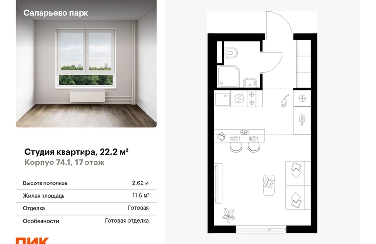 Продаётся квартира-студия площадью 22.20 кв.м на 17 этаже 18 этажного дома (Корпус 74.1, секция 1) проекта ПИК Саларьево парк. Светлый просторный подъезд на уровне земли, функциональная планировка, большие окна, с отделкой. Жилой район «Саларьево парк» расположен в Новой Москве, в четырёх километрах от МКАД по Киевскому шоссе. Две станции метро: «Саларьево» и «Филатов луг», — находятся в пешей доступности от проекта. Дойти до них можно за 5–10 минут. В квартале уже создана качественная среда, где есть абсолютно всё для полноценной жизни, работы и отдыха. «Саларьево парк» — не просто квартал, а полноценный жилой район, который отличается разноплановой архитектурой. Над концепцией квартала работали несколько ведущих архитектурных бюро, которые стремились добиться разнообразия в фасадных решениях. Ярким примером такого подхода станут корпуса 82 и 83, которые относятся к «Серии плюс». Новый корпус 83 был создан по принципам южной архитектуры: расслабленный и лаконичный силуэт зданий, привлекающий к себе внимание. Архитектурная изюминка 83-го корпуса — террасы и фигурные балконы. Вместе с окнами и другими акцентными элементами они создают уникальный облик здания, отсылая нас к изысканной южной архитектуре. Все корпуса в квартале гармонично сочетаются, образуя единую городскую среду. Здесь приятно гулять и проводить время на улице всей семьёй. В «Саларьево парке» создана уникальная образовательная среда, включающая в себя шесть школ, рассчитанных на 6 250 учеников. Четыре из них уже открыты, их посещает 2 300 детей. Также на территории «Саларьево парка» находится 12 детских садов, один из которых с бассейном. Сейчас уже открыты 8 садов. В «Саларьево парке» открыта уникальная игровая площадка — PlayHub «Оригами». Здесь есть ручей, горка-труба и рельефные холмы. Взрослые смогут отдохнуть в уютном кафе, пока дети играют. Также на территории проекта есть SportHub — большая спортивная зона, разделённая по интересам и возрастам. Здесь можно заниматься разными видами спорта: футболом, баскетболом, волейболом и стритболом. Зимой центральную часть площадки превращают в каток. Во дворах-парках жилого квартала есть места для отдыха, детские и спортивные площадки. На первых этажах домов расположены магазины, кафе и полезные сервисы. Также вблизи проекта есть несколько масштабных торговых центров. До ТЦ «Саларис» пять минут пешком, до «Рио», Metro Cash & Carry и «Леруа Мерлен» — пять минут на автомобиле. Артикул - 1006246О застройщике