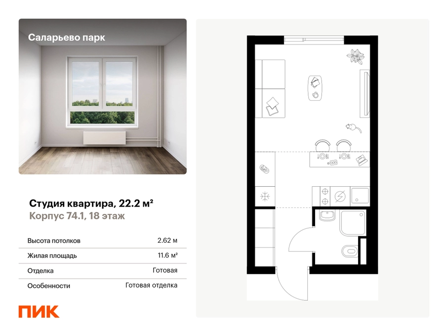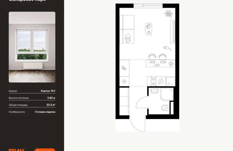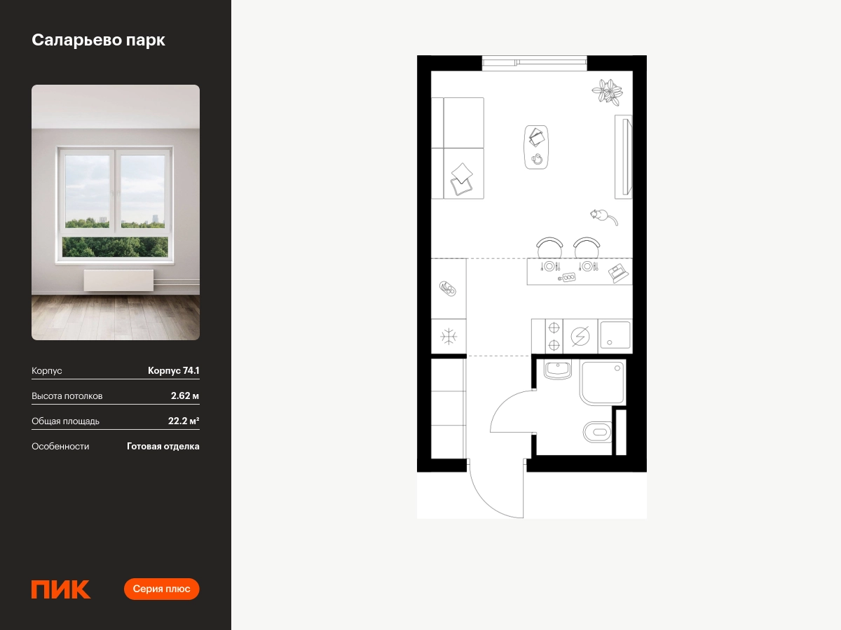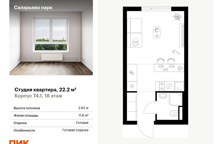 Продаётся квартира-студия площадью 22.20 кв.м на 18 этаже 18 этажного дома (Корпус 74.1, секция 1) проекта ПИК Саларьево парк. Светлый просторный подъезд на уровне земли, функциональная планировка, большие окна, с отделкой. Жилой район «Саларьево парк» расположен в Новой Москве, в четырёх километрах от МКАД по Киевскому шоссе. Две станции метро: «Саларьево» и «Филатов луг», — находятся в пешей доступности от проекта. Дойти до них можно за 5–10 минут. В квартале уже создана качественная среда, где есть абсолютно всё для полноценной жизни, работы и отдыха. «Саларьево парк» — не просто квартал, а полноценный жилой район, который отличается разноплановой архитектурой. Над концепцией квартала работали несколько ведущих архитектурных бюро, которые стремились добиться разнообразия в фасадных решениях. Ярким примером такого подхода станут корпуса 82 и 83, которые относятся к «Серии плюс». Новый корпус 83 был создан по принципам южной архитектуры: расслабленный и лаконичный силуэт зданий, привлекающий к себе внимание. Архитектурная изюминка 83-го корпуса — террасы и фигурные балконы. Вместе с окнами и другими акцентными элементами они создают уникальный облик здания, отсылая нас к изысканной южной архитектуре. Все корпуса в квартале гармонично сочетаются, образуя единую городскую среду. Здесь приятно гулять и проводить время на улице всей семьёй. В «Саларьево парке» создана уникальная образовательная среда, включающая в себя шесть школ, рассчитанных на 6 250 учеников. Четыре из них уже открыты, их посещает 2 300 детей. Также на территории «Саларьево парка» находится 12 детских садов, один из которых с бассейном. Сейчас уже открыты 8 садов. В «Саларьево парке» открыта уникальная игровая площадка — PlayHub «Оригами». Здесь есть ручей, горка-труба и рельефные холмы. Взрослые смогут отдохнуть в уютном кафе, пока дети играют. Также на территории проекта есть SportHub — большая спортивная зона, разделённая по интересам и возрастам. Здесь можно заниматься разными видами спорта: футболом, баскетболом, волейболом и стритболом. Зимой центральную часть площадки превращают в каток. Во дворах-парках жилого квартала есть места для отдыха, детские и спортивные площадки. На первых этажах домов расположены магазины, кафе и полезные сервисы. Также вблизи проекта есть несколько масштабных торговых центров. До ТЦ «Саларис» пять минут пешком, до «Рио», Metro Cash & Carry и «Леруа Мерлен» — пять минут на автомобиле. Артикул - 1006267О застройщике