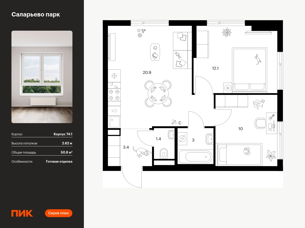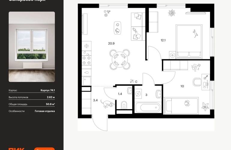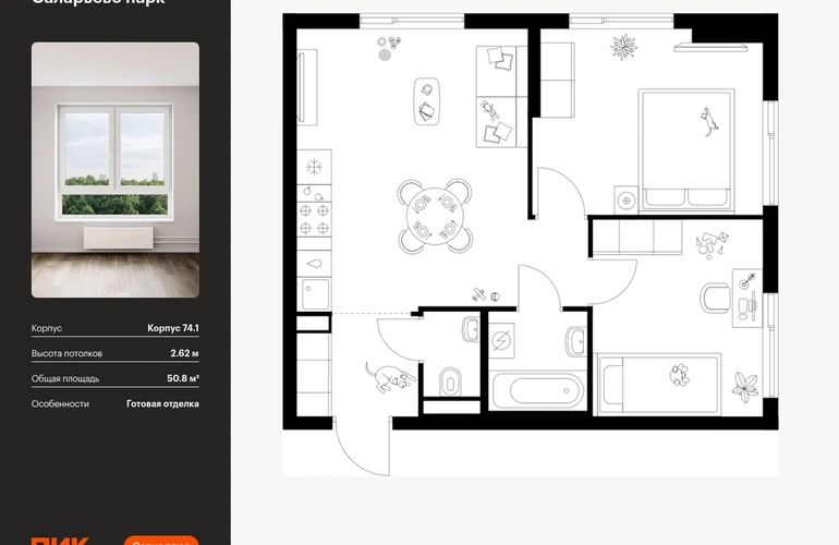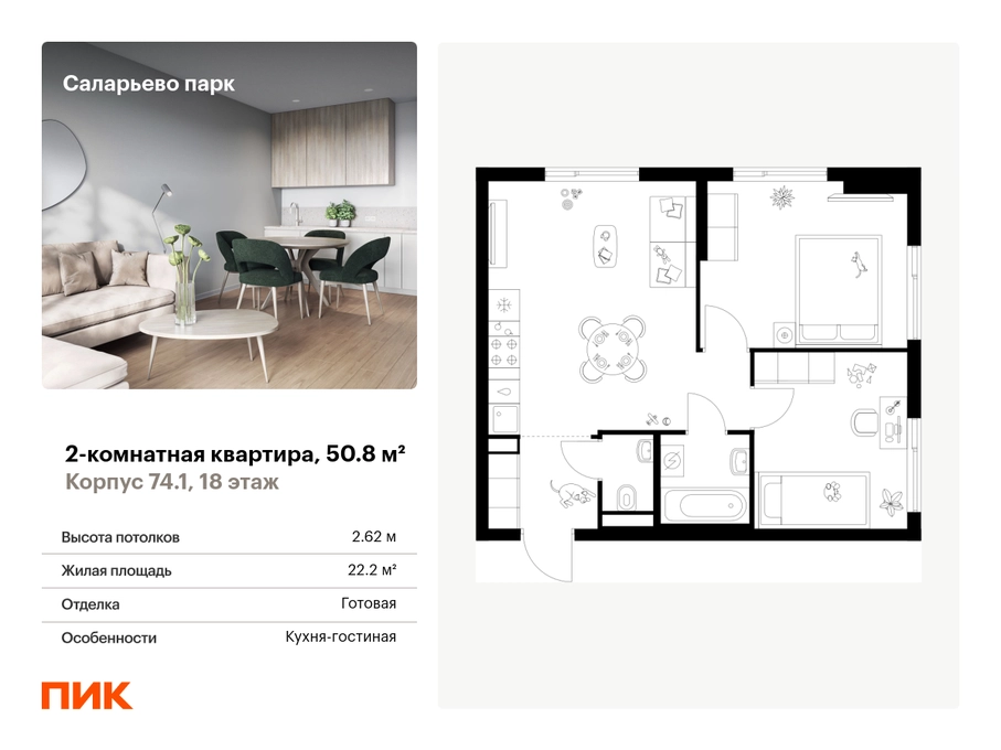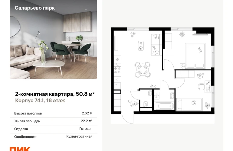 Продаётся 2-комн.квартира площадью 50.80 кв.м на 18 этаже 18 этажного дома (Корпус 74.1, секция 1) проекта ПИК Саларьево парк. Светлый просторный подъезд на уровне земли, функциональная планировка, большие окна, с отделкой. Жилой район «Саларьево парк» расположен в Новой Москве, в четырёх километрах от МКАД по Киевскому шоссе. Две станции метро: «Саларьево» и «Филатов луг», — находятся в пешей доступности от проекта. Дойти до них можно за 5–10 минут. В квартале уже создана качественная среда, где есть абсолютно всё для полноценной жизни, работы и отдыха. «Саларьево парк» — не просто квартал, а полноценный жилой район, который отличается разноплановой архитектурой. Над концепцией квартала работали несколько ведущих архитектурных бюро, которые стремились добиться разнообразия в фасадных решениях. Ярким примером такого подхода станут корпуса 82 и 83, которые относятся к «Серии плюс». Новый корпус 83 был создан по принципам южной архитектуры: расслабленный и лаконичный силуэт зданий, привлекающий к себе внимание. Архитектурная изюминка 83-го корпуса — террасы и фигурные балконы. Вместе с окнами и другими акцентными элементами они создают уникальный облик здания, отсылая нас к изысканной южной архитектуре. Все корпуса в квартале гармонично сочетаются, образуя единую городскую среду. Здесь приятно гулять и проводить время на улице всей семьёй. В «Саларьево парке» создана уникальная образовательная среда, включающая в себя шесть школ, рассчитанных на 6 250 учеников. Четыре из них уже открыты, их посещает 2 300 детей. Также на территории «Саларьево парка» находится 12 детских садов, один из которых с бассейном. Сейчас уже открыты 8 садов. В «Саларьево парке» открыта уникальная игровая площадка — PlayHub «Оригами». Здесь есть ручей, горка-труба и рельефные холмы. Взрослые смогут отдохнуть в уютном кафе, пока дети играют. Также на территории проекта есть SportHub — большая спортивная зона, разделённая по интересам и возрастам. Здесь можно заниматься разными видами спорта: футболом, баскетболом, волейболом и стритболом. Зимой центральную часть площадки превращают в каток. Во дворах-парках жилого квартала есть места для отдыха, детские и спортивные площадки. На первых этажах домов расположены магазины, кафе и полезные сервисы. Также вблизи проекта есть несколько масштабных торговых центров. До ТЦ «Саларис» пять минут пешком, до «Рио», Metro Cash & Carry и «Леруа Мерлен» — пять минут на автомобиле. Артикул - 1006270О застройщике