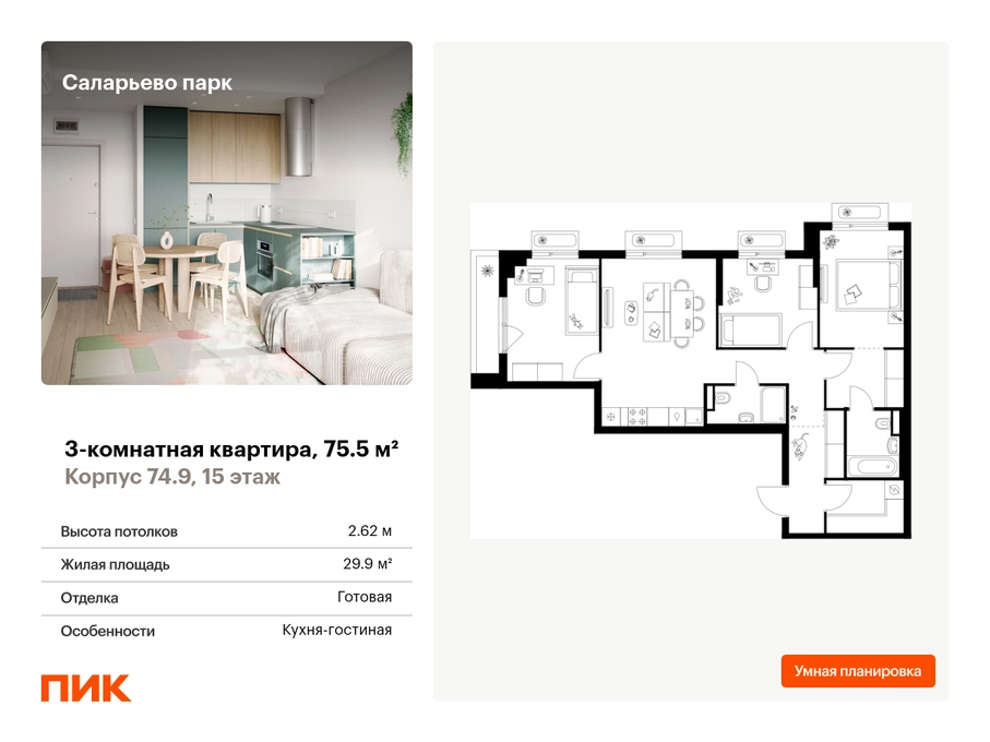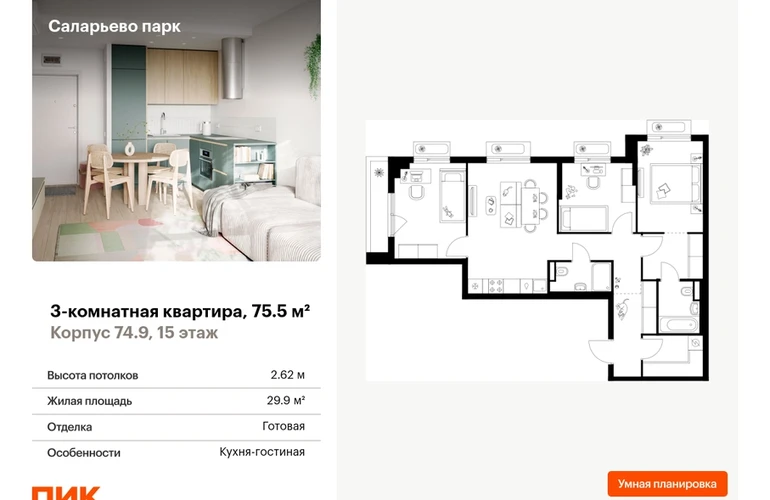 Продаётся 3-комн.квартира площадью 75.50 кв.м на 15 этаже 18 этажного дома (Корпус 74.9, секция 9) проекта ПИК Саларьево парк. Светлый просторный подъезд на уровне земли, функциональная планировка, большие окна, с отделкой. Жилой район «Саларьево парк» расположен в Новой Москве, в четырёх километрах от МКАД по Киевскому шоссе. Две станции метро: «Саларьево» и «Филатов луг» — находятся в пешей доступности от проекта. Дойти до них можно за 5–10 минут. В квартале уже создана качественная среда, где есть абсолютно всё для полноценной жизни, работы и отдыха. «Саларьево парк» — не просто квартал, а полноценный жилой район, который отличается разноплановой архитектурой. Над концепцией квартала работали несколько ведущих архитектурных бюро, которые стремились добиться разнообразия в фасадных решениях. Ярким примером такого подхода станет корпус 83, который относится к «Серии плюс». Новый корпус 83 был создан по принципам южной архитектуры: расслабленный и лаконичный силуэт зданий, привлекающий к себе внимание. Архитектурная изюминка 83-го корпуса — террасы и фигурные балконы. Вместе с окнами и другими акцентными элементами они создают уникальный облик здания, отсылая нас к изысканной южной архитектуре. Все корпуса в квартале гармонично сочетаются, образуя единую городскую среду. Здесь приятно гулять и проводить время на улице всей семьёй. В «Саларьево парке» создана уникальная образовательная среда, включающая в себя шесть школ, рассчитанных на 6 250 учеников. Две из них уже открыты, их посещает 2 300 детей. Также на территории «Саларьево парка» находится 12 детских садов, один из которых с бассейном. Сейчас уже открыты 7 садов. В «Саларьево парке» открыта уникальная игровая площадка — PlayHub «Оригами». Здесь есть ручей, горка-труба и рельефные холмы. Взрослые смогут отдохнуть в уютном кафе, пока дети играют. Также на территории проекта есть SportHub — большая спортивная зона, разделённая по интересам и возрастам. Здесь можно заниматься разными видами спорта: футболом, баскетболом, волейболом и стритболом. Зимой центральную часть площадки превращают в каток. Во дворах-парках жилого квартала есть места для отдыха, детские и спортивные площадки. На первых этажах домов расположены магазины, кафе и полезные сервисы. Также вблизи проекта есть несколько масштабных торговых центров. До ТЦ «Саларис» пять минут пешком, до «Рио», Metro Cash & Carry и «Лемана про» — пять минут на автомобиле. Артикул - 1007438О застройщике